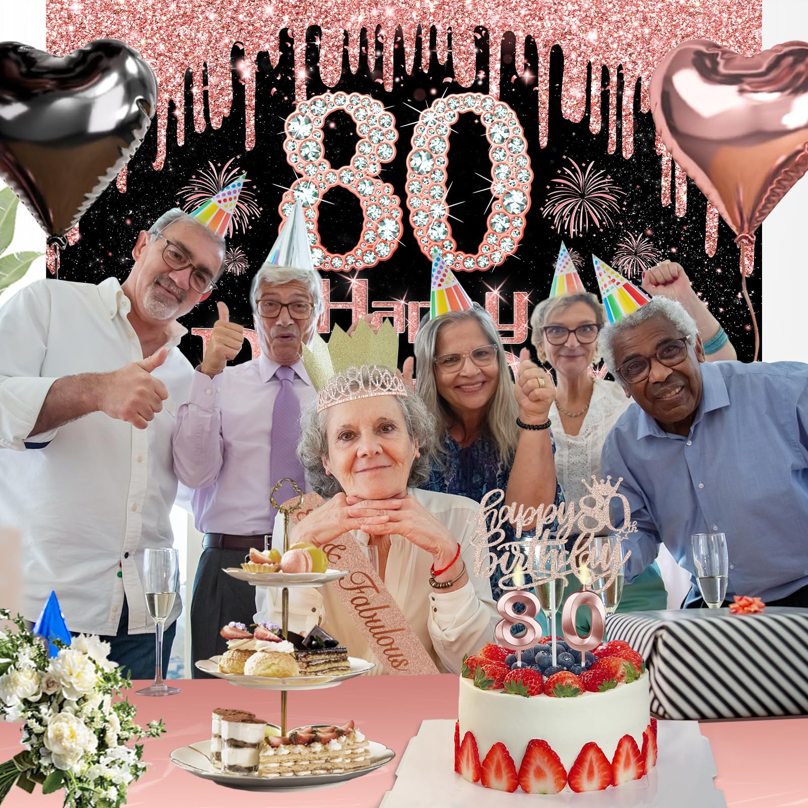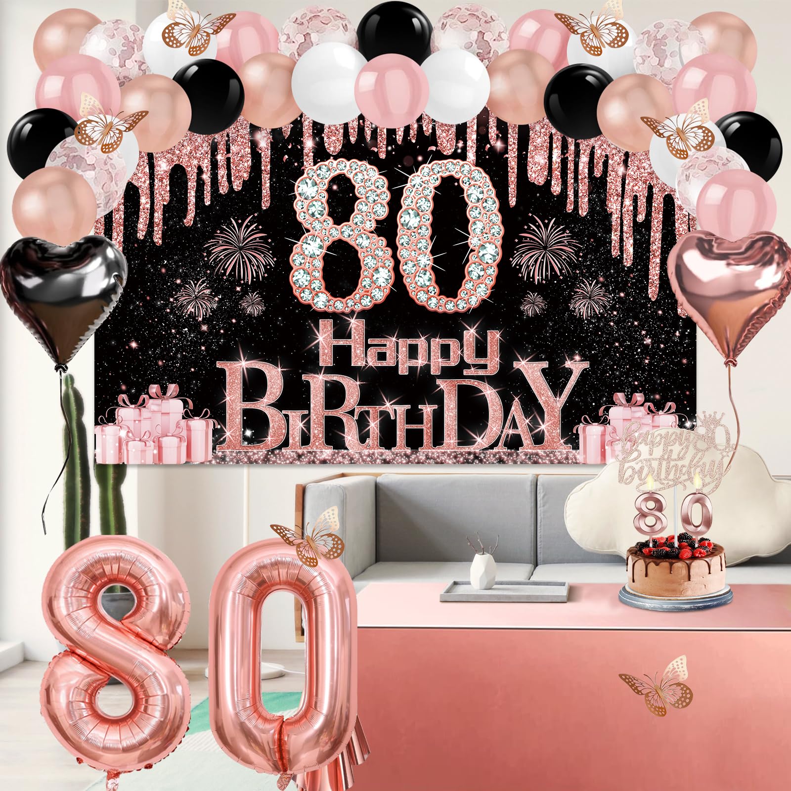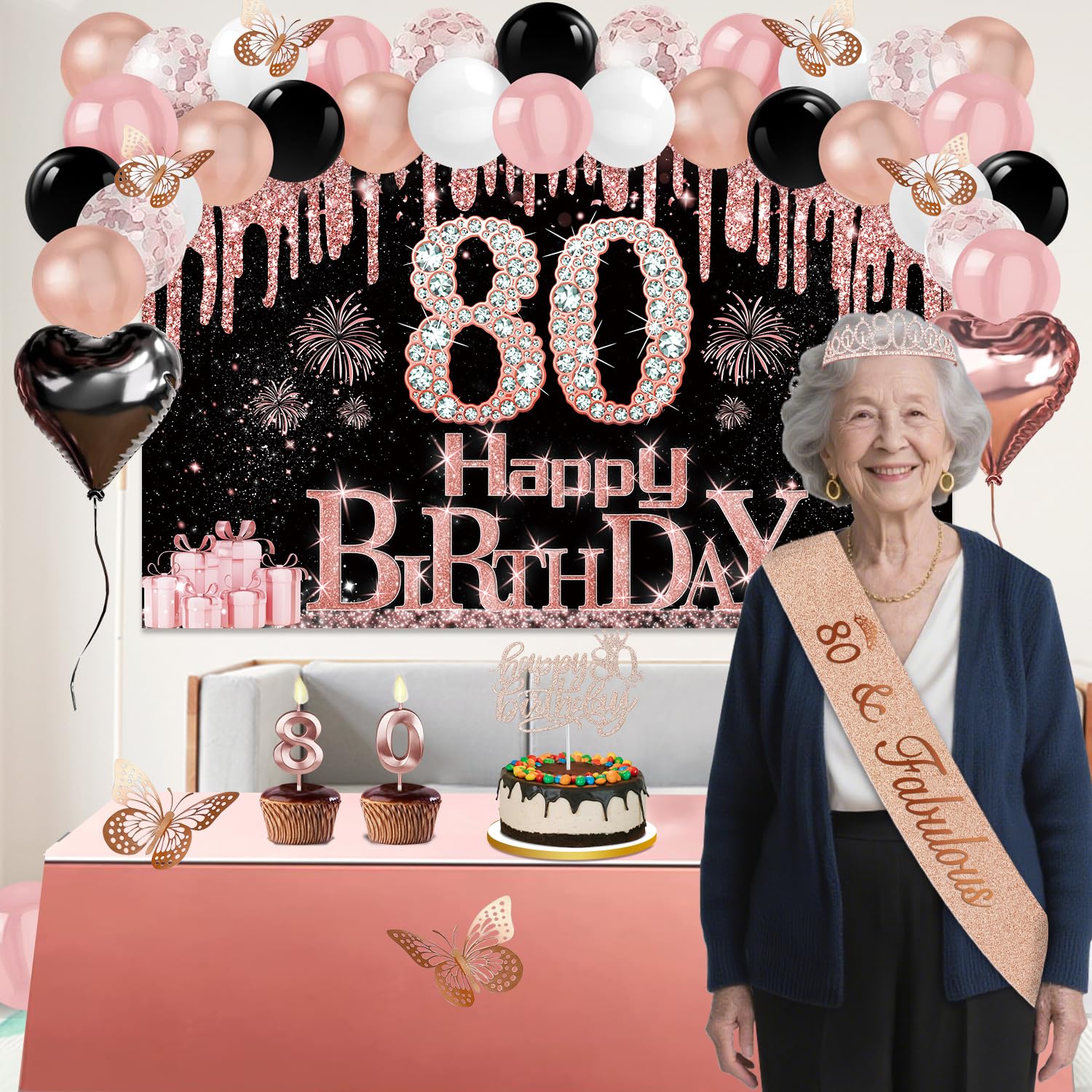 80th Birthday Decorations: Package coming with 80th Birthday Banner *1pc, 80th Birthday Tiara *1pc, 80th Birthday Sash *1pc, 80th Birthday Cake Topper *1pc, 80th Birthday Candles *1set, Rose Gold Butterflies *8pcs, Number 80th Birthday Balloons *1set, Love-Shape Balloons *2pcs, Latex Balloons * 30pcs, and Rose Gold Tablecloth *1pc. This complete 49pcs 80th birthday party decoration pack is the best way to meet different decorating needs