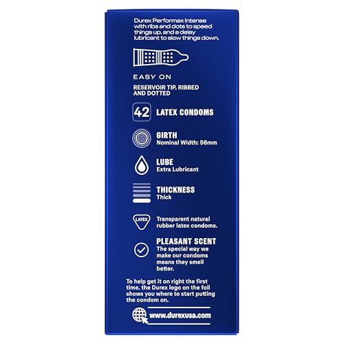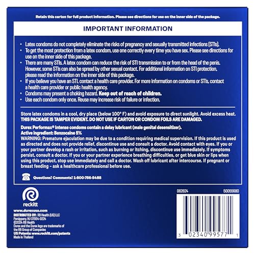 Durex Performax Intense Condoms are delay condoms for men are made with a desensitizing lubricant to help him last longer and are textured and designed to help speed her up. Condoms contain climax control lube on the inside made with the active ingredient: Benzocaine (5 percent) for him and have a ribbed and dotted texture designed for added sensation and are lubricated on the outside to intensify sensation for her. Regular fit condoms, our standard girth, designed for a close and comfortable fit, with a nominal width of 56mm. Durex is the world's #1 condom brand* trusted over 80 years. Each Durex condom for men is 100 percent electronically tested for strength, flexibility and reliability and features a pleasant scent. Our products are delivered in discreet packaging with no indication of parcel contents. For maximum benefit, carefully follow the condom instructions on the inner side of this package. It helps provide protection against pregnancy, HIV/AIDS and other sexually transmitted infections (STIs). *Based on global Nielsen sales data of individual foil condoms for the 12 months ending March 2025