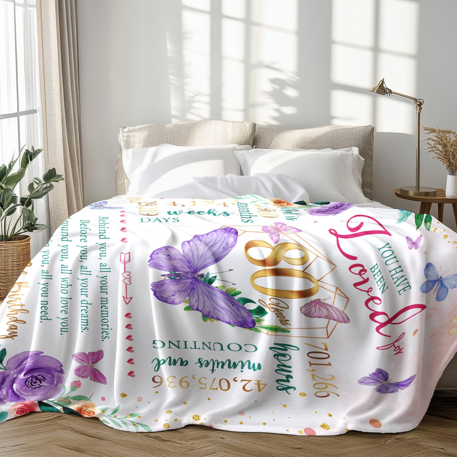 VERSATILE BLANKET: Gifts for women's 80th birthdays, unique butterfly blankets can provide warmth in different seasons. This birthday throw blanket will be a perfect indoor decoration for your home. Perfect for napping, watching TV, reading, and snuggling, for a cozy and lightweight travel companion, you can also take it when you go outdoors.