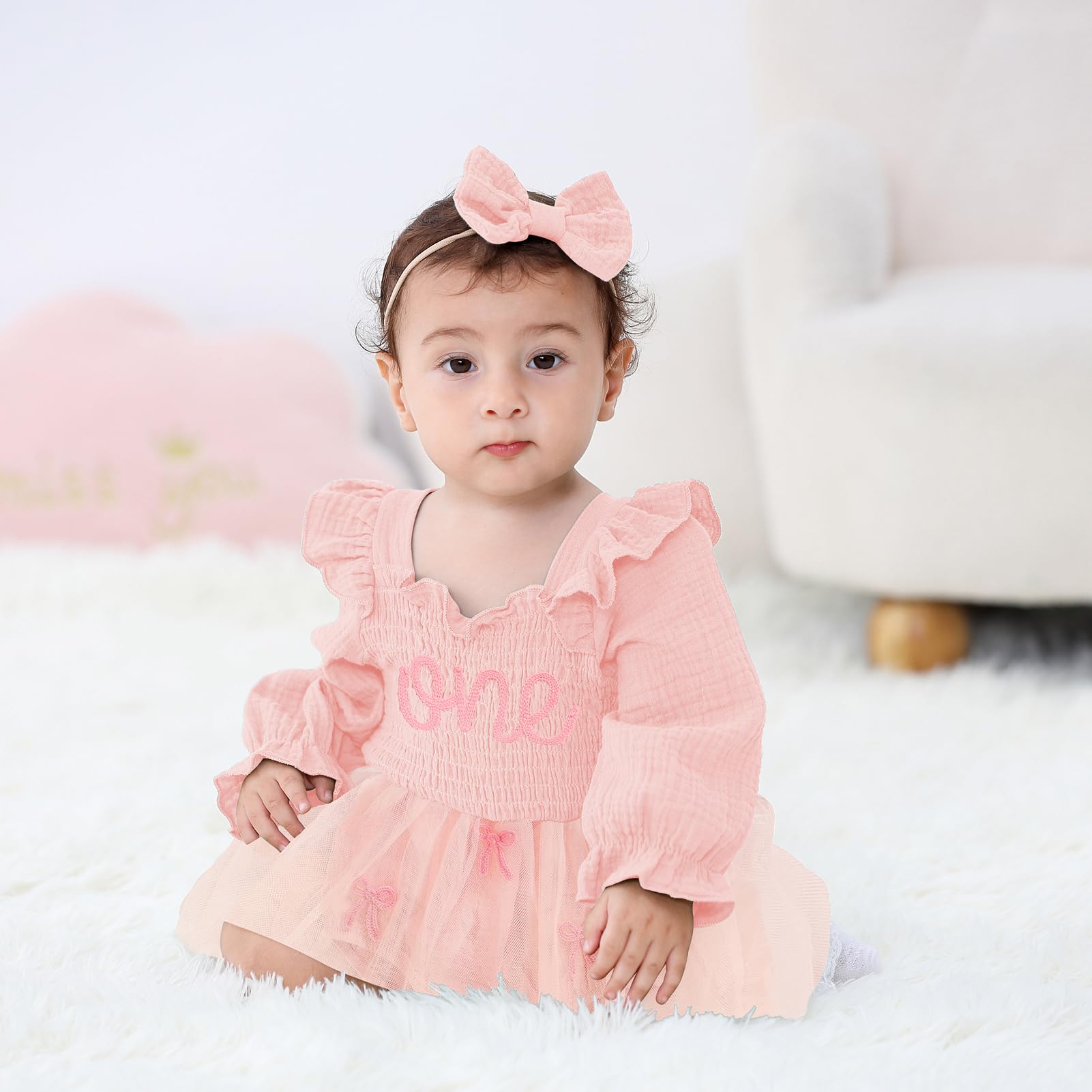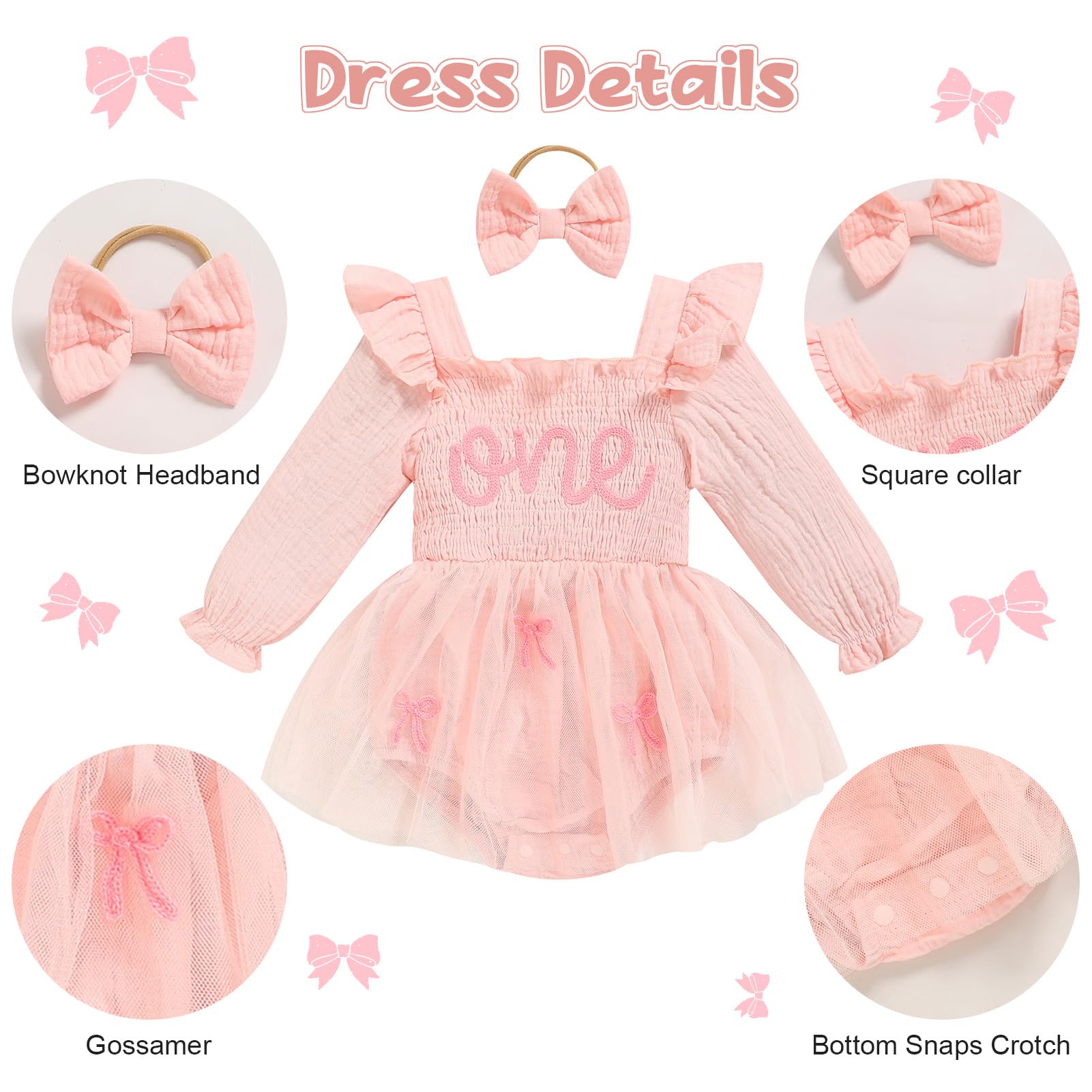 Design: Newborn baby girl playwear romper dress with long sleeve, solid color, multi-layered tulle, Snap leg openings for easy diaper changes, easier morning for novice mother.Cute princess 1st birthday outfit, fashionable and adorable embroidery ONE printed themed birthday clothes perfect for creating beautiful memory of her first birthday.
