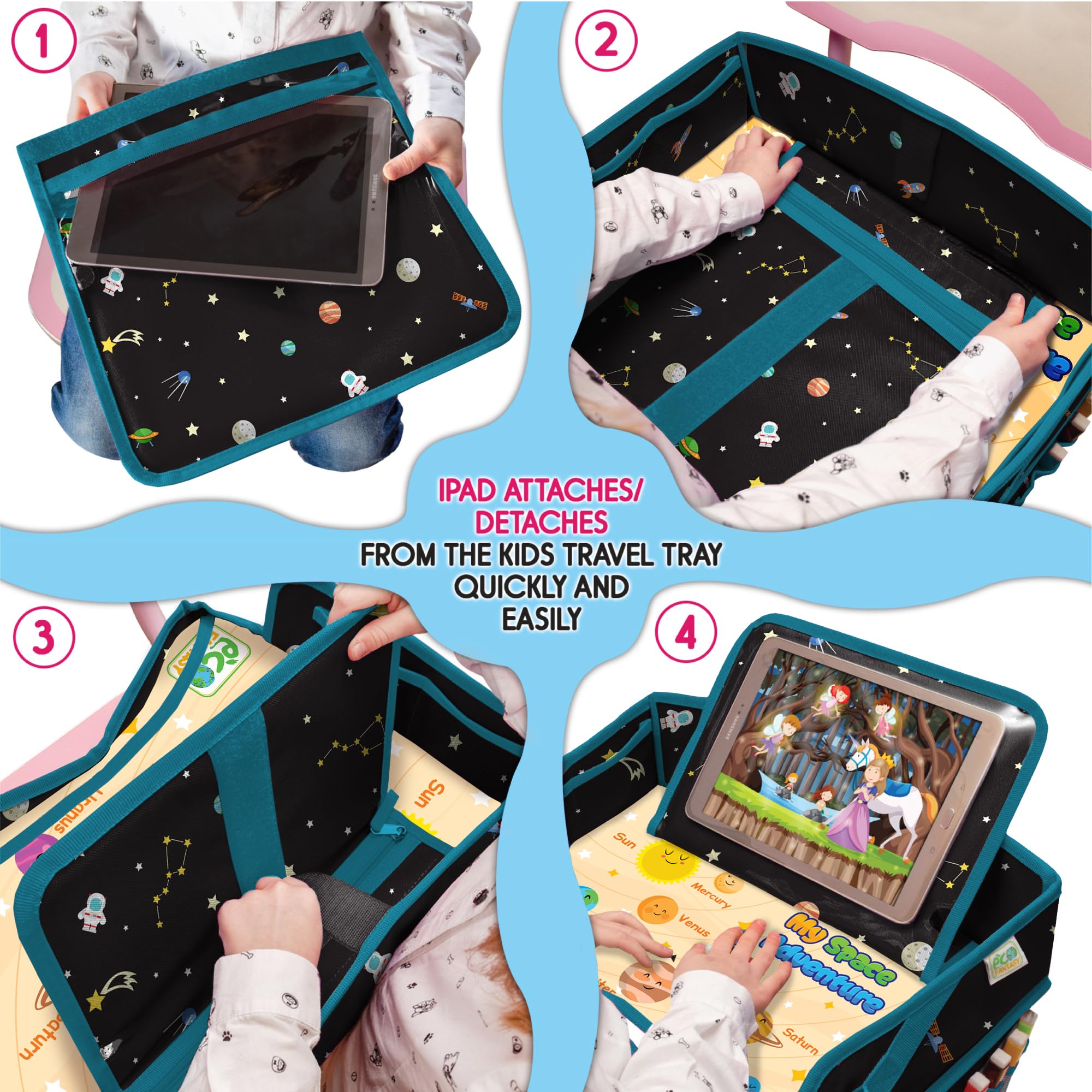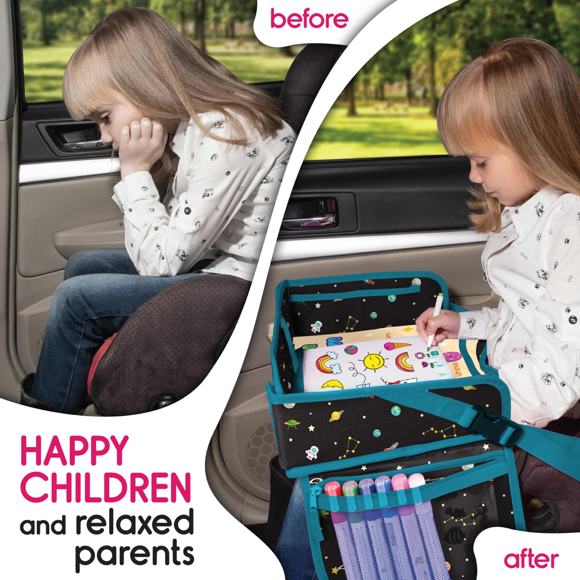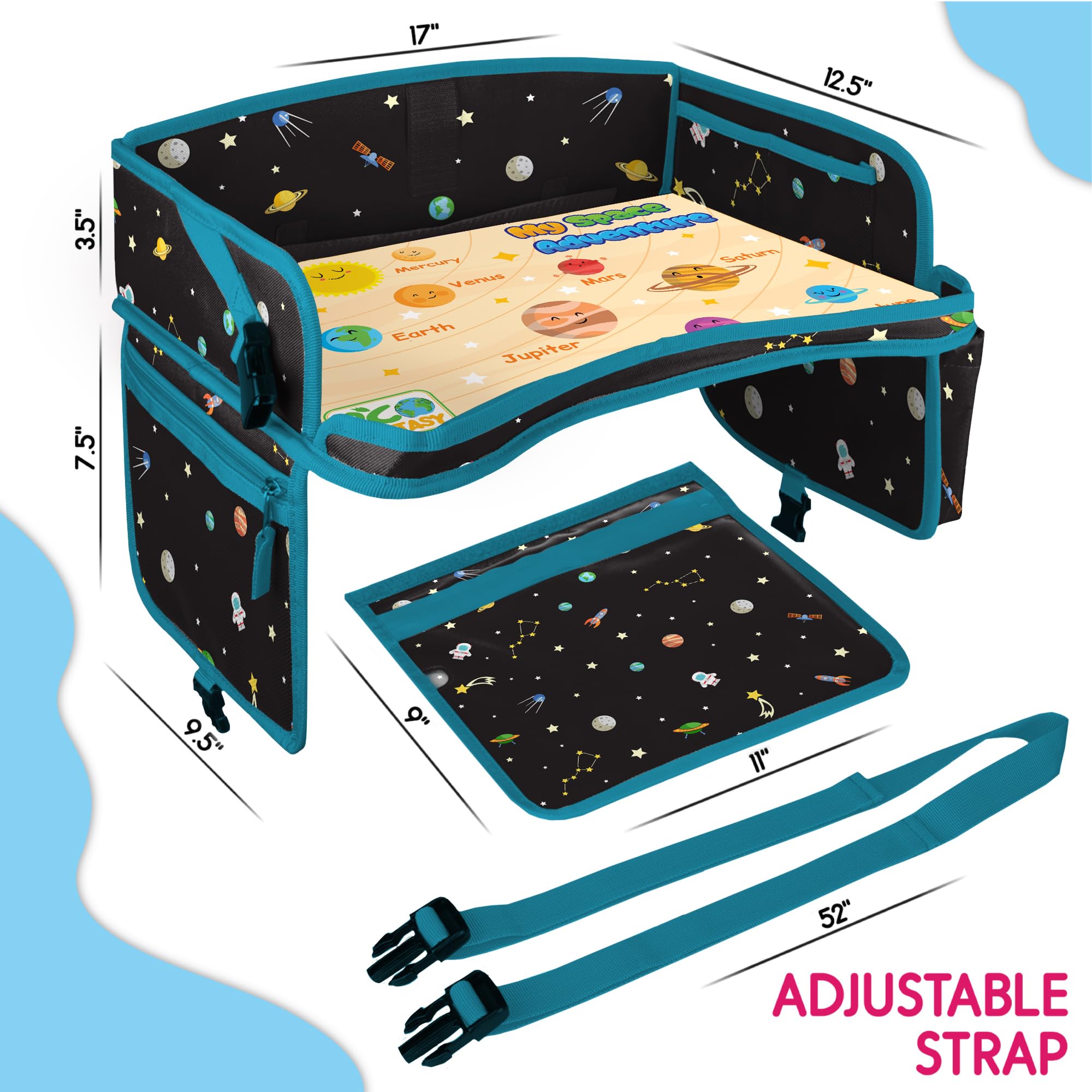 Portable Kids Travel Tray Organizer - We designed our car lap tray for kids with solar system illustration which coupled with the wide design provides the perfect spot for kids to learn, play, eat snacks when flying a plane, riding cars, train, or bus. It keeps toddler travel toys organized and within reach, perfect as car travel essentials for long trips. Stay organized on the go!