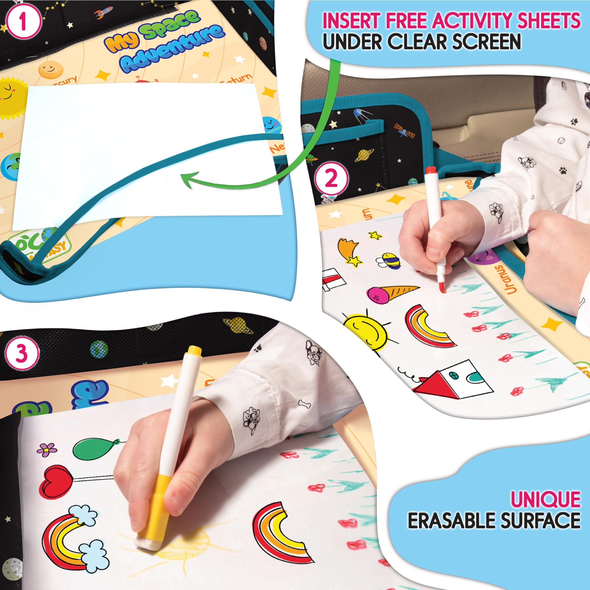 Let Kids Play & Learn - Our car seat tray for kids travel comes with 2 activity sheets and 4 erasable markers along with 20 downloadable sheets so your little one can draw, play and have fun while providing them with a multipurpose car trays for eating, writing, drawing, preschool activities and more. It doubles as a car tray for toddler travel activities and plane activities for kids ages 3-5, making it travel essentials kids will love!