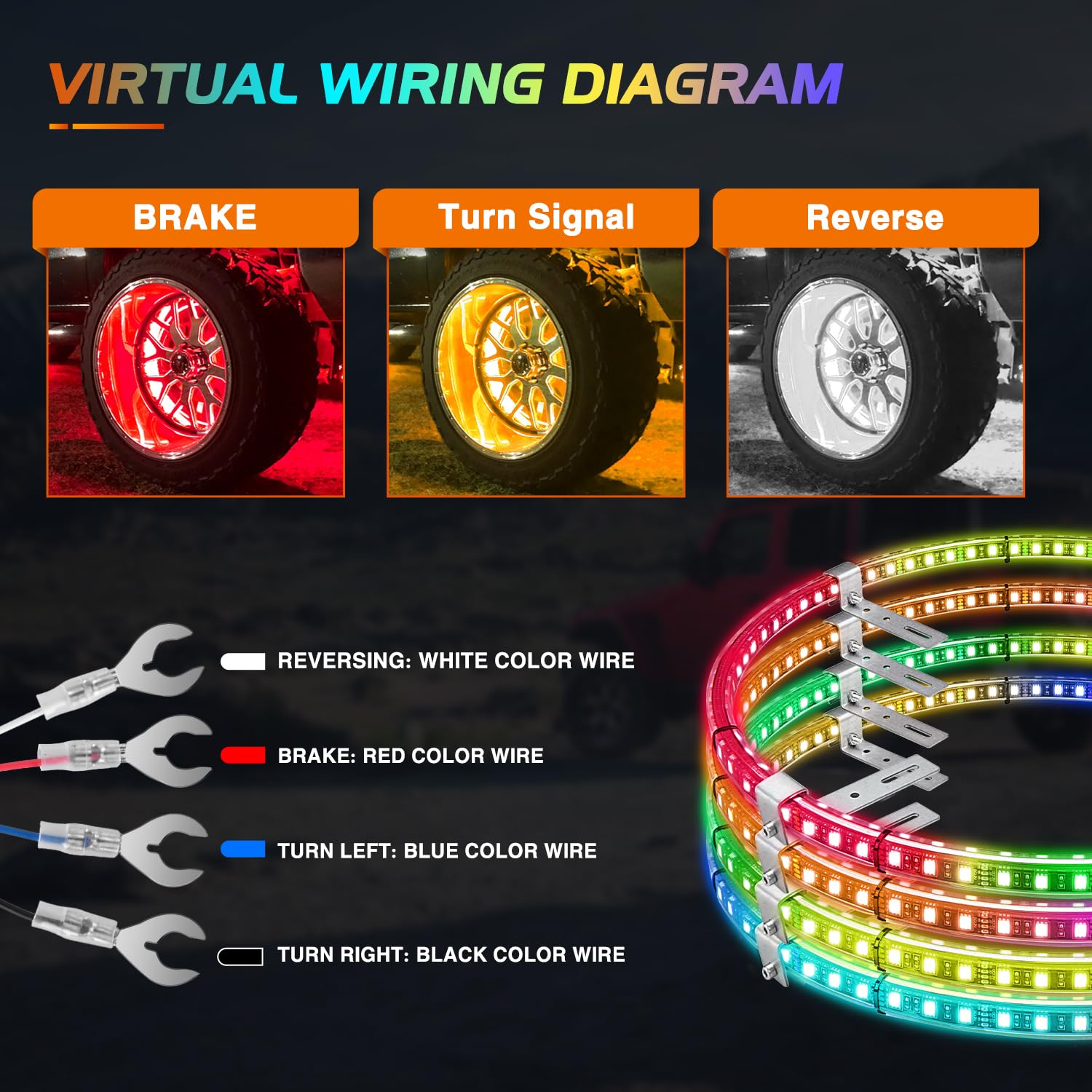 Ultra Brightness LED: This LED Wheel Ring lights adopt 576pcs SMD 5050 LED chips. RGB-IC Chips perfectly present the chase effect. light up the night with hundreds of dancing patterns like chasing, build-up, strobe, pulse, right&left turn signal, etc which make you the center of attention in the cool riding night and keep safe on the night trail. Enhance the look of your car and enhance the feel of your driving experience.