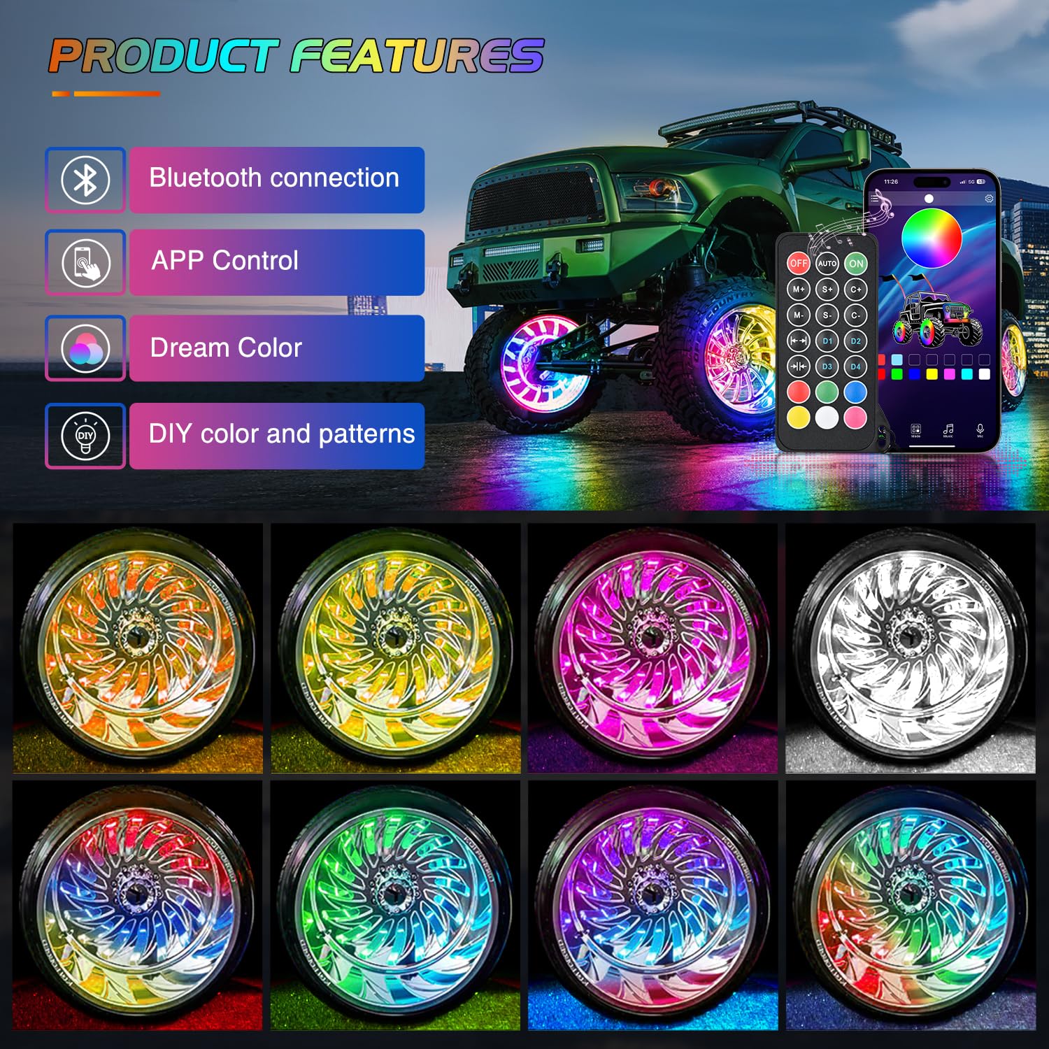 Smart Phone APP and Remote Control: LED wheel lights can be controlled by Remote and Smartphone APP via Bluetooth. It includes adjusting the speed, brightness, and dancing patterns, sync music or sound to lights, DIY colors and dynamic features through the APP and so on. The remote control has 6 static lighting modes, mode and color switching,auto and even more for you to explore. Various modes can be switched at will, giving you an amazing visual and auditory experience.