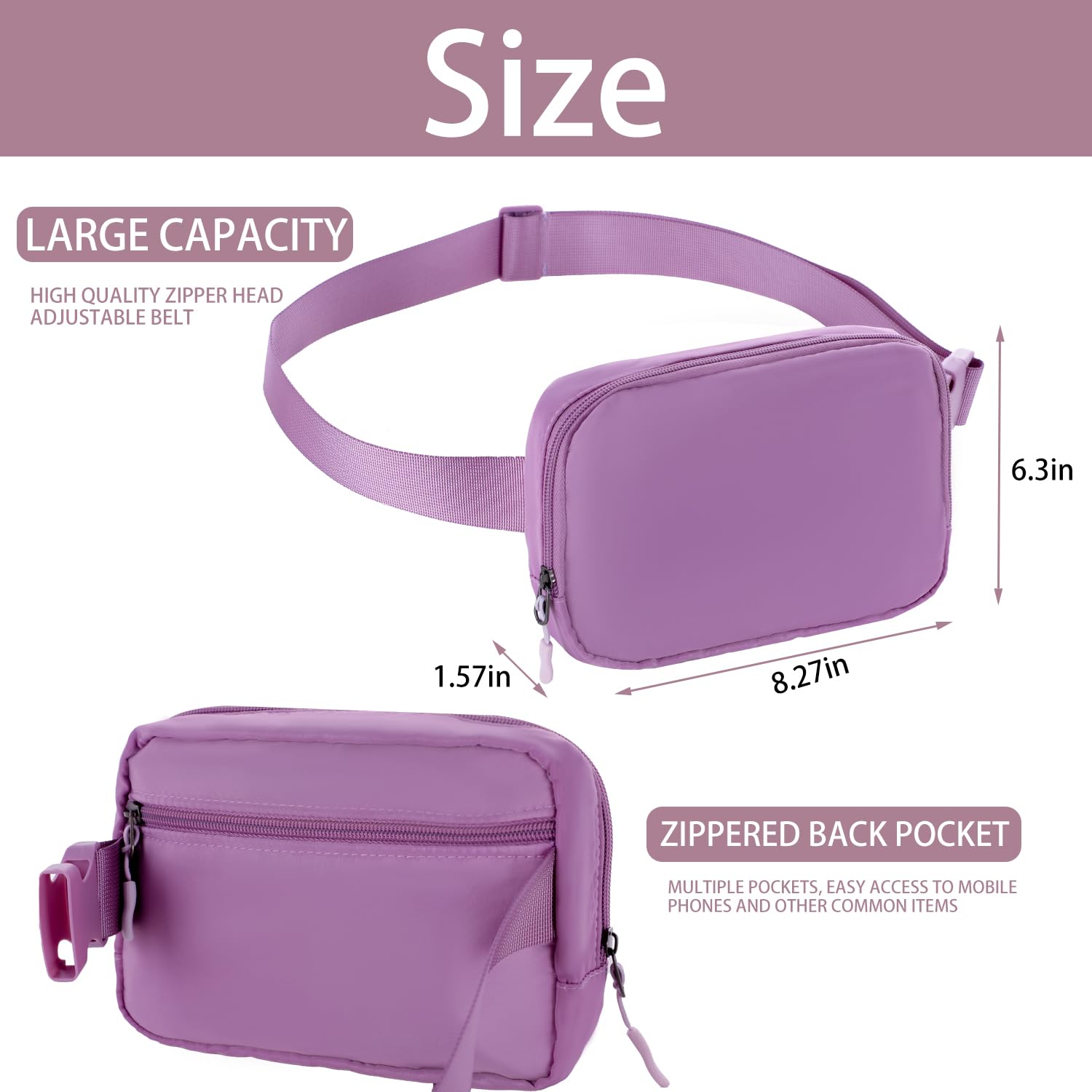 Everywhere belt bag large capacity: 8 inches x 2 inches x 5.5 inches, large-capacity design rich patterns, orderly storage, to meet travel needs, can be placed mobile phones, wallets, powder, lipstick, keys, etc., the main bag is divided into partitions, convenient The items are placed in partitions, and the rear anti-theft zipper can be used to store important items such as mobile phone wallets.
