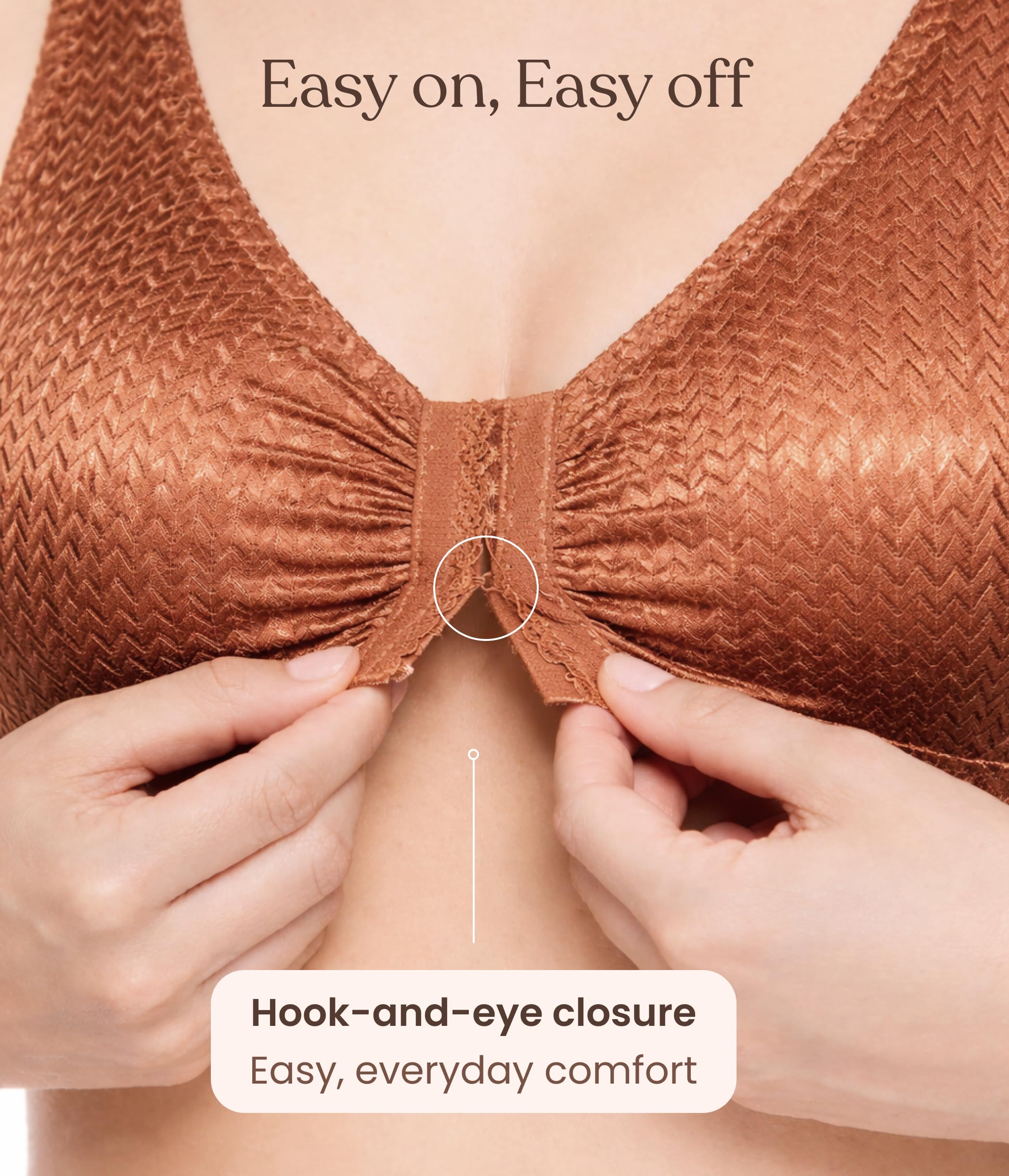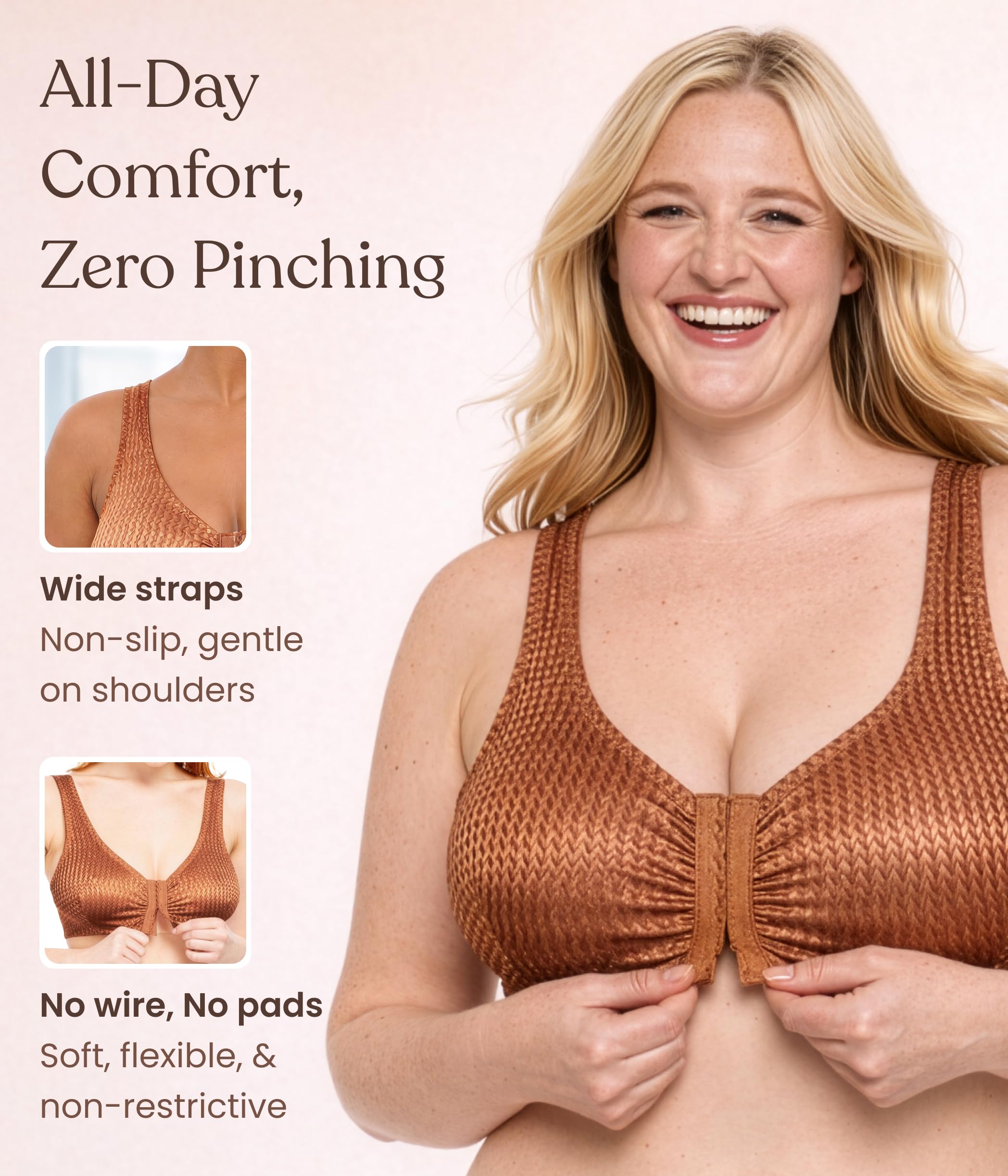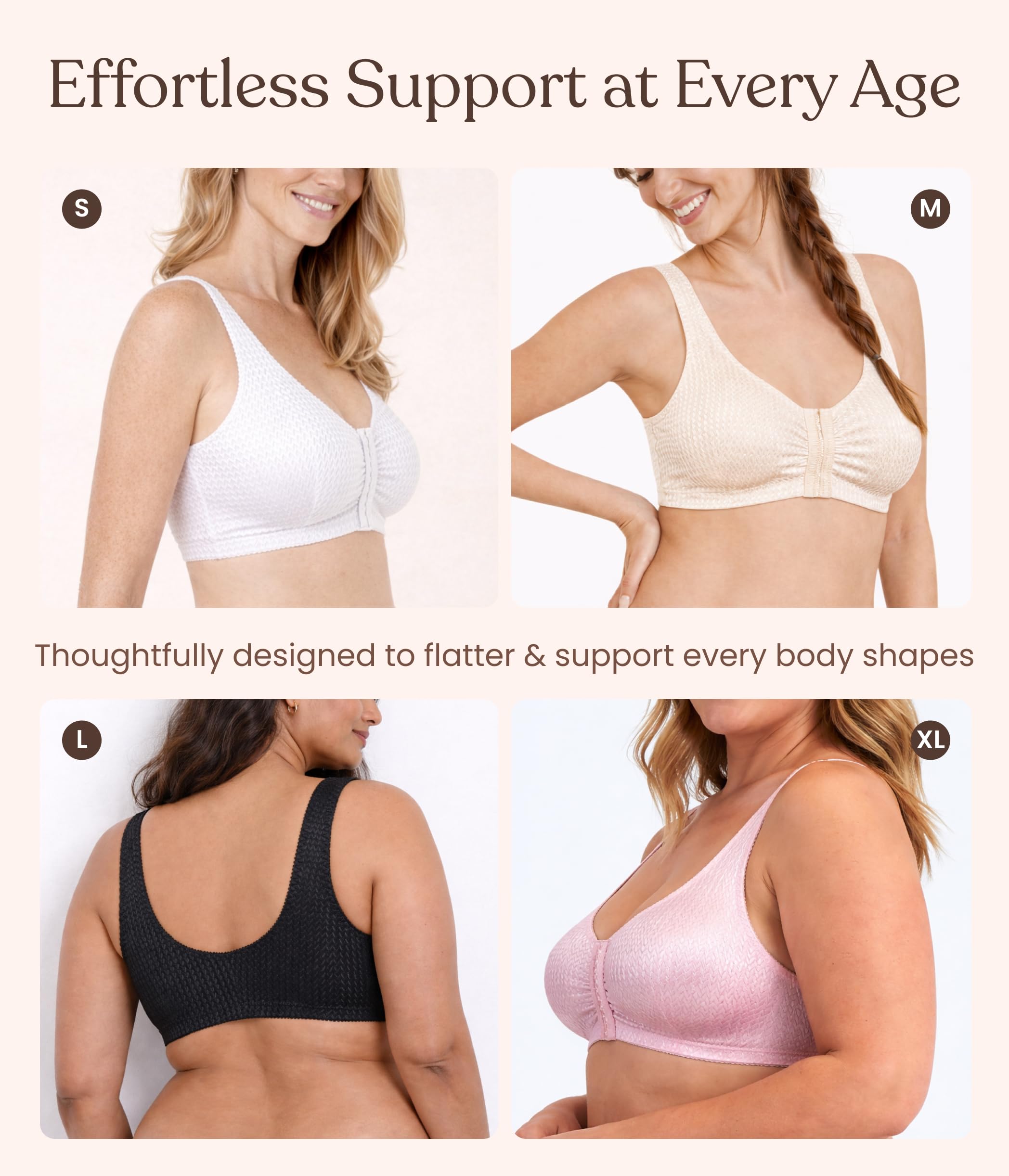 WIRE FREE & Un-Padded with wide shoulder straps stay put, which helps reduce back strain and front hook and eye closure for easy-off convenience.