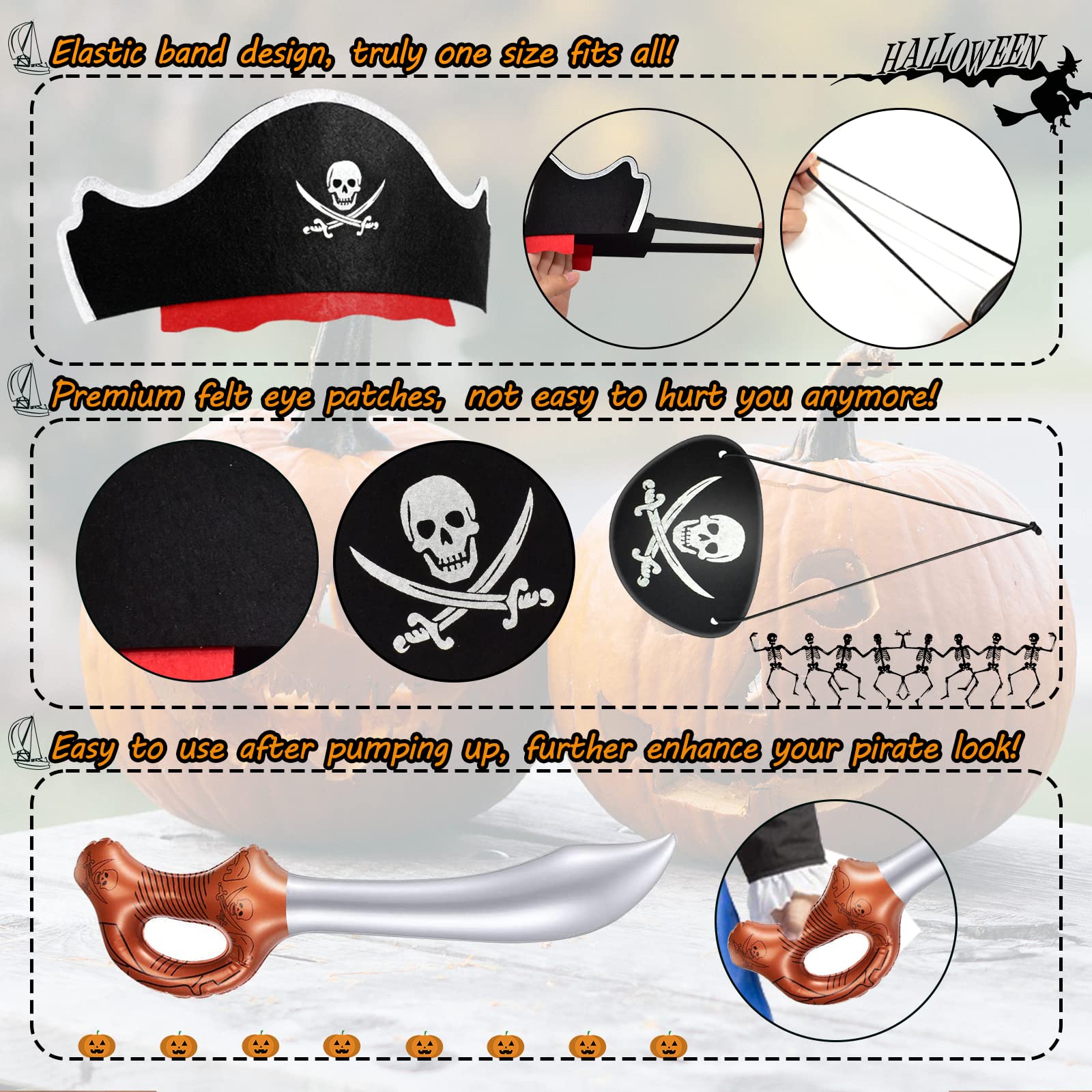 Premium Material: Our pirate eye patches and hats are fabulous with a nice, thick fabric, which feels soft and comfortable; The fabric we use have been upgraded with premium felt instead of using plastic eye patches; Not easy to break and hurt you anymore; And the inflatable swords are made of premium PVC, easy to carry and reusable