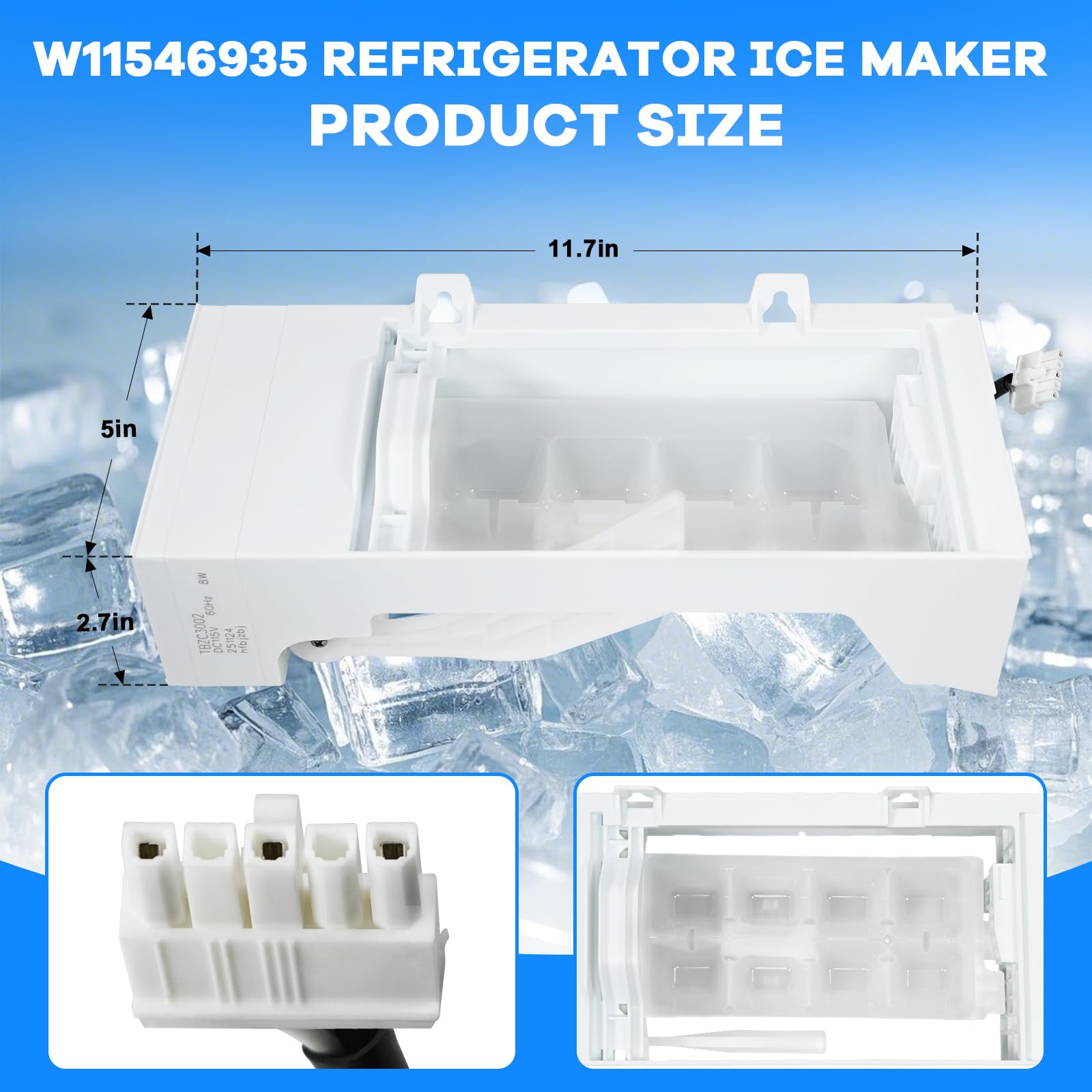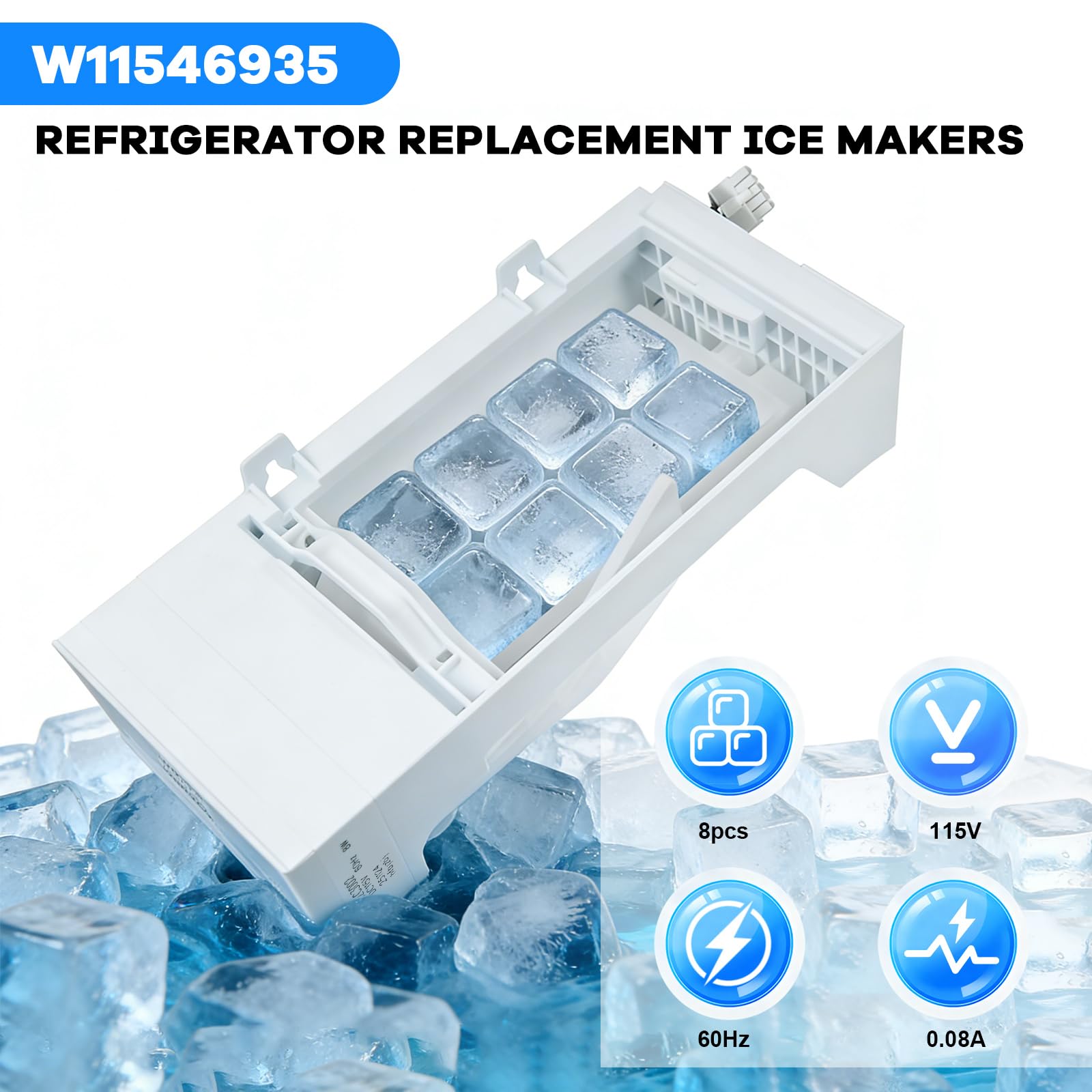 Safe and efficient:W11546935 ice maker features parameters of 115 volts、60 hertz and 0.08 amperes, perfectly matching compatible refrigerator electrical systems. The replacement ensures precise integration, resulting in low power consumption and minimal heat generation during operation. This guarantees electrical safety while reliably producing sufficient ice cubes to meet diverse household needs such as cold drinks and food preservation.