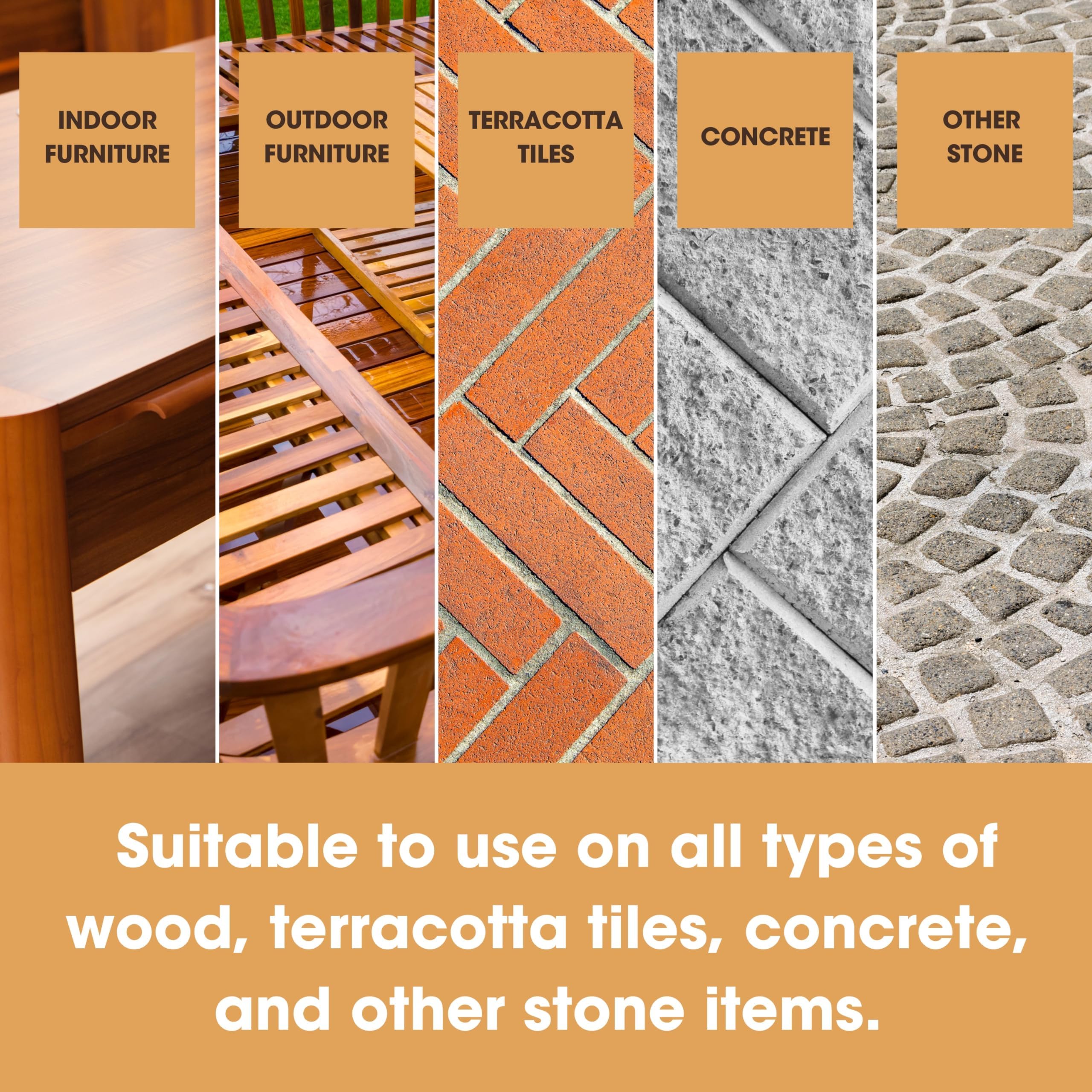 USE ON ALL TYPES OF WOOD: Suitable for use on almost all wooden surfaces, terracotta tiles and all porous stone, the oil penetrates and seals the surface providing protection for interior and exterior surfaces, except exterior oak wood.
