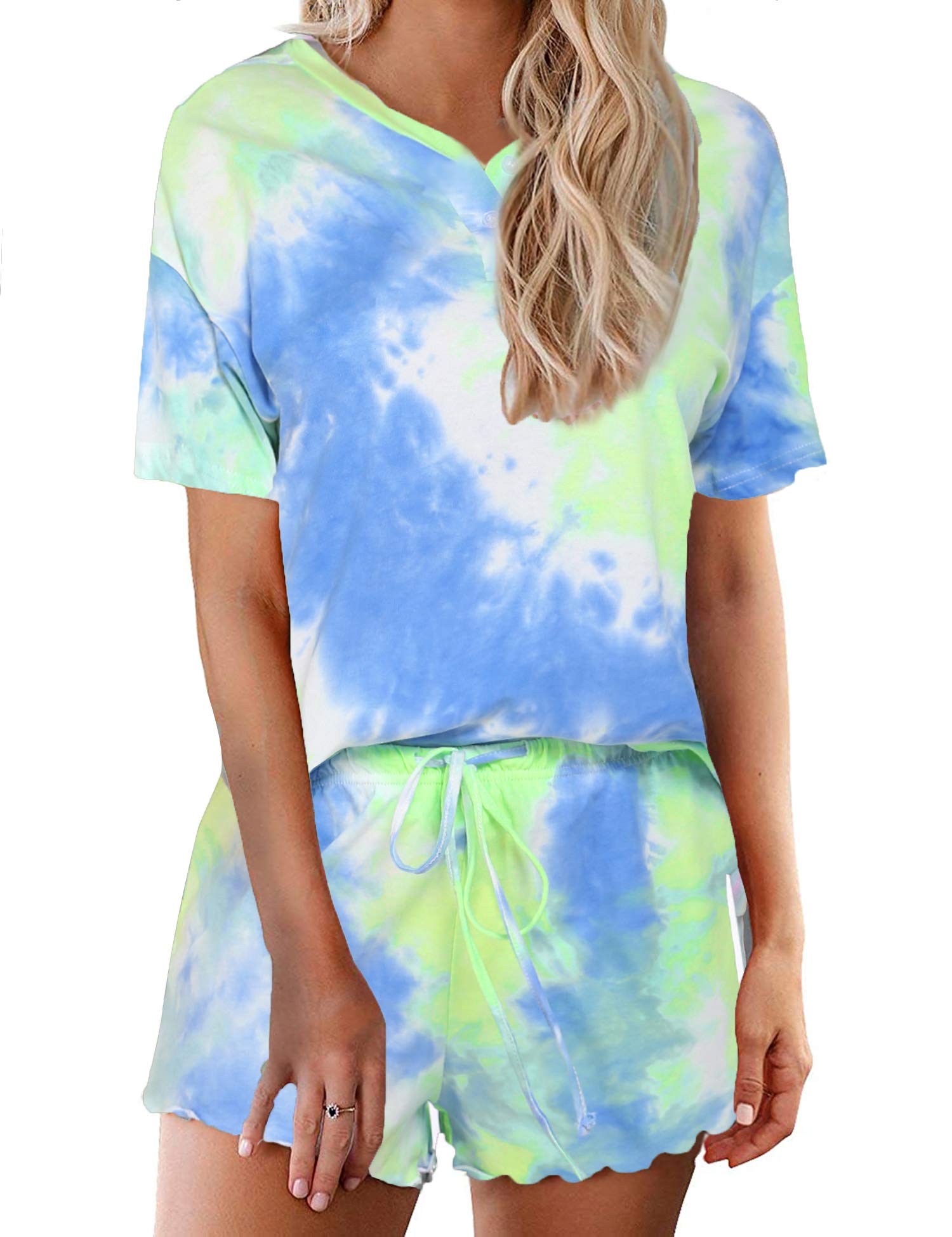 [Women Two Piece Pajama Set]: Soft and comfy loungewear nightwear fits for all seasons. Sleep in the daily casual Short Sleeve PJs is not only ultra-comfortable but also stylish. Jersey material feels as smooth & light as air breathing on your skin. Classic crewneck with buttons, elastic drawstring waistband is easy to dress up or down; New chic tie dye patterned, suitbale for working/ relaxing at home, lounging out or dreaming under the sunshine