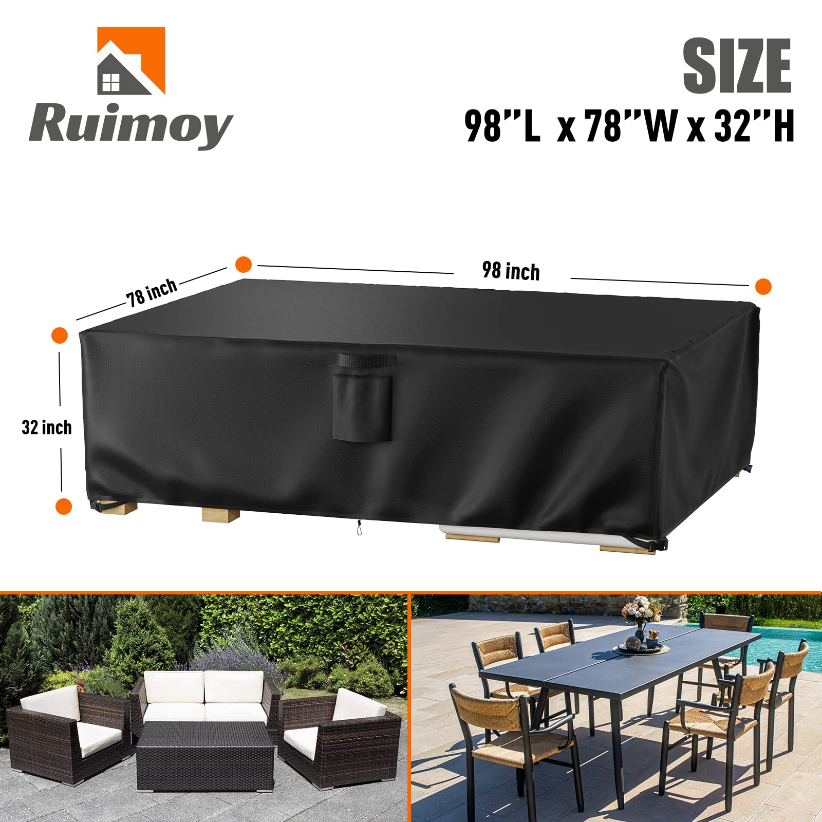 【Universal Size】This cover measures 98 inches long x 78 inches wide x 32 inches. It fits most furniture such as coffee tables, benches, coffee tables, chairs, round or oval patio dining sets, 8-12 chairs, or 6-8 person sofa sets. Please measure the size of your furniture set before purchasing.