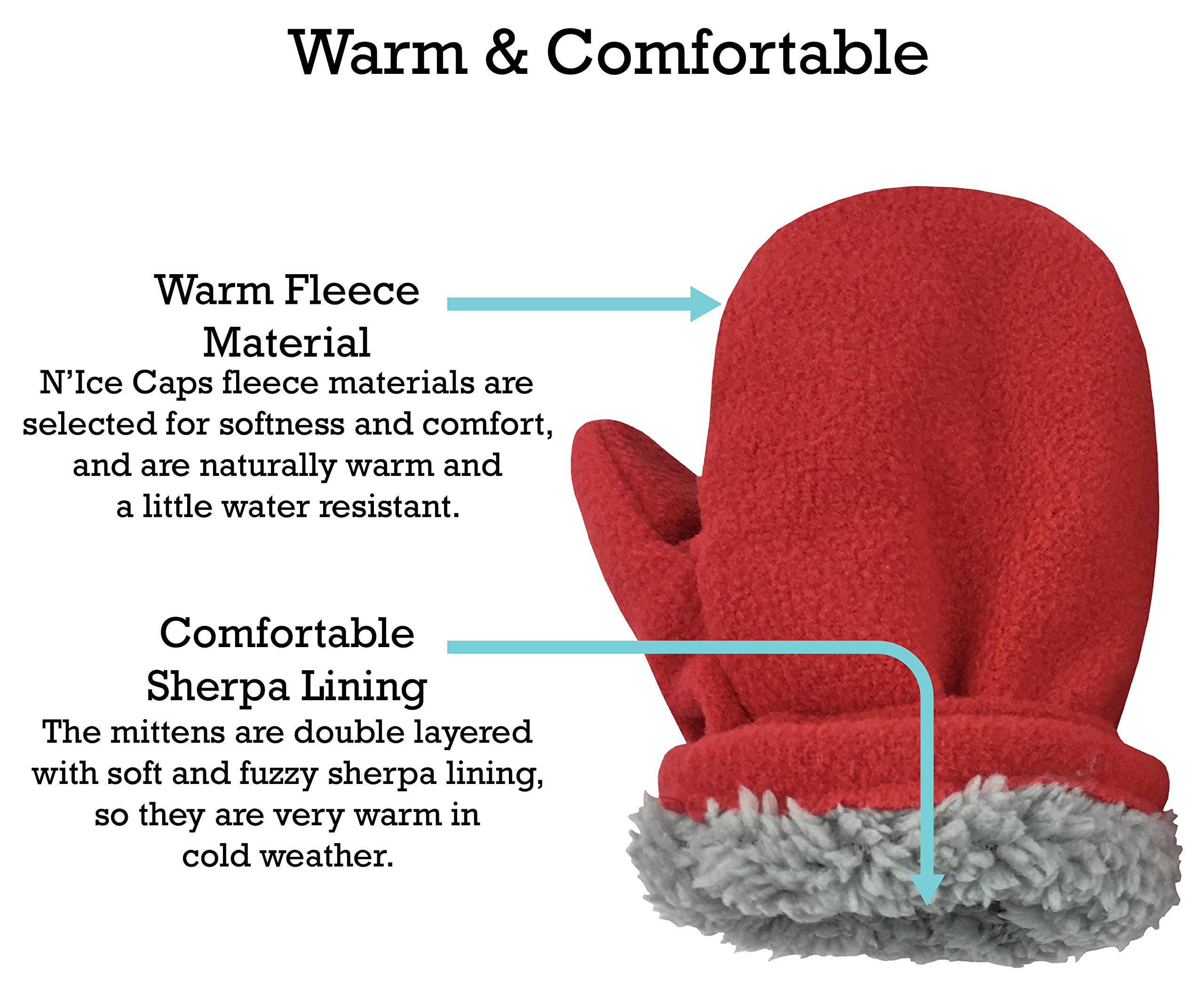WARM AND COMFORTABLE SHERPA LINING: N'Ice Caps kids fleece materials are selected for softness and comfort and are naturally warm and a little water resistant. The mittens are double layered with soft sherpa lining, so they are very warm in cold weather