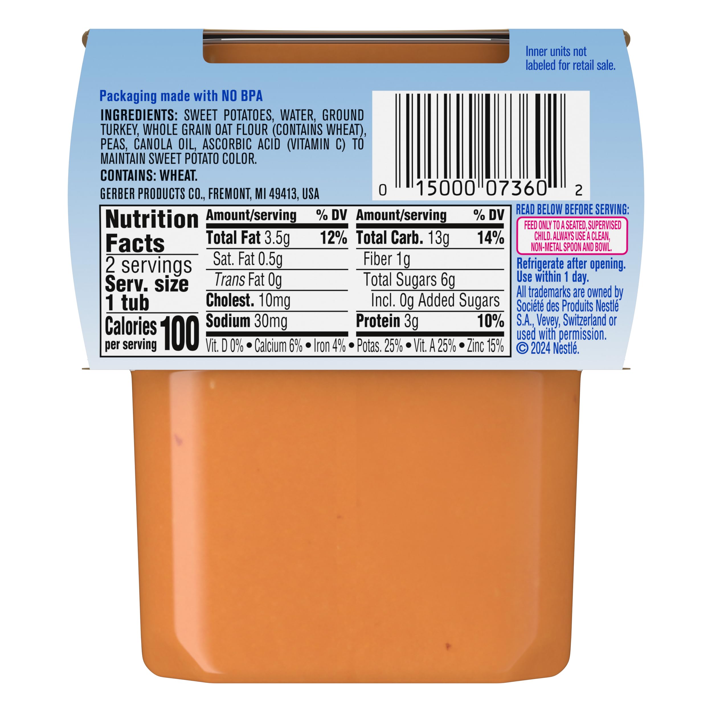 Gerber Stage 2 Baby Food, Sweet Potato Turkey with Oats Puree Tubs are a premium choice for your child’s early stages. They are crafted to support a varied diet, along with meeting the busy lifestyle needs of caretakers and parents. Each baby puree tub comes in a portable, easy-to-store format – making it perfect for life’s busy moments. This stage 2 baby food puree is designed for babies who are ready to start introducing new textures and flavors into their diet. Gerber understands the importance of providing wholesome ingredients during the crucial developmental stages of your child's life -- that’s why these baby puree tubs are ideal for parents who seek a convenient and high-quality option in their baby's diet. These tubs need to be refrigerated after opening and must be used after 1 day.