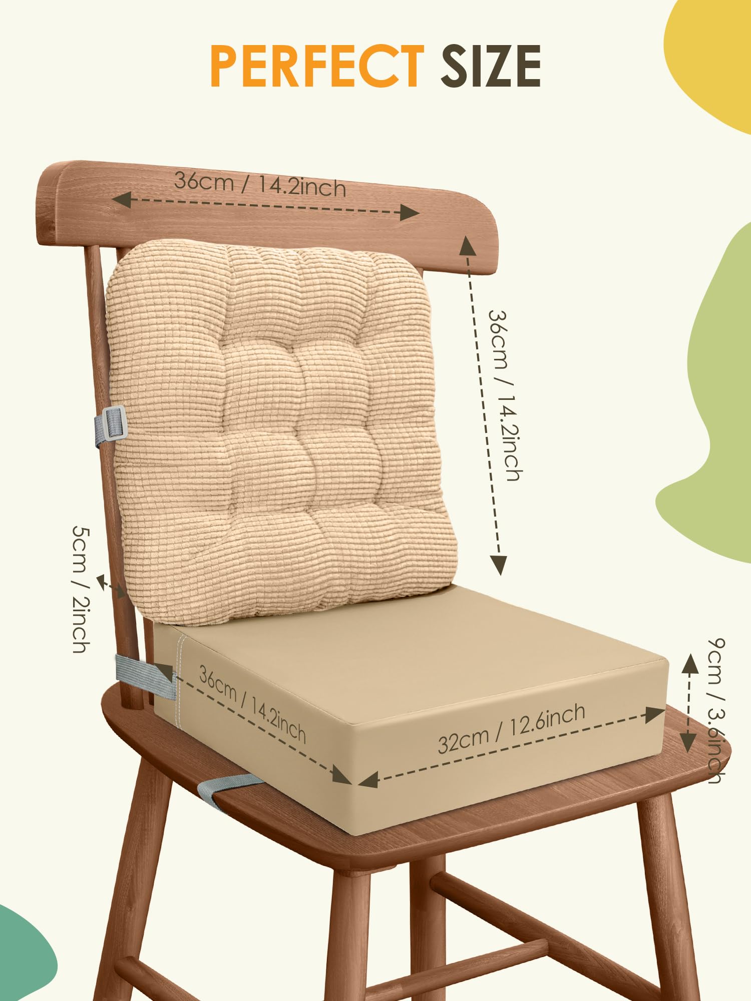 【LIGHTWEIGHT & PORTABLE】The seat cushion size of the booster seat is 14.2x12.6x3.6 inches, and the backrest size is 14.2x14.2x2 inches. Not just suit for dining tables and chairs, but also making it easy to super easy to carry. Whether at home or on a trip, it takes no spaces.You can take it for your picnics as cushions for baby seat,or use them as floor seats for baby at living room or baby playing room.