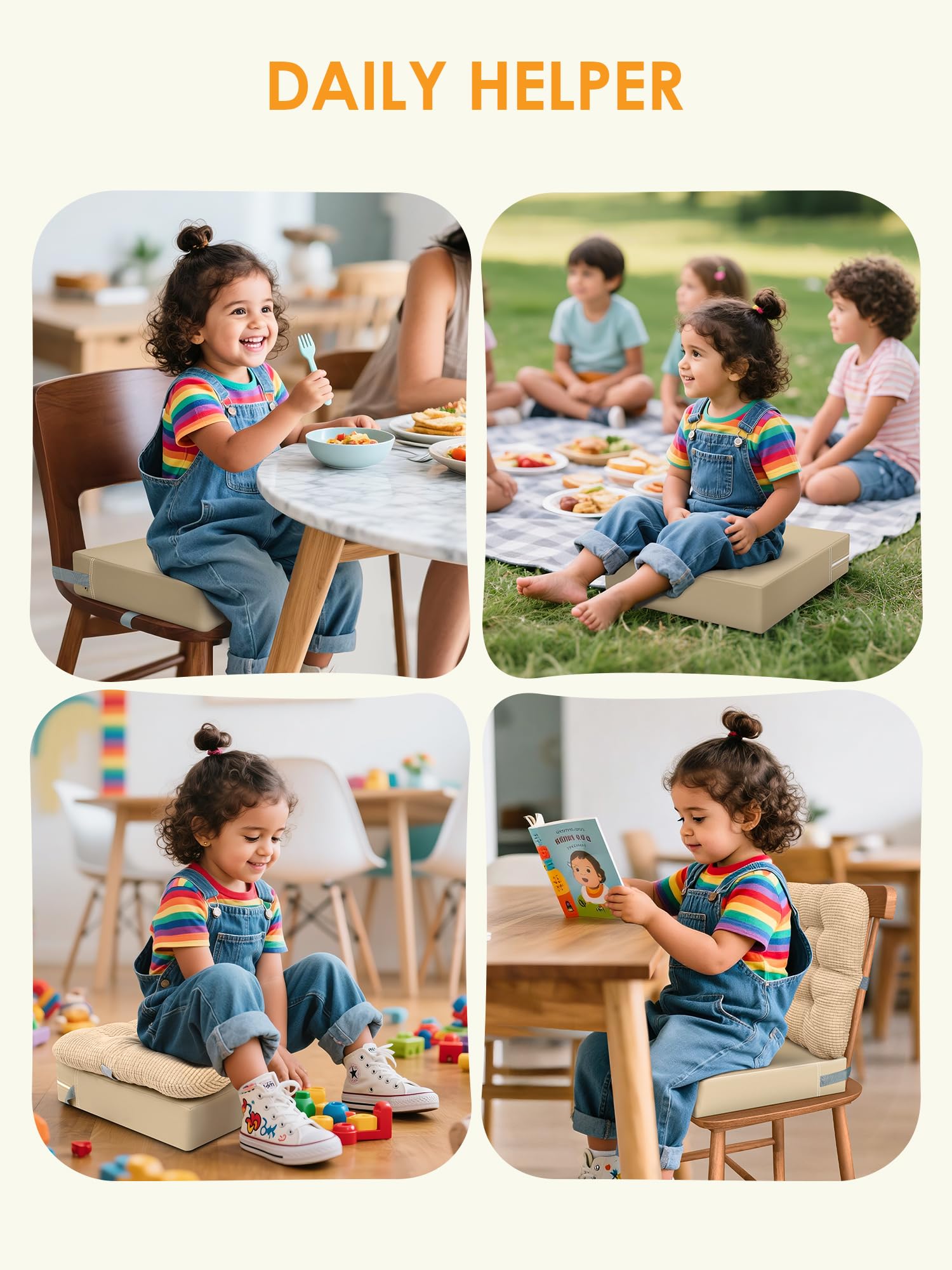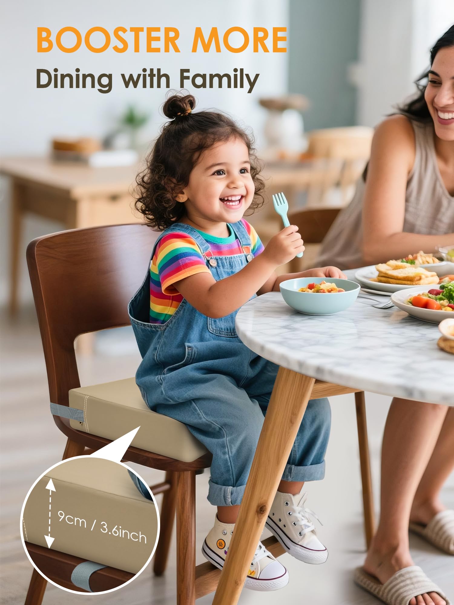 2.5" High-Density Sponge Core with 85% rebound rate retains shape after 1000+ uses, 3.55" Lift Height designed , helping 2-6-year-olds comfortably access plates/cups without kneeling or straining.Waterproof PU Leather Surface repels juice/milk instantly; simply wipe clean with a damp cloth—perfect for messy toddler meals!Adjustable Straps lock securely on chairs (14”” width), tested by 50+ wiggly kids—zero slips guaranteed! Only 2.05lbs! Carry it to restaurants/grandma’s house, or use as a step stool for sinks—folds flat for storage!