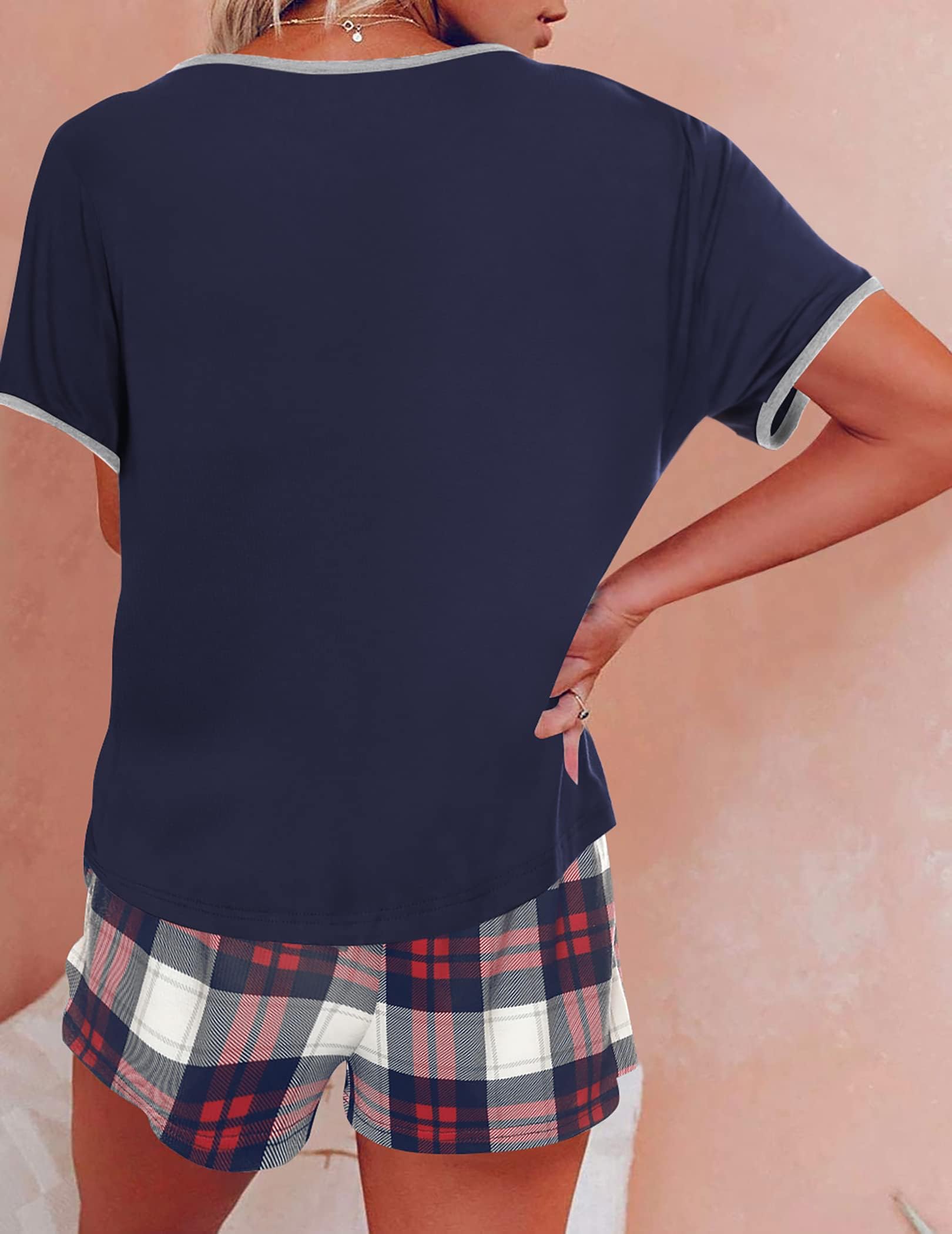 Two Piece Pajama Set: Top- with Round-neck,short sleeve,stylish color block, Pj Short- with Elastic waist,classic plaid & printοΌwhich suitable for every age group. Nice design Short Pajama Set for a relaxing day and night