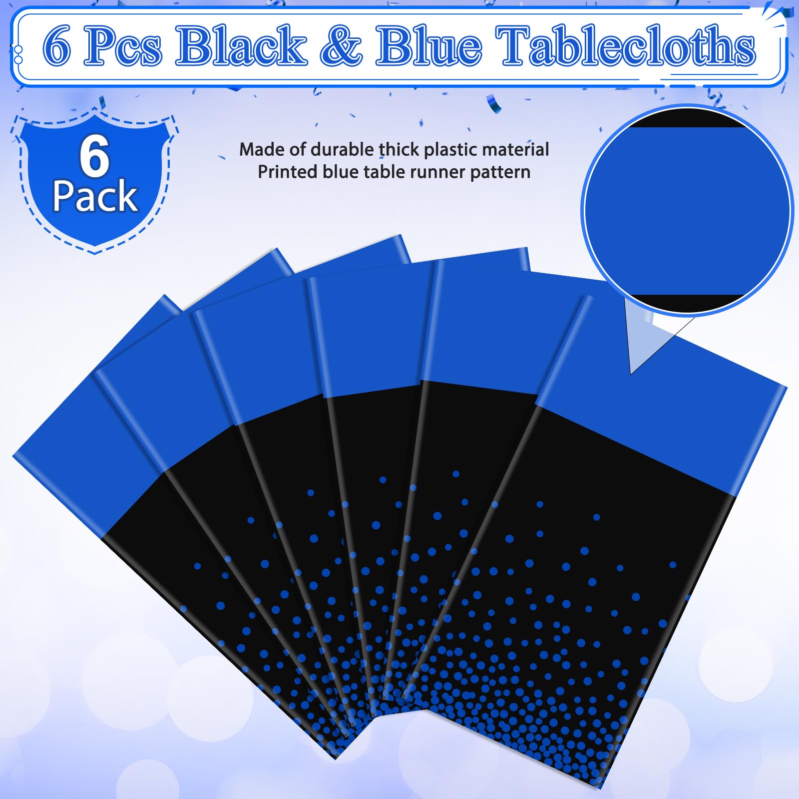 What will you receive: 6 pieces plastic black and blue party tablecloth,all over printed with blue dot on black background,the gold table runner in the middle is printed pattern,ideal for decorating your graduation birthday party supplies and decorations