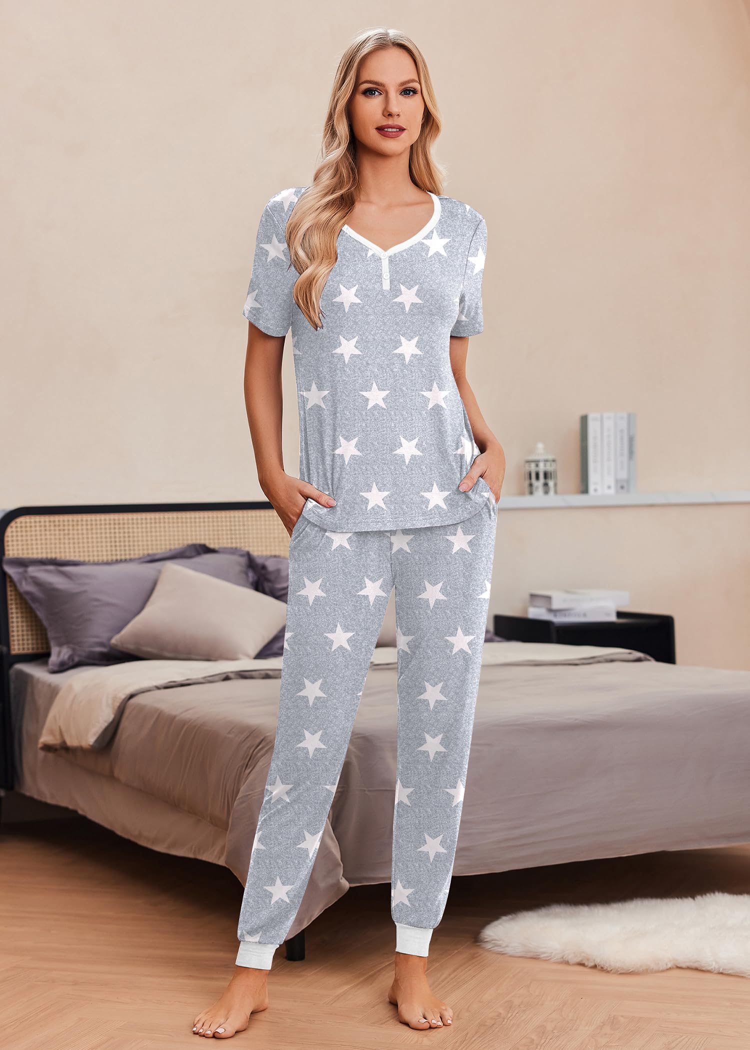Short Sleeve Tops: The sleepwear pj features with v-neck and button tops. Simple pullover styling for easy fit. Stylish and elegant ladies sleepwear night set