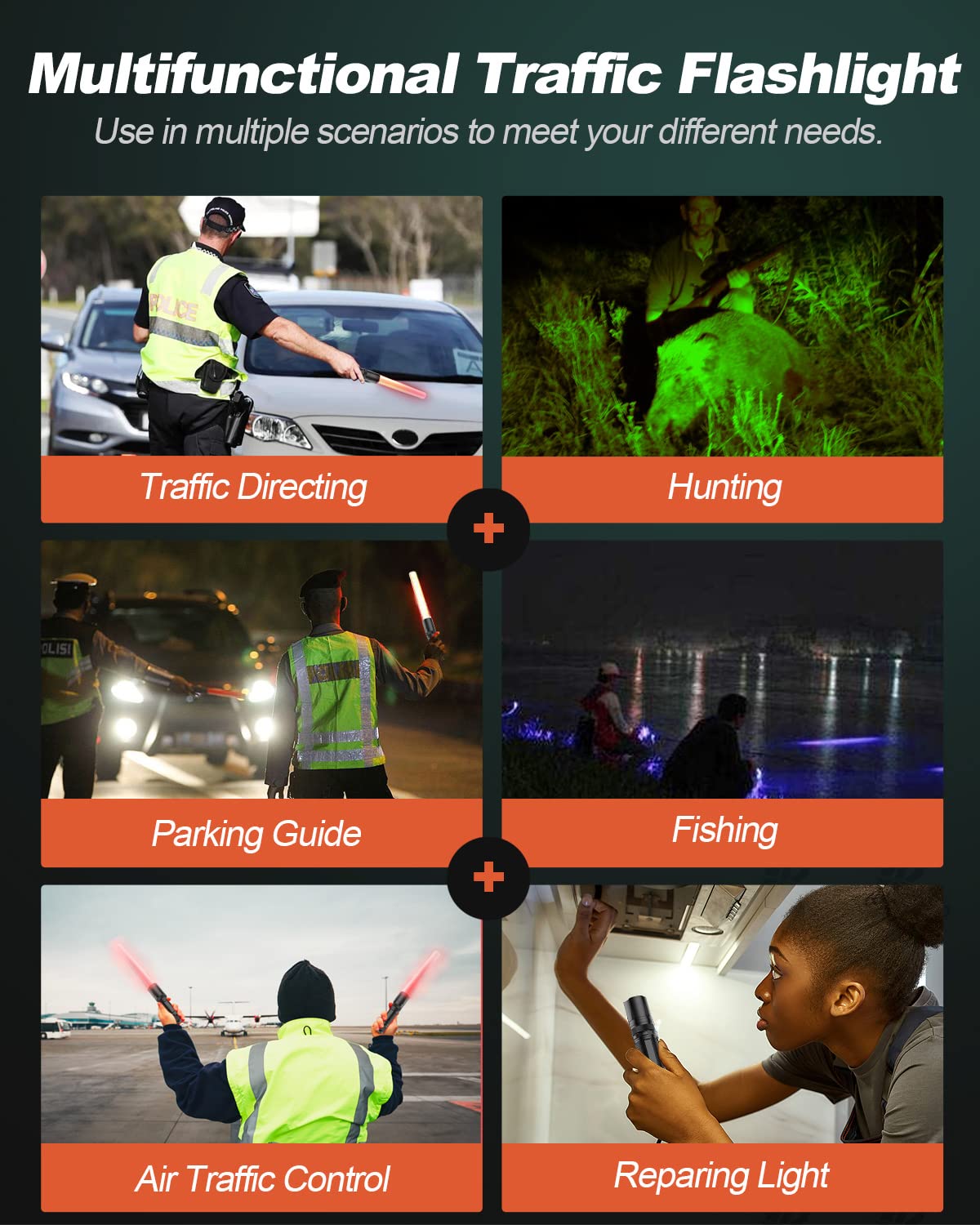 4 Color in 1 Flashlight: The RGBW LED flashlight can be used as a signal flashlight for traffic control, parking guide, car emergency, tracking, fishing, and night vision