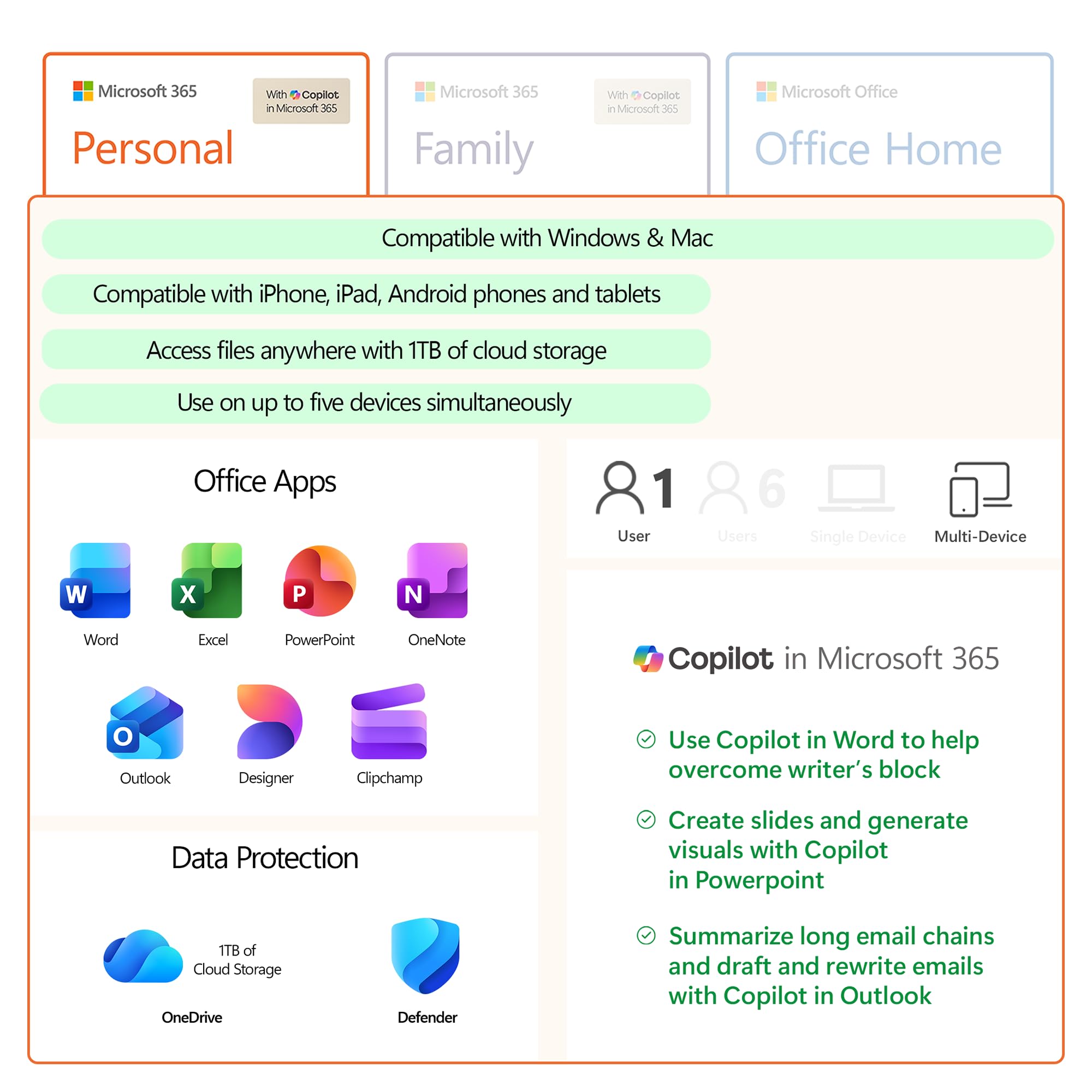 One convenient subscription for 1 person. Microsoft 365 Personal comes with premium Office apps, including Word, Excel, PowerPoint, Outlook, and more. Receive 1 TB of OneDrive cloud storage for 1 person which allows you to access, edit, and share your files and photos across all your devices—all while knowing your information is always backed up and protected.