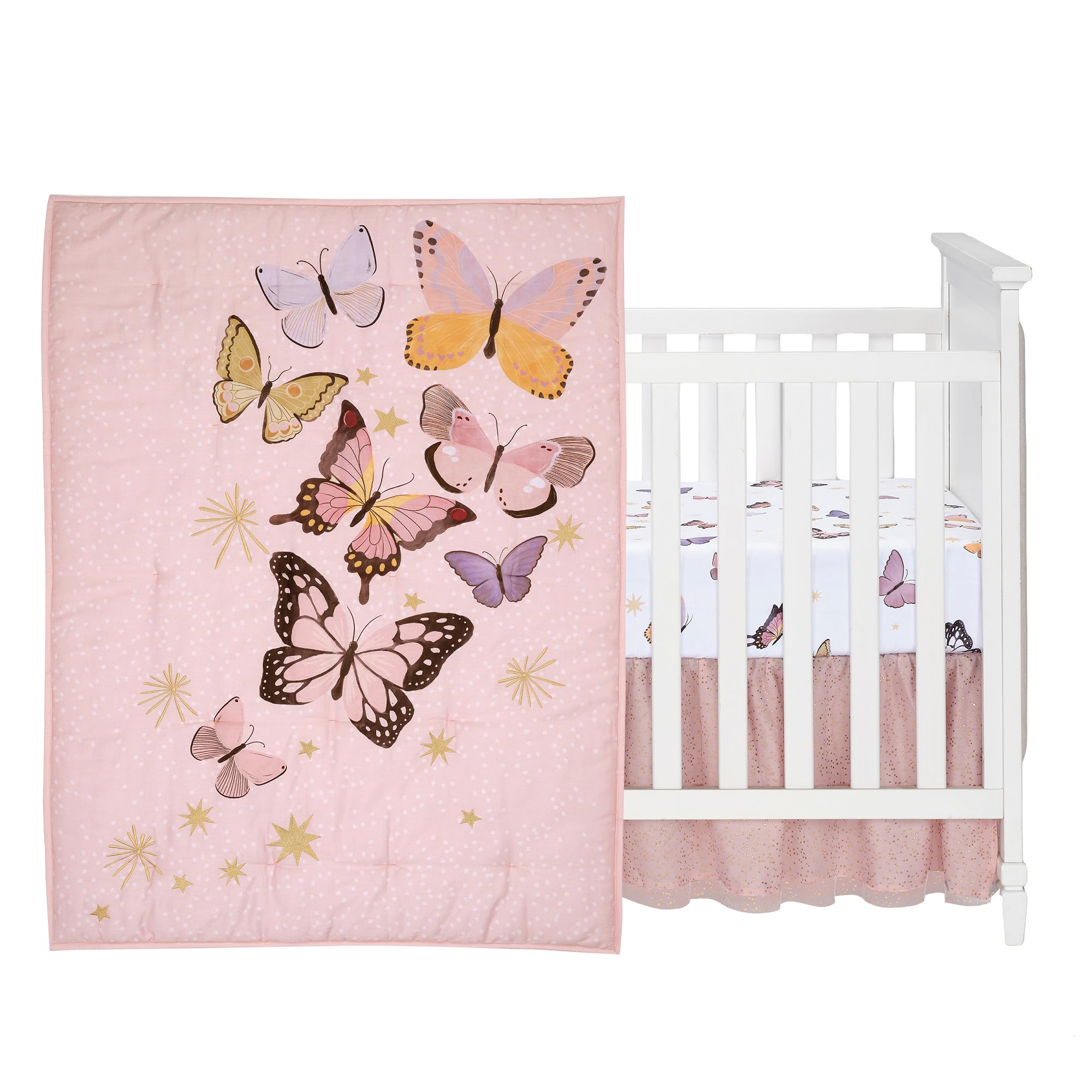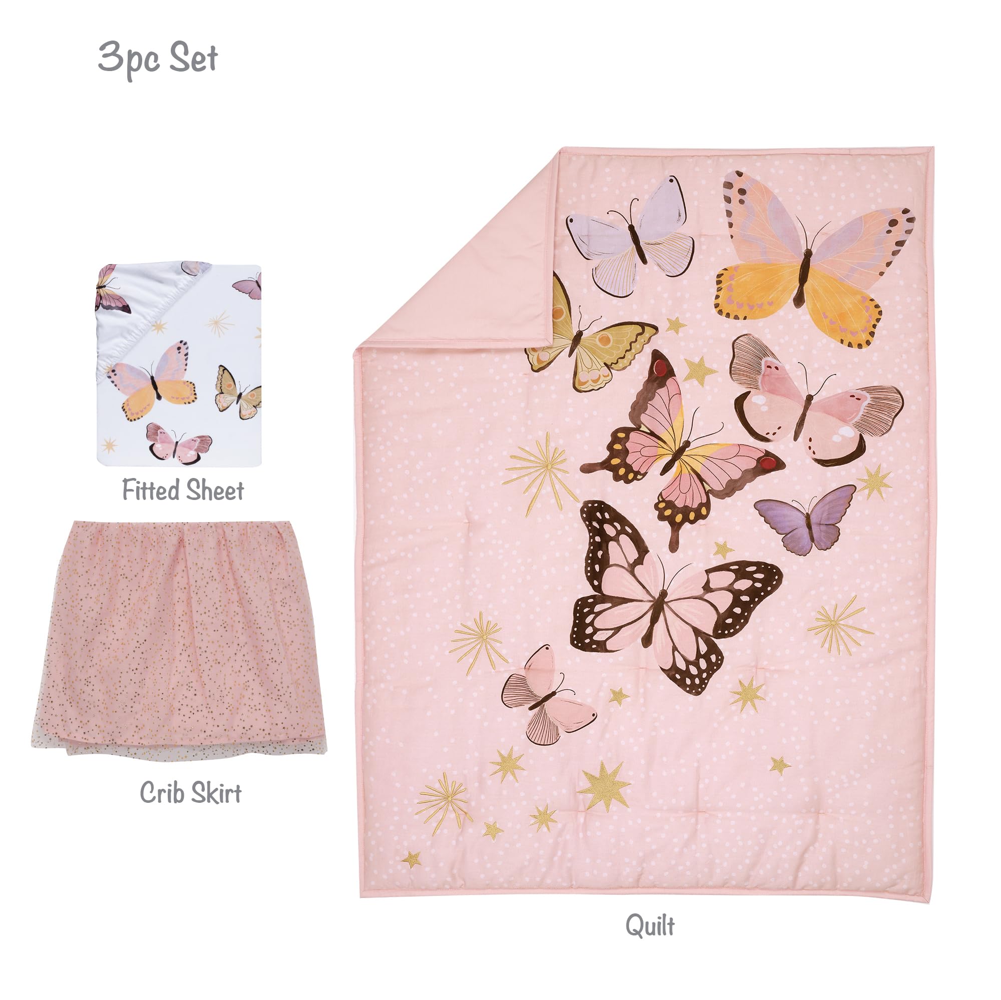 3 piece bedding set includes one quilt, one breathable 100% cotton fitted crib sheet, and one sparkling double layer crib skirt