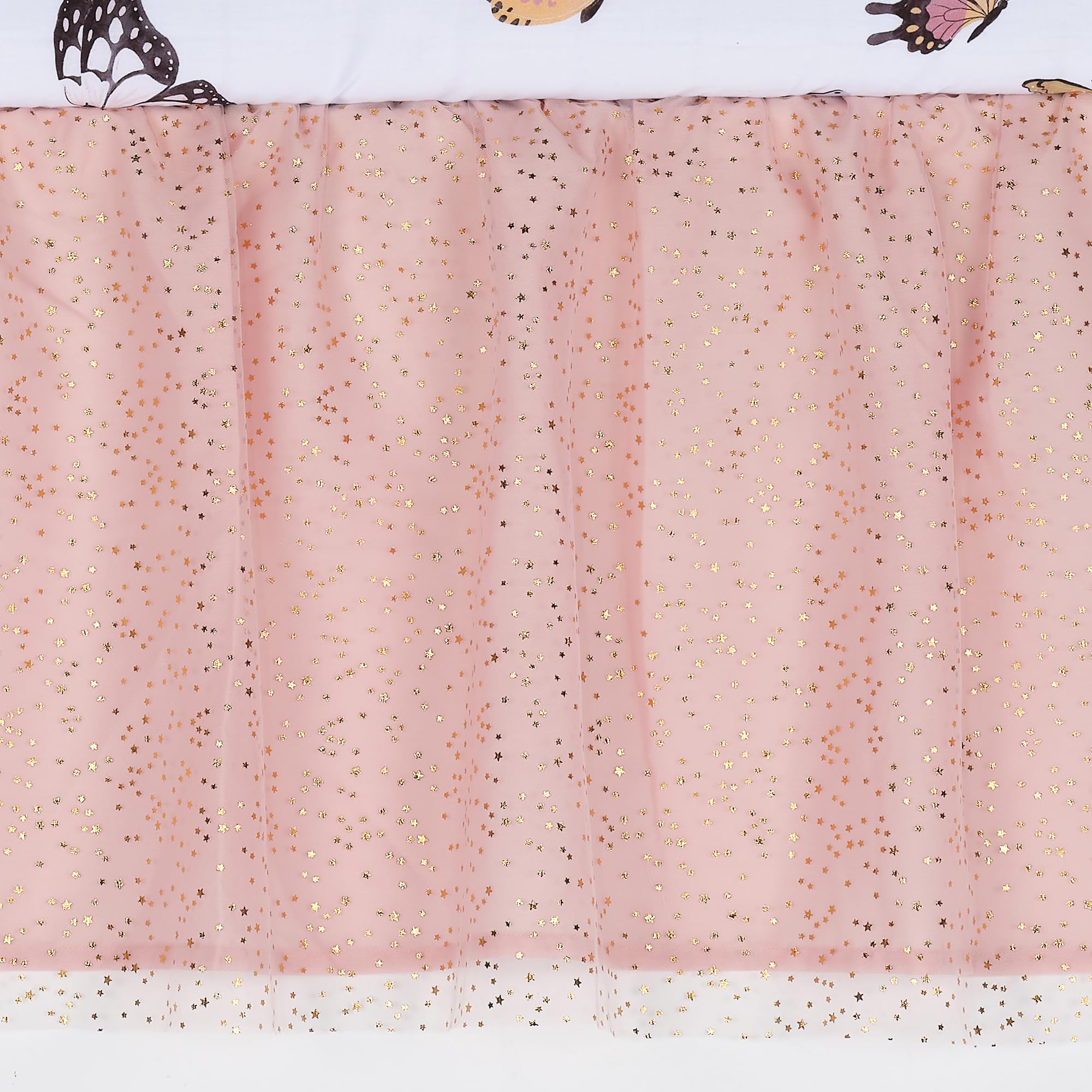 The crib skirt features shimmering stars on tulle with a second layer in soft pink