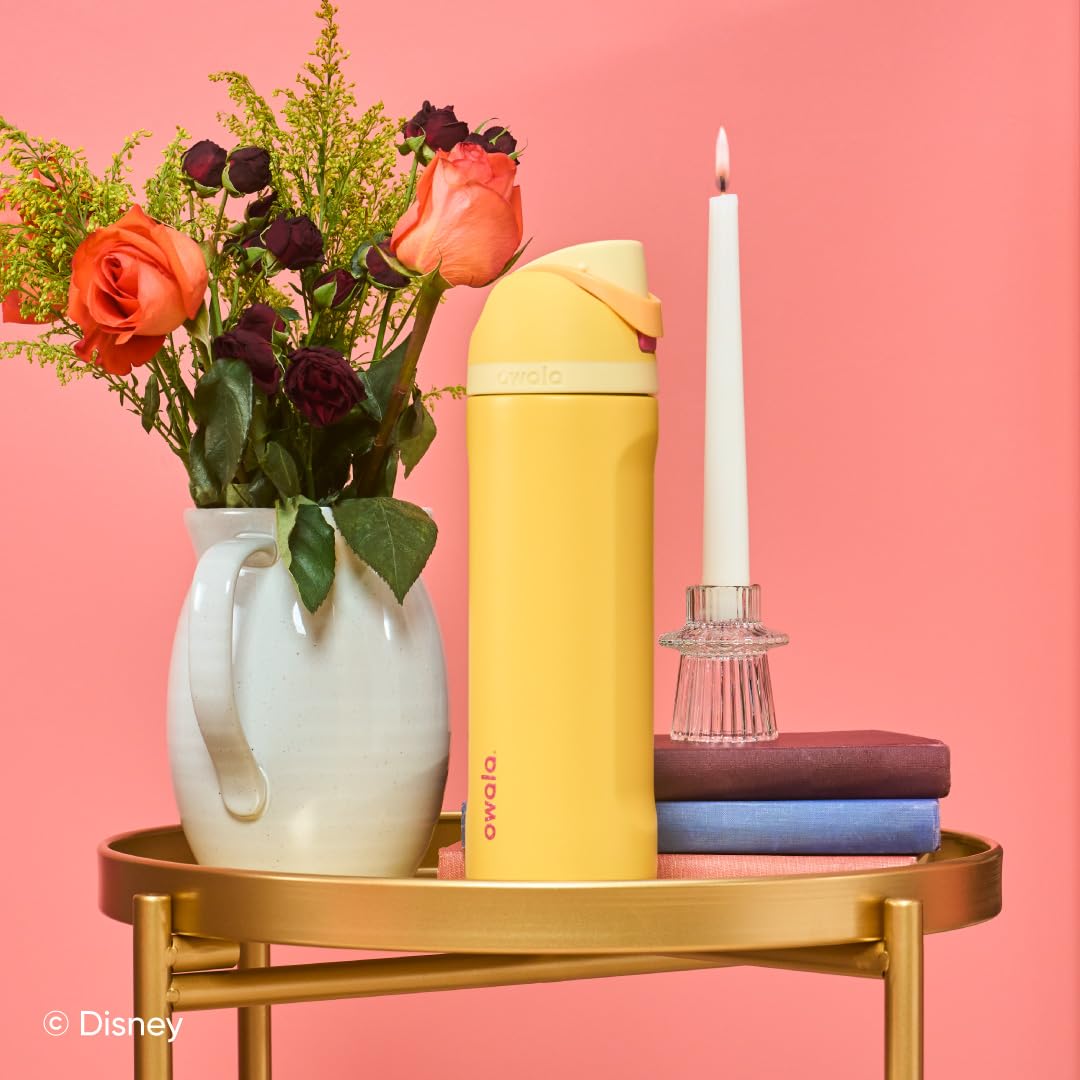 The Owala FreeSip Insulated Stainless-Steel Water Bottle with Locking Push-Button Lid easily tackles every thirst. With a built-in, easy-clean straw and a wide-mouth opening, the FreeSip reusable bottle is designed for drinking two different ways: sipping upright through the straw or tilting back to swig from the wide-mouth spout opening. Add in a push-to-open lid and Disney Princess themes, and staying hydrated has never been simpler—or more fun. Additional features include double-wall insulated stainless steel that keeps drinks cold up to 24 hours, a carry loop that doubles as a lock, a cup holder-friendly base, and a wide opening for easy cleaning and adding ice. The Owala FreeSip Insulated Stainless-Steel Water Bottle with Locking Push-Button Lid is available in five colors. Lid is dishwasher safe; hand wash cup. Not for use with hot liquids. Manufacturer’s limited lifetime warranty.