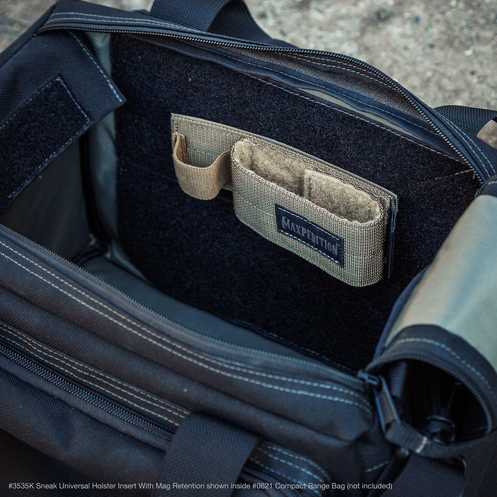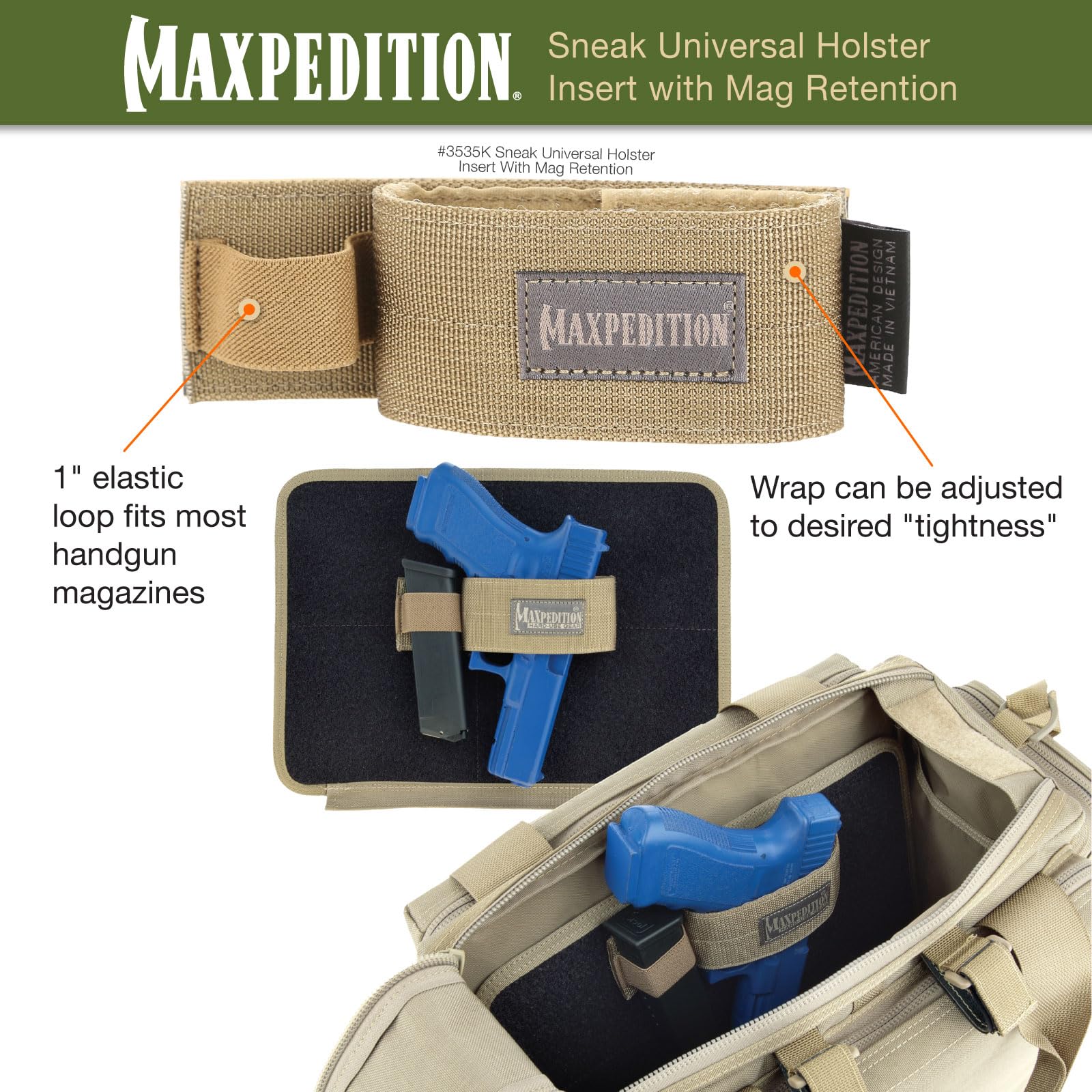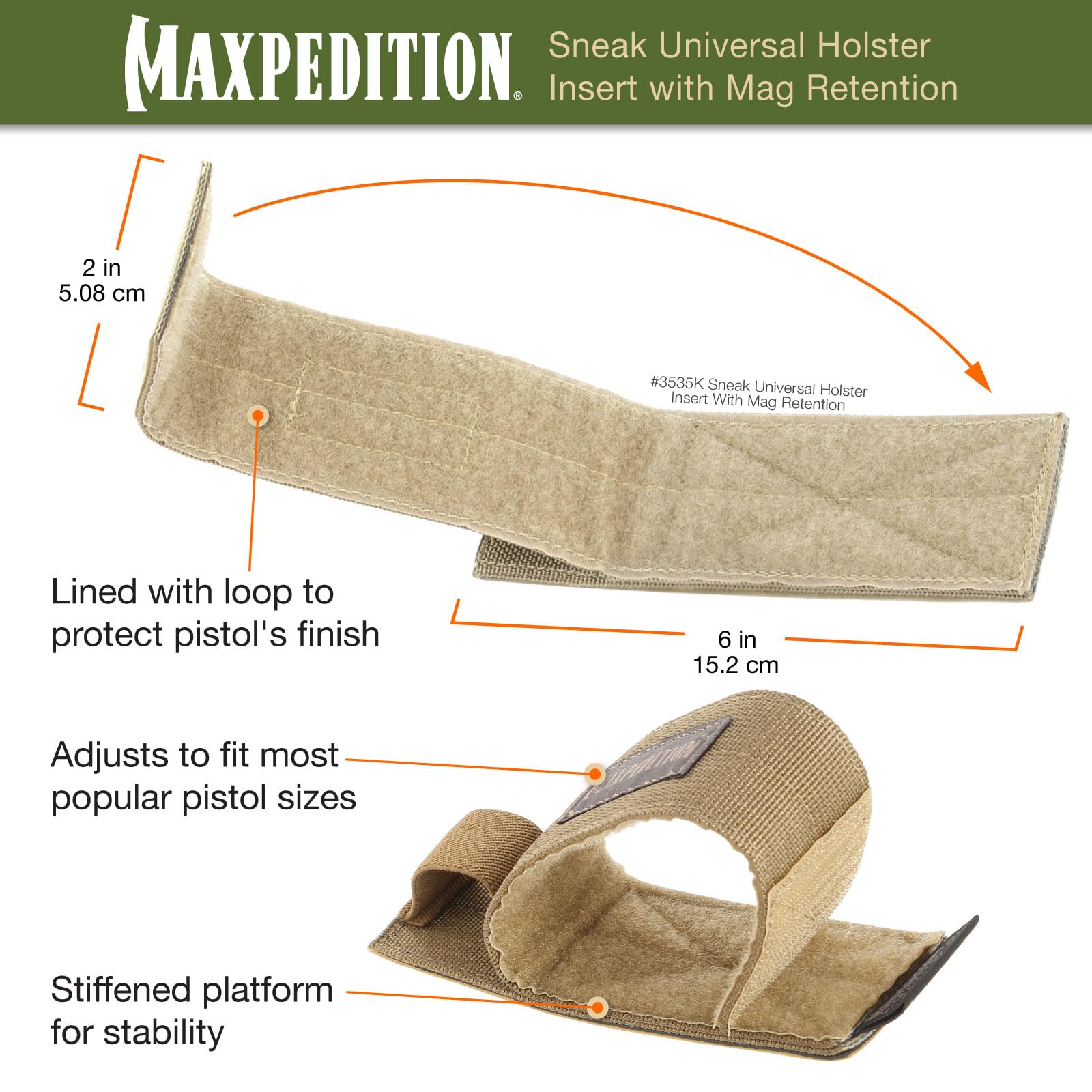 Product Details Adjustable to most popular pistol sizes, the Sneak Universal Holster Insert with mag Retention has a loop interior to protect your pistol from scratching and an elastic grip for an extra magazine. All backed by a stiffened spine with hook finish for a stable connection that allows for an easy draw. Product Feature Overall size: 6 in (L) x 2 in (H) wide x 2 in (W) Adjusts to fit most popular pistol sizes Non-directional attachment for versatility Stiffened spine for added stability Loop interior protects pistol finish Can hold other items such as tools, laptop power supply, etc.