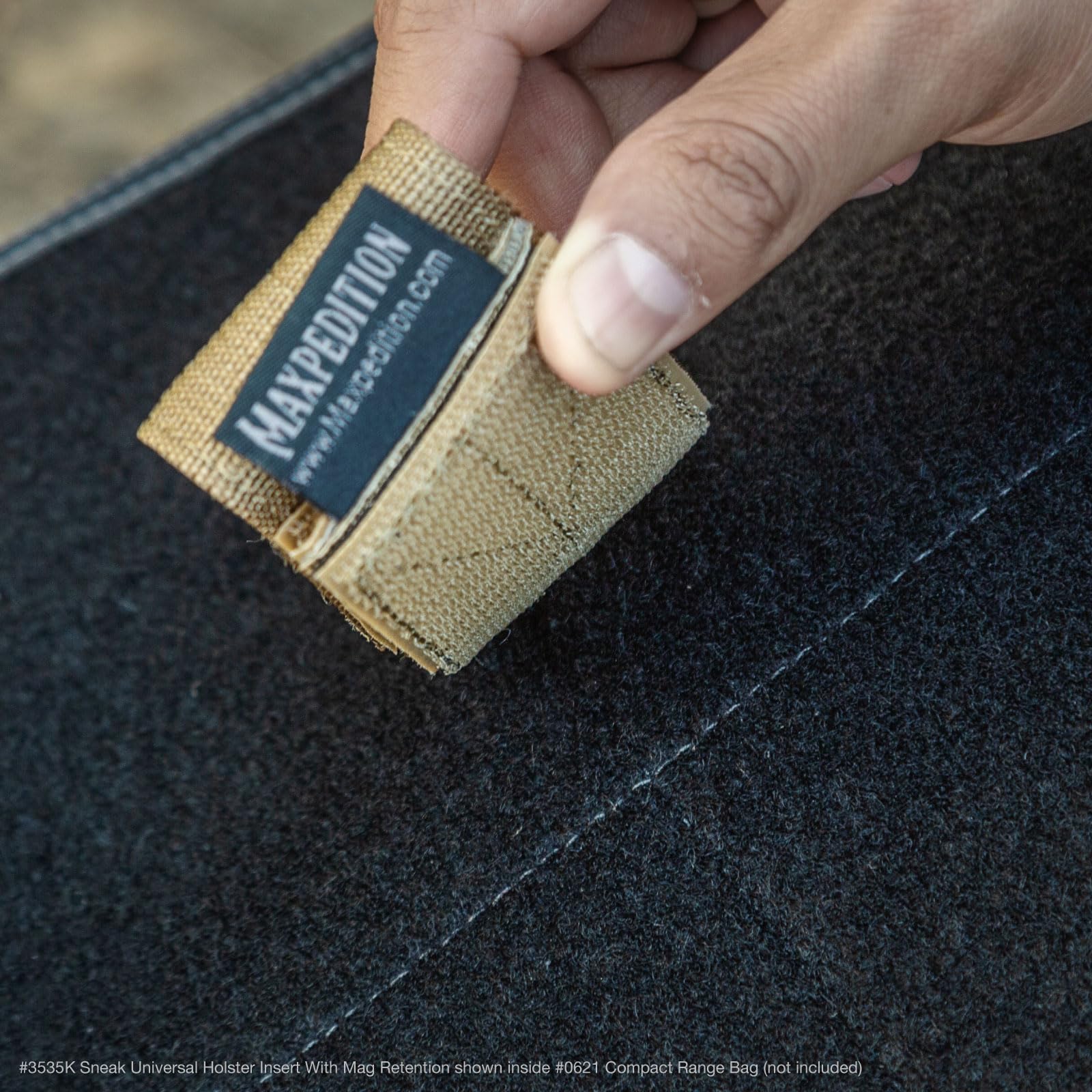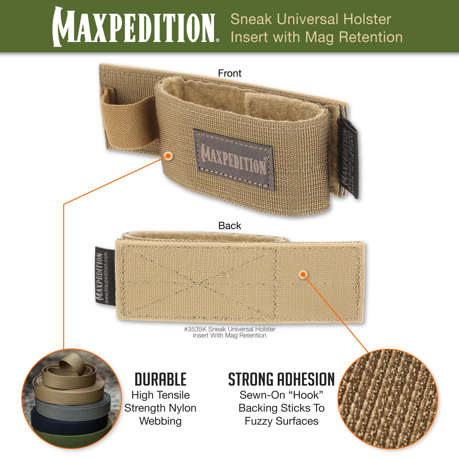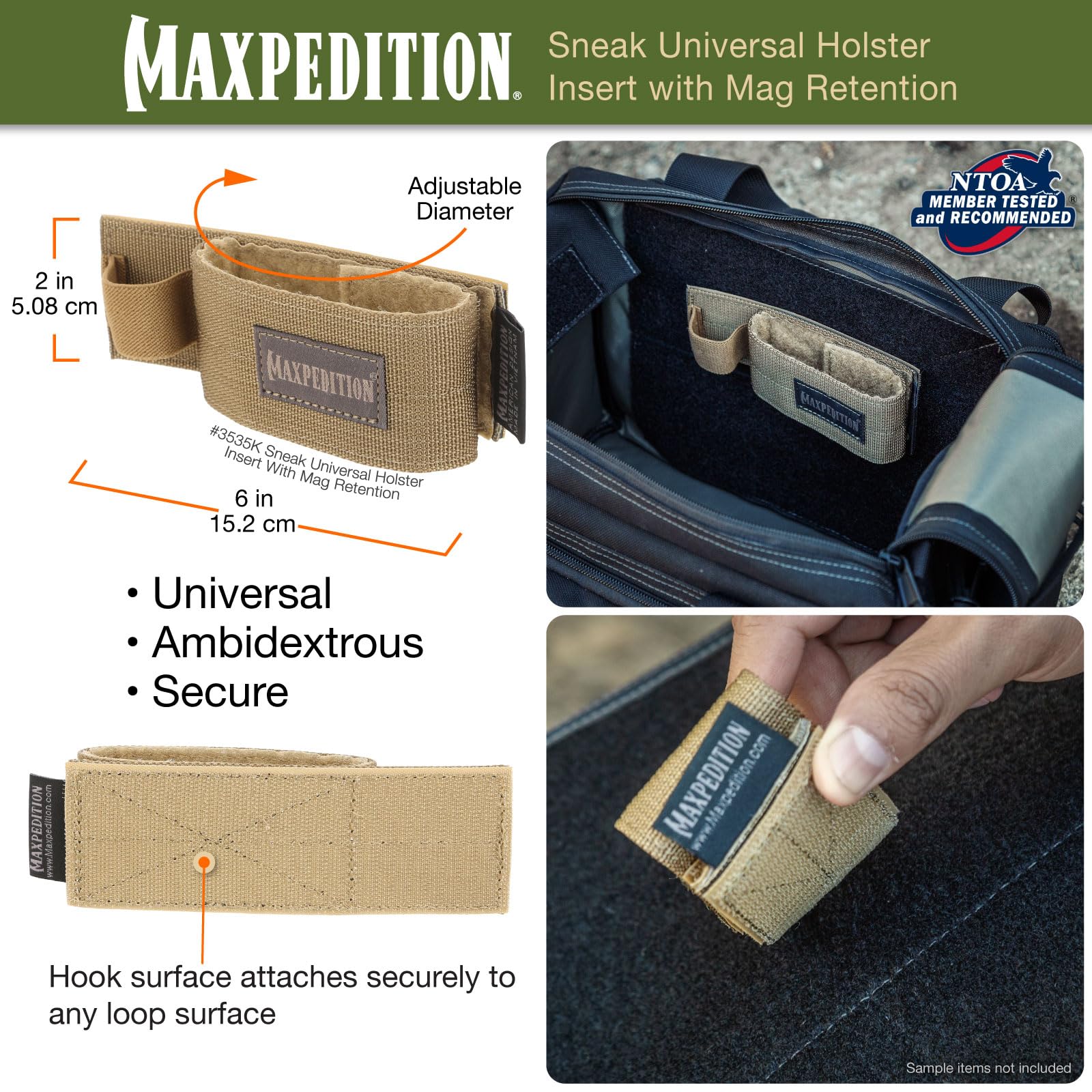 Product Details Adjustable to most popular pistol sizes, the Sneak Universal Holster Insert with mag Retention has a loop interior to protect your pistol from scratching and an elastic grip for an extra magazine. All backed by a stiffened spine with hook finish for a stable connection that allows for an easy draw. Product Feature Overall size: 6 in (L) x 2 in (H) wide x 2 in (W) Adjusts to fit most popular pistol sizes Non-directional attachment for versatility Stiffened spine for added stability Loop interior protects pistol finish Can hold other items such as tools, laptop power supply, etc.