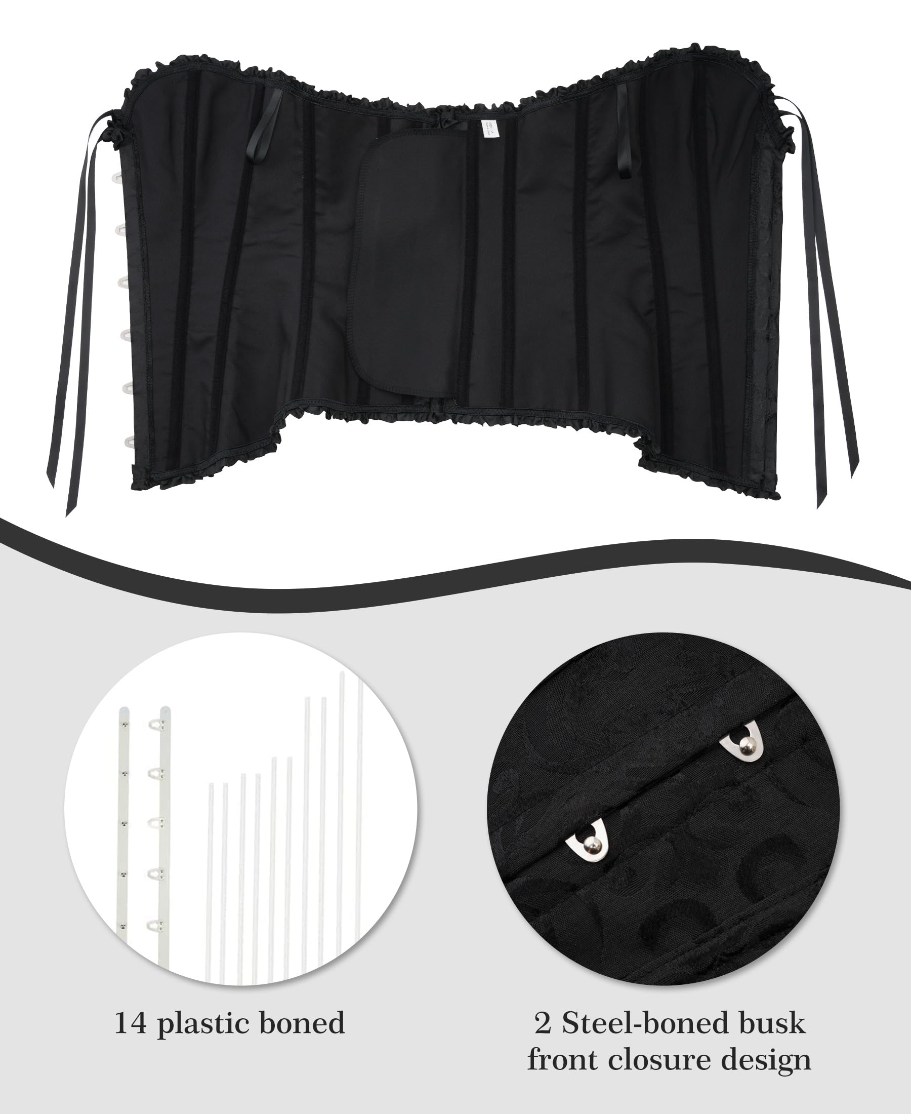 PREMIUM CRAFTSMANSHIP: Our women's bustiers & corsets are crafted with an unwavering commitment to quality. The outer shell of corset shapewear is a blend of luxurious Polyester, complemented by a pure Polyester lining that promises longevity and resilience. The stainless steel busk closure stands as a bastion of reliability, ensuring your corset black crop top remains securely fashioned, no matter the occasion.