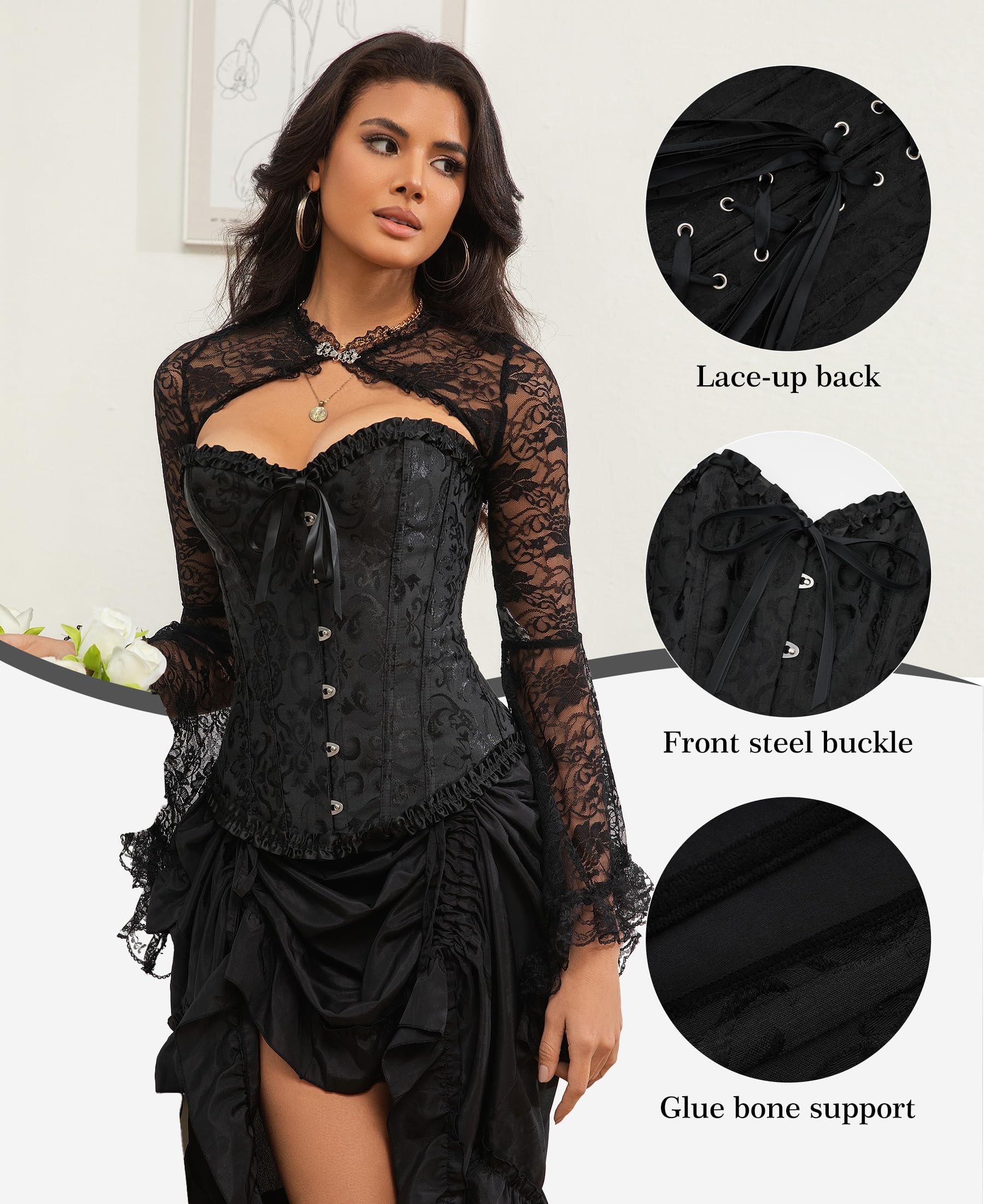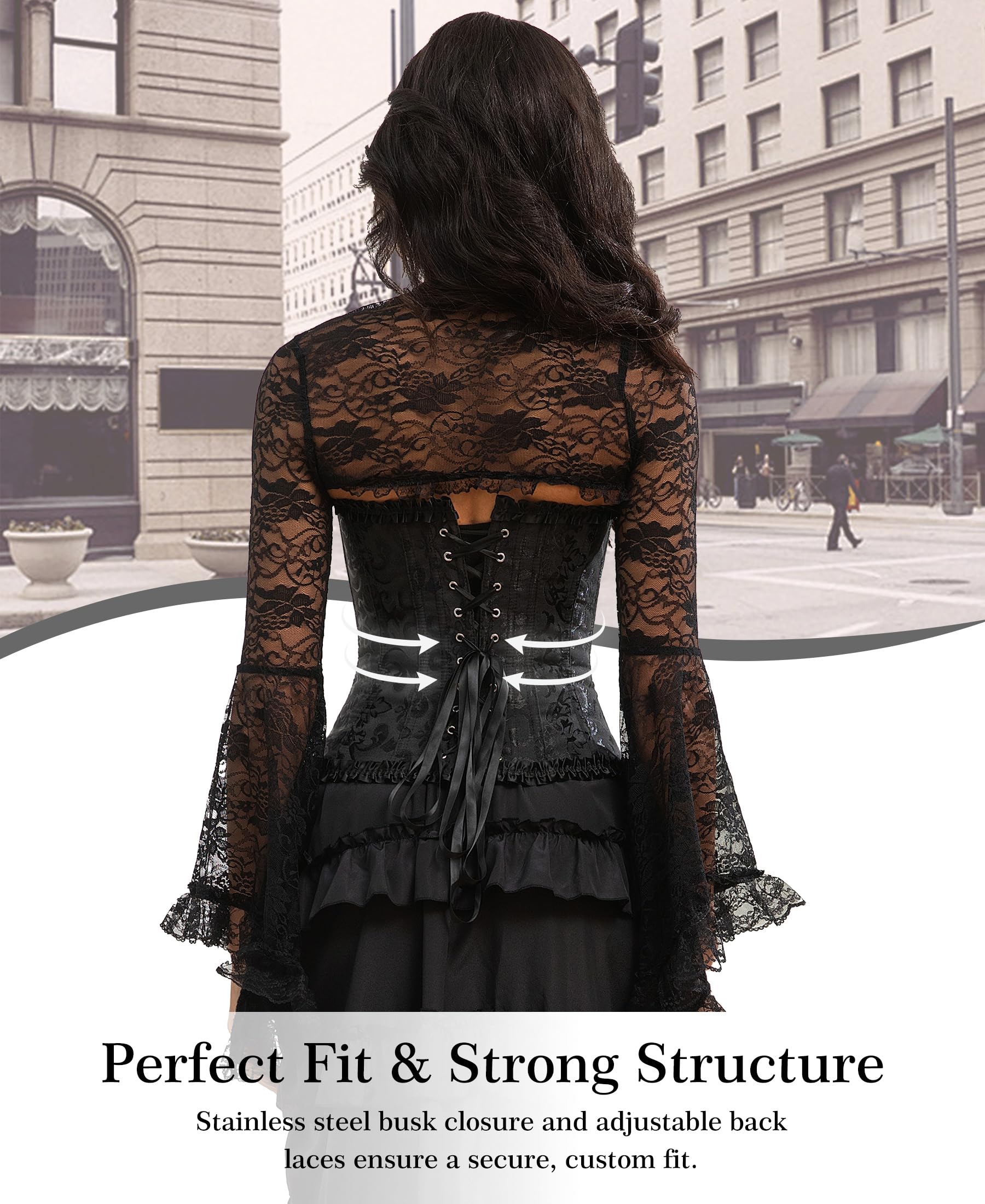 ALL DAY COMFORT: Our overbust corset top is a harmonious blend of comfort and elegance, made with materials that caress your form while ensuring freedom of movement. The waist corset unique 12 plastic bone structure is engineered to support an upright posture, reducing back strain. Designed for wearability from dawn until dusk, the waist cincher corset is the ideal everyday companion. Our lace corset top aligns with your body's needs and your heart's desires.