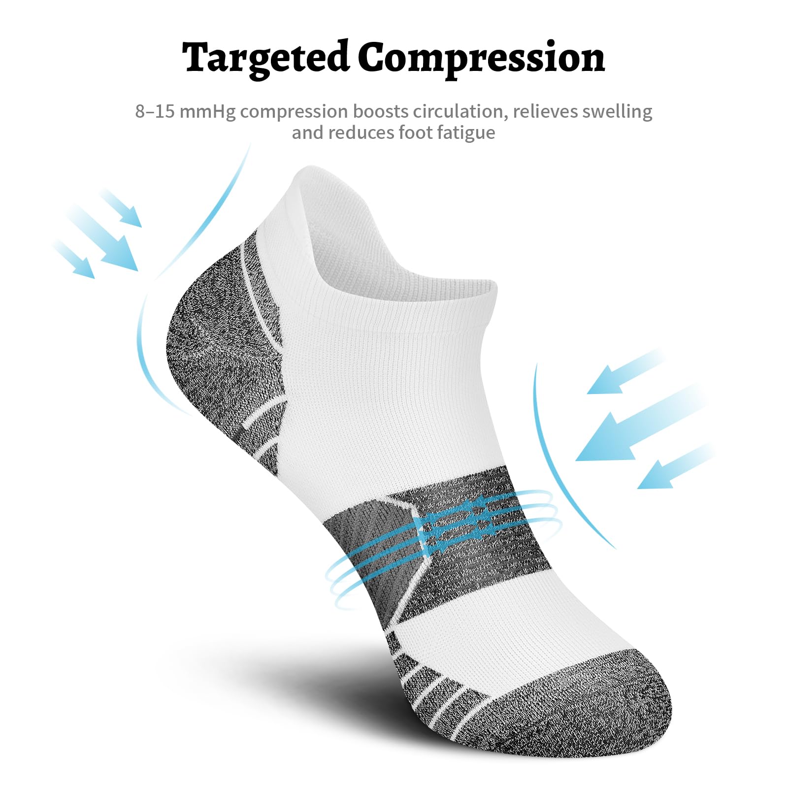 [TARGETED COMPRESSION ZONES DESIGN]: Compression is proven to improve blood flow, move faster, react quicker, and use less energy. These ankle compression socks for women have a specialized arch compression((8-15 mmHg) design that promotes blood circulation and oxygen flow, prevents cramps, swelling, plantar fasciitis and relieve foot fatigue during running