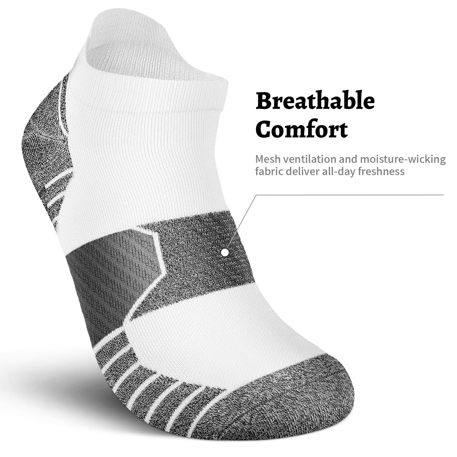 [STAY-BREATHABLE ALL DAY]: The compression ankle socks are made of breathable material. Mesh ventilation design,increase the number of breathable holes on the instep and sole of the foot, to enhance sweat wicking performance. Whether you're training, running, hiking, or working out in the gym, our athletic socks women can keep your feet dry and cool all day