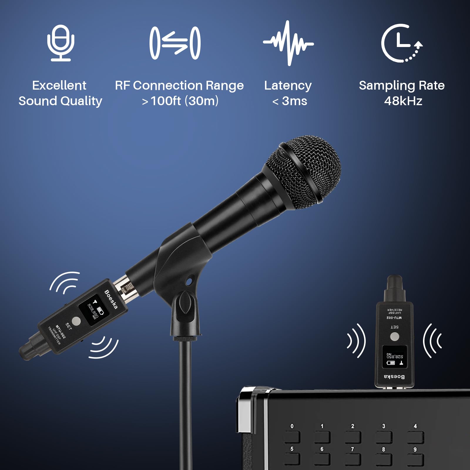 Stable Wireless Signal: The wireless microphone transmitter and receiver system utilize the frequency band 510 MHz to 560 MHz. Up to 100 ft of wireless range, you can use it freely without space limitations. Not work with condenser mic