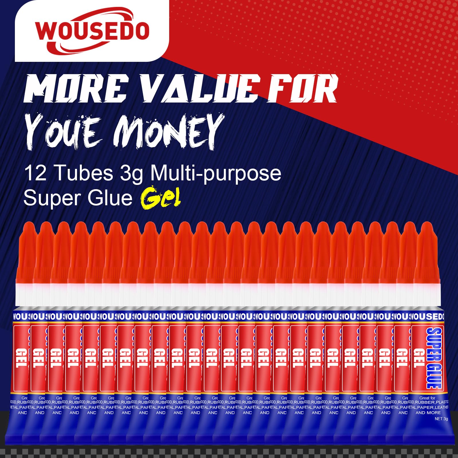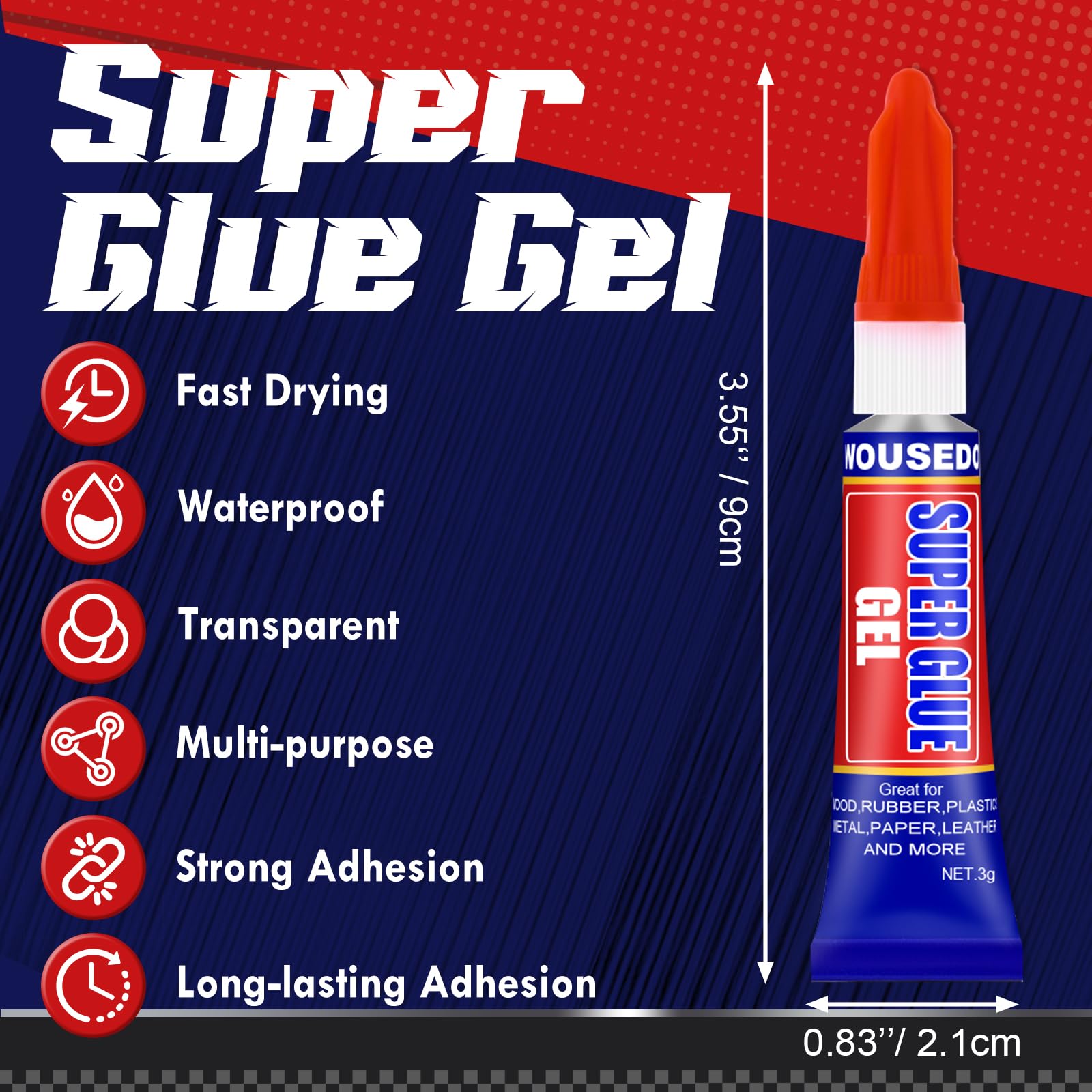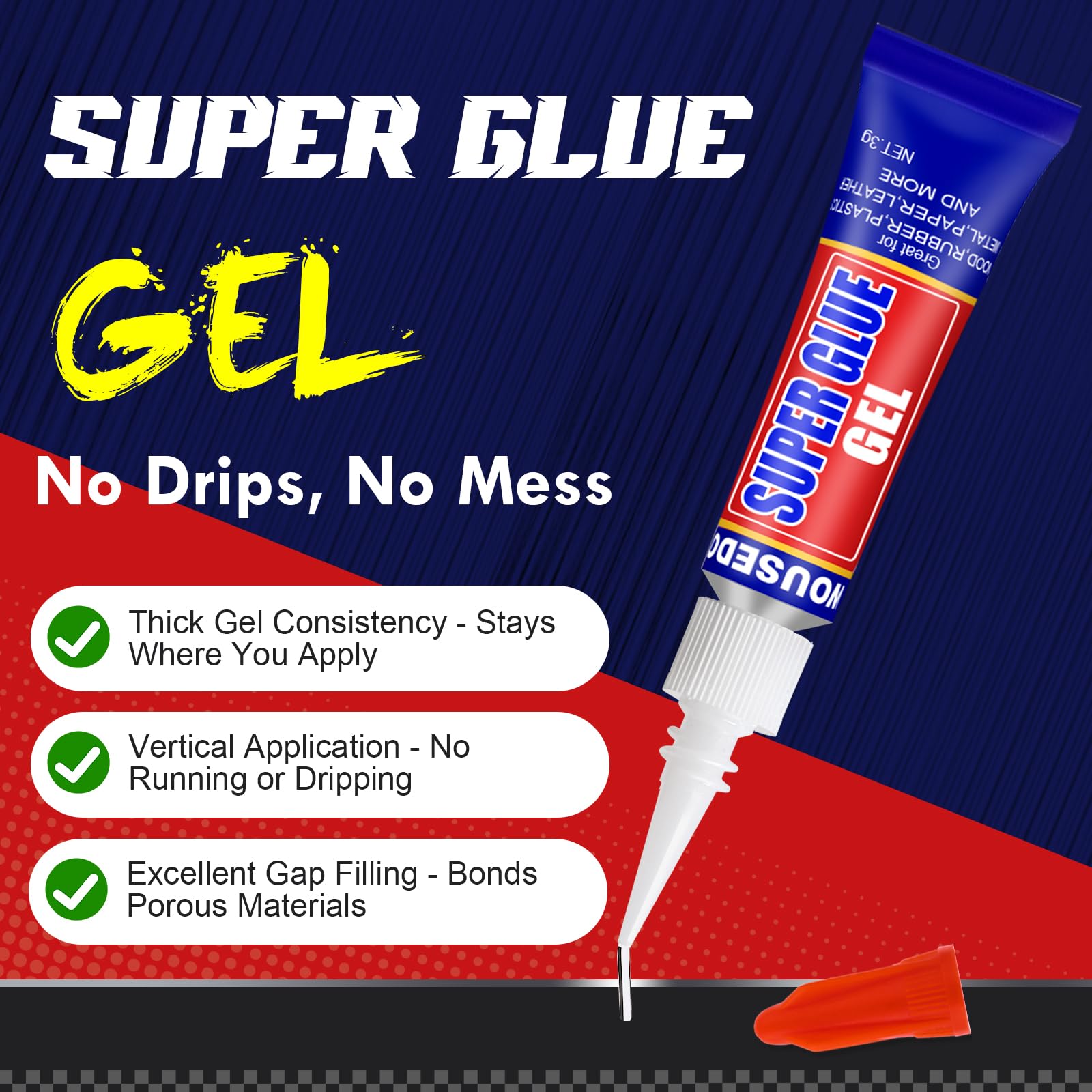 【Thick, No-Drip Gel Formula】WOUSEDO ultra-strong cyanoacrylate gel provides a thick,non-drip formula that won’t run,making it ideal for vertical surfaces and porous materials.Bonds in 15-45 seconds (full cure in 24 hours) and dries clear for seamless,professional repairs every time.