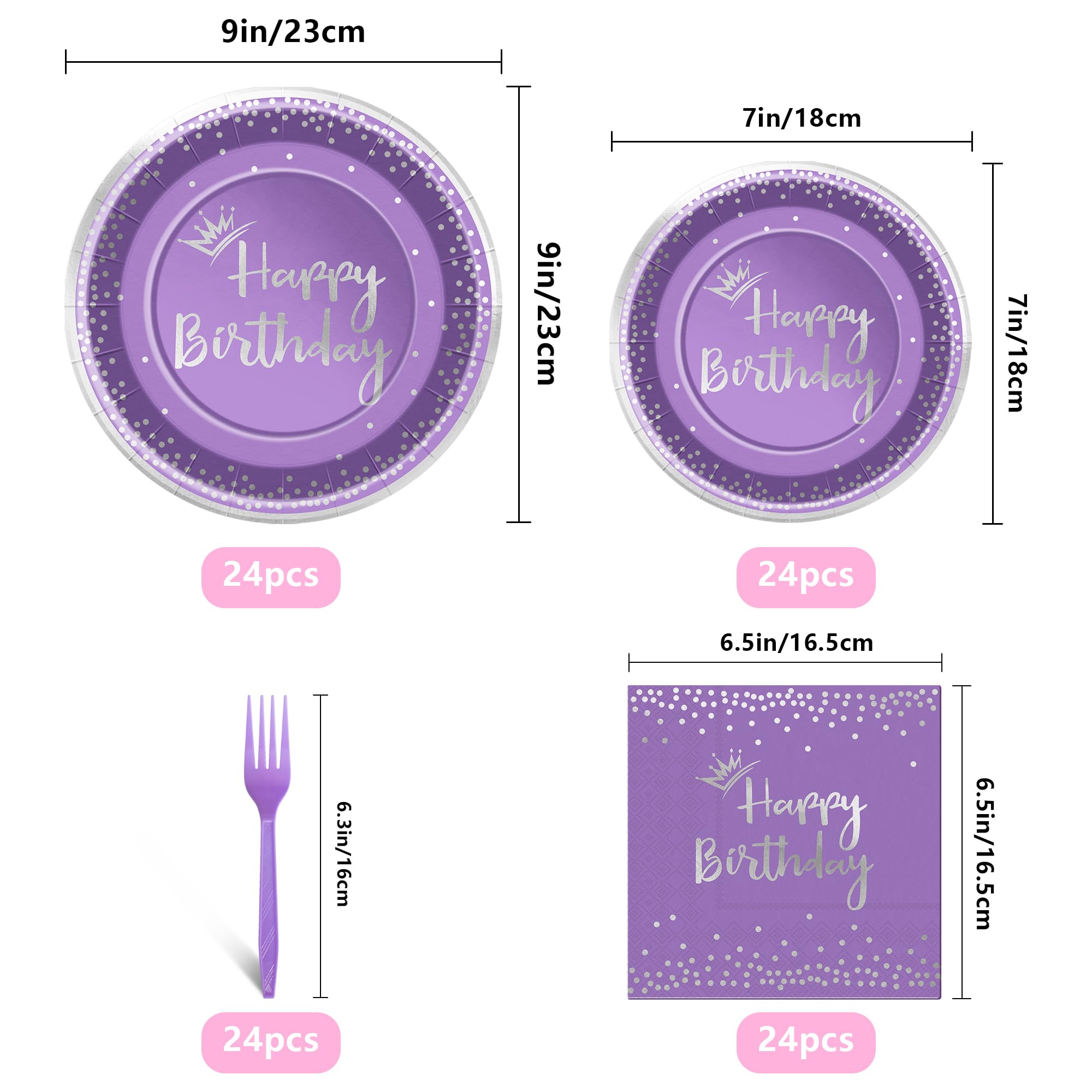 Purple Silver Paper Plates:You will receive 24Pcs 7inch dessert plates,24Pcs 9inch dinner plates,24Pcs 6.5 x 6.5 inch napkins and 24Pcs plastic Forks.