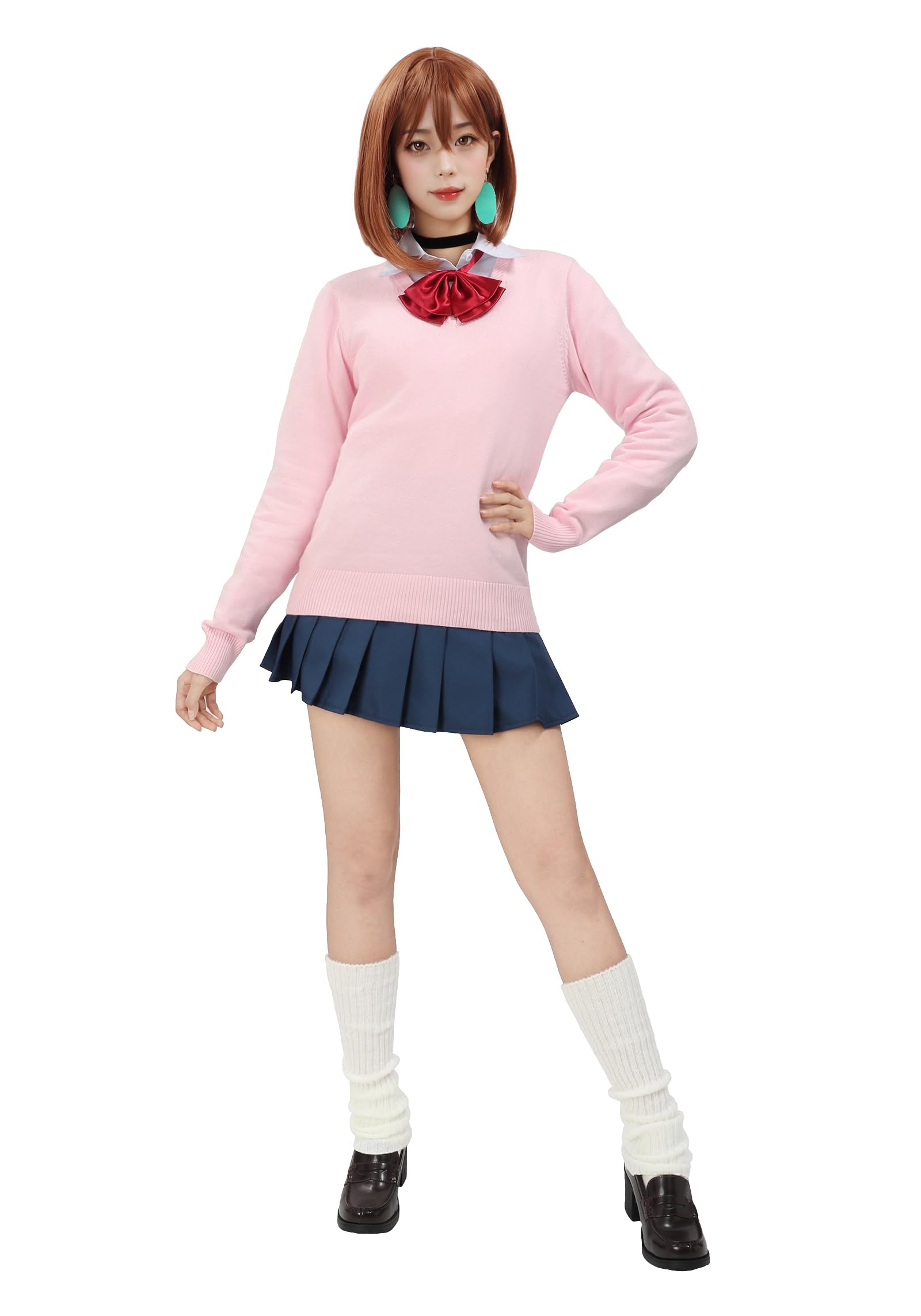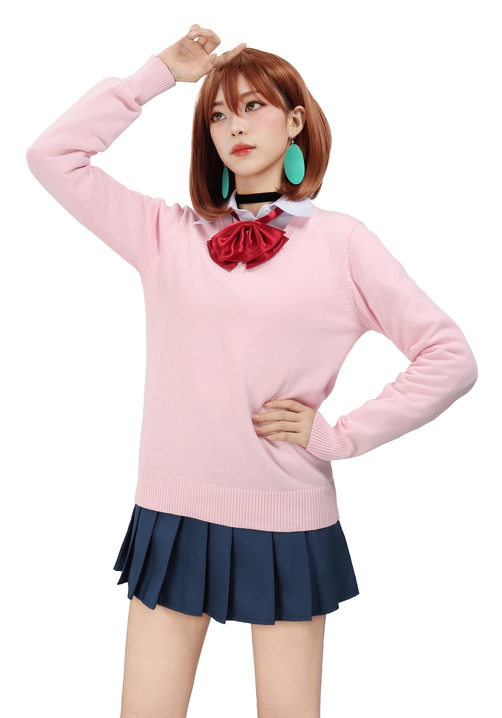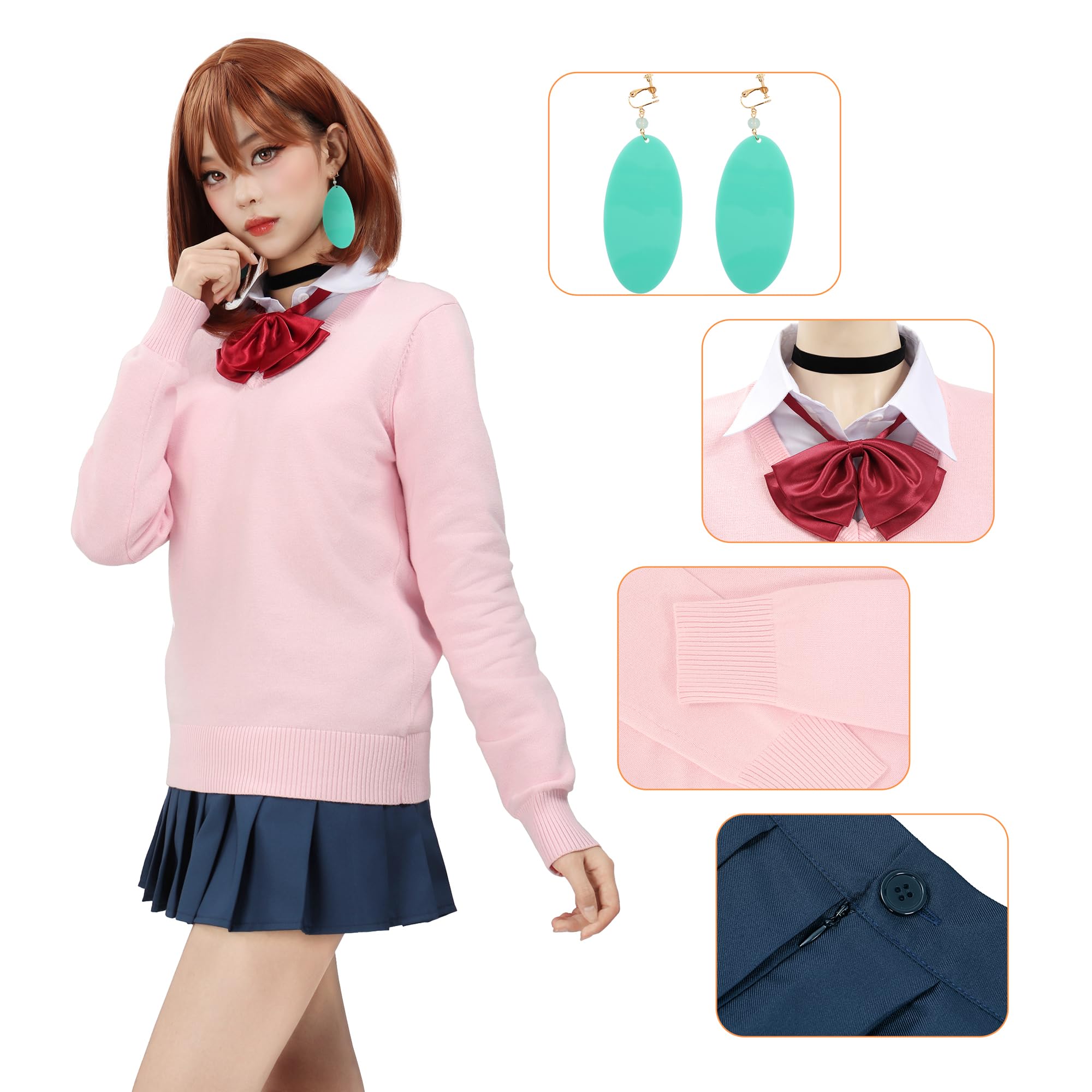 Package Includes: White shirts, pink sweater, navy skirt, red bow, earrings and neck choker (Excluding the wig)