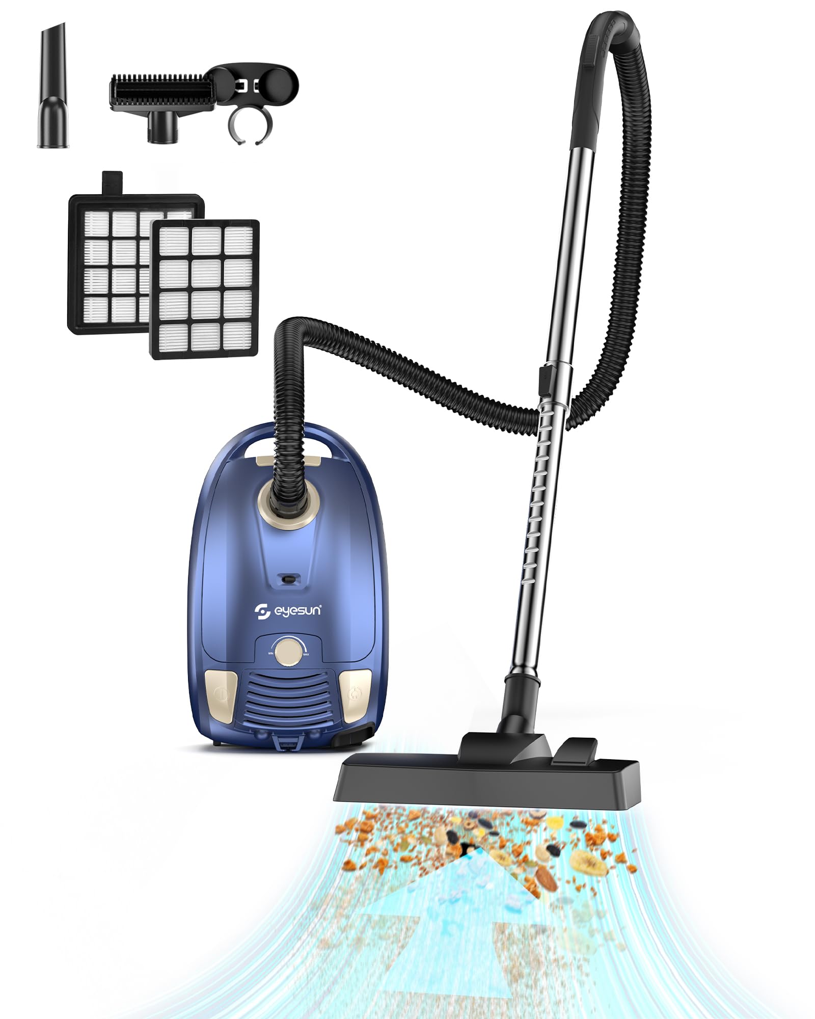 Bagged Canister Vacuum Cleaner,1400W Powerful High-Suction Bagged Canister Vac with 3.7QT Dust Bags,Pop-N-Go Brush,HEPA Filter,Dual Motors&4 Cleaning Tools,Perfect for Low-Pile Carpets&Hard Floors