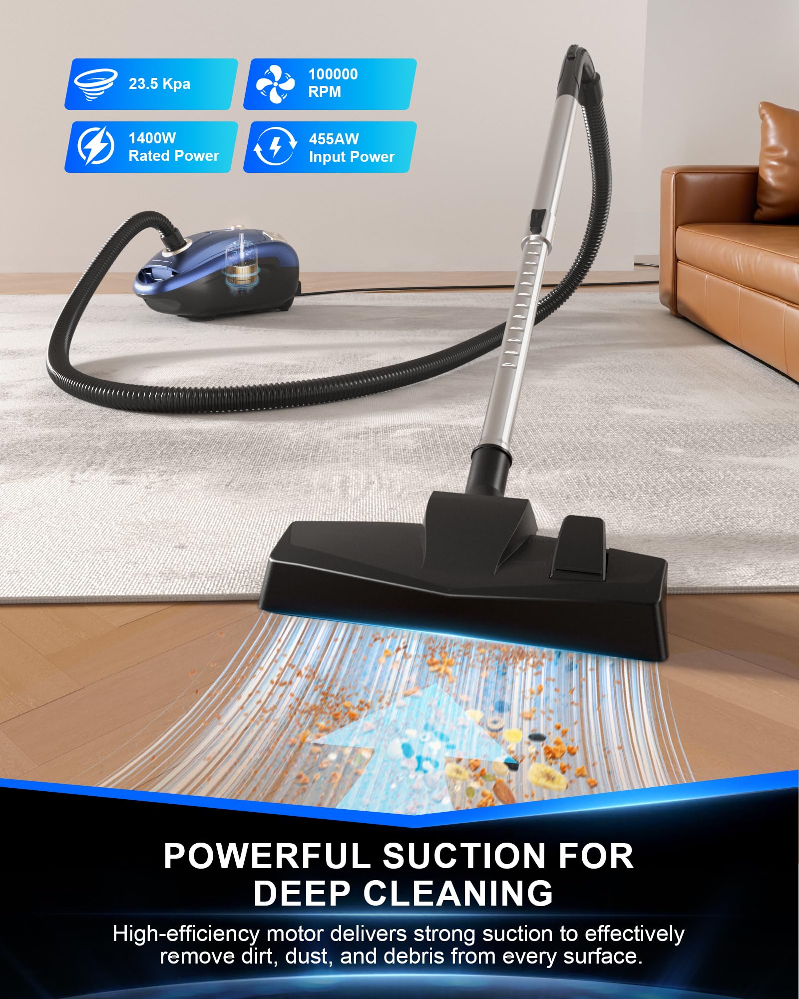 1400W/23.5KPa Powerful, Whole-Home Cleaning: This bagged canister vacuum cleaner features a high-efficiency motor that delivers strong suction power to effectively remove dust, dirt, pet hair, and debris from carpets, hard floors, and stairs. Perfect for thorough, all-around home cleaning.