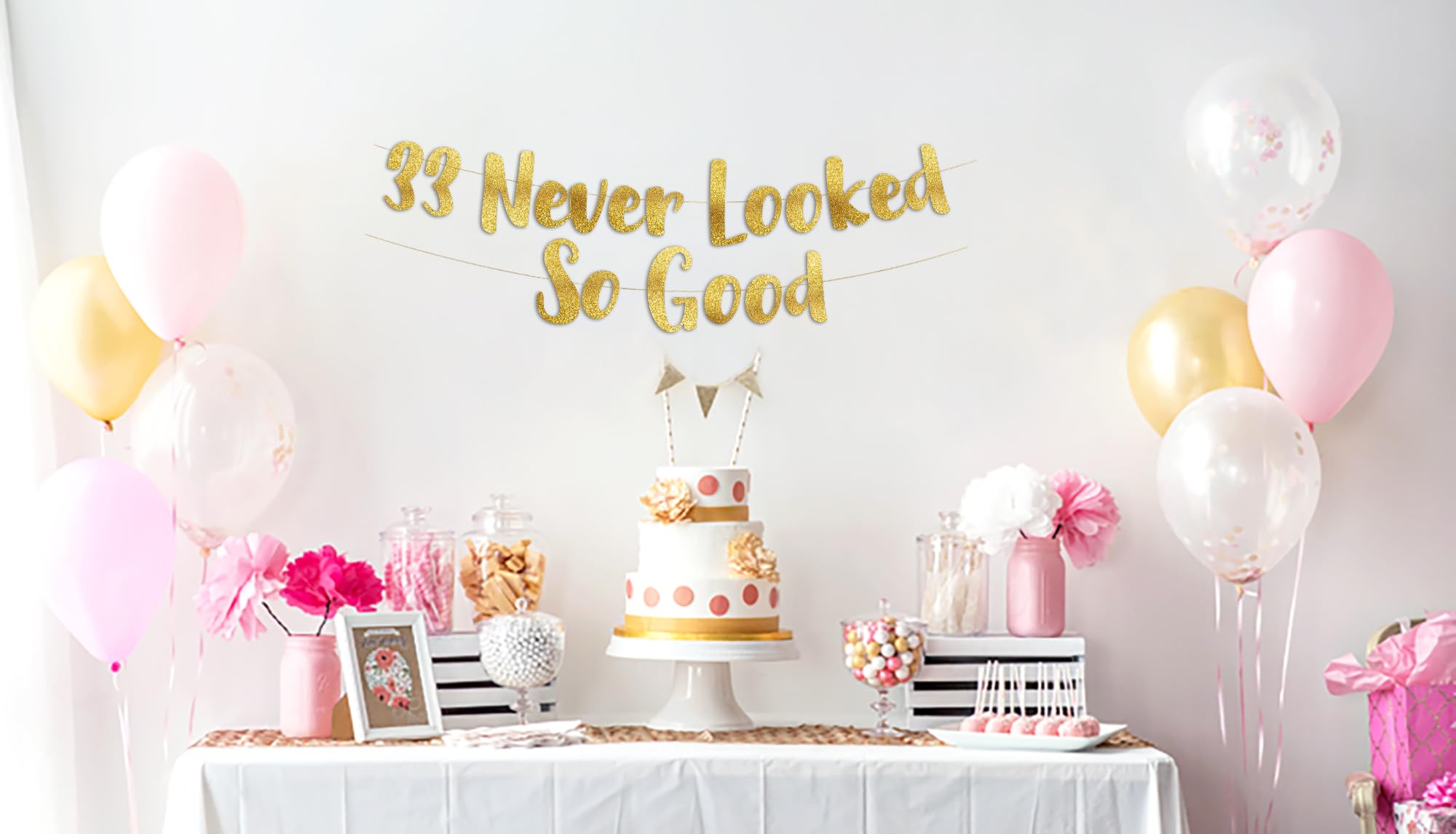Congrats on 33 years of excellence! This gold glitter banner is the perfect decoration to add a touch of classy decor and welcome your guests to the occasion.