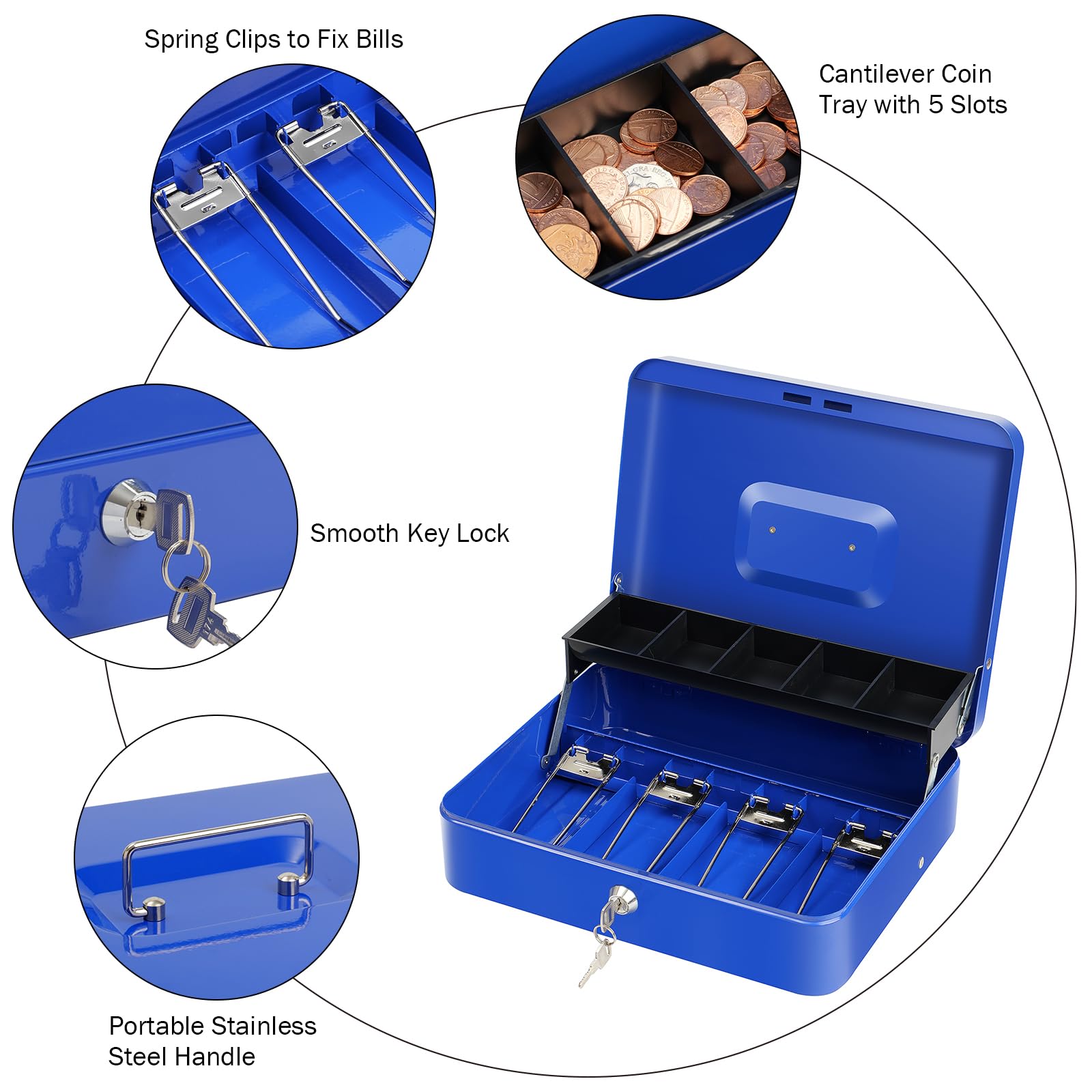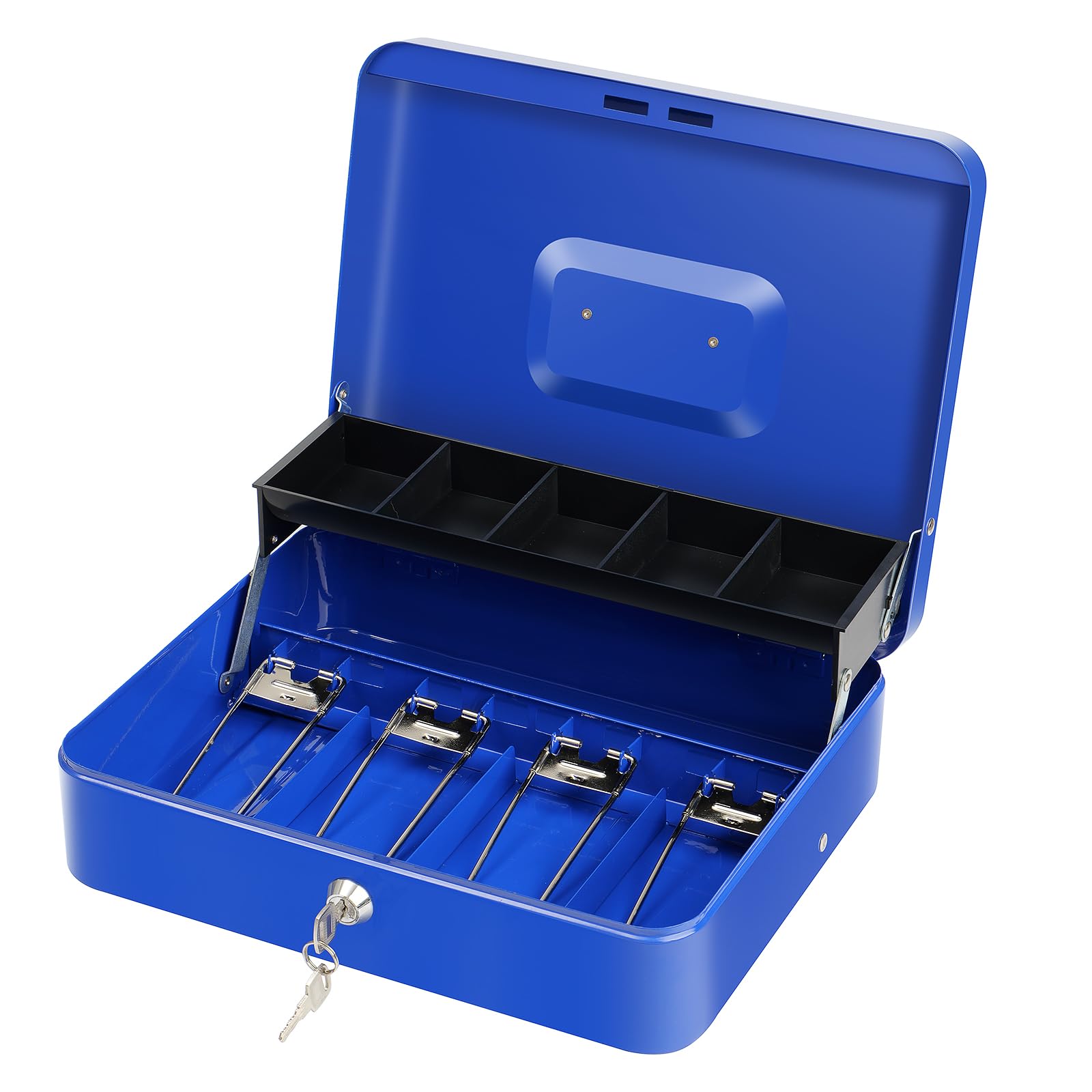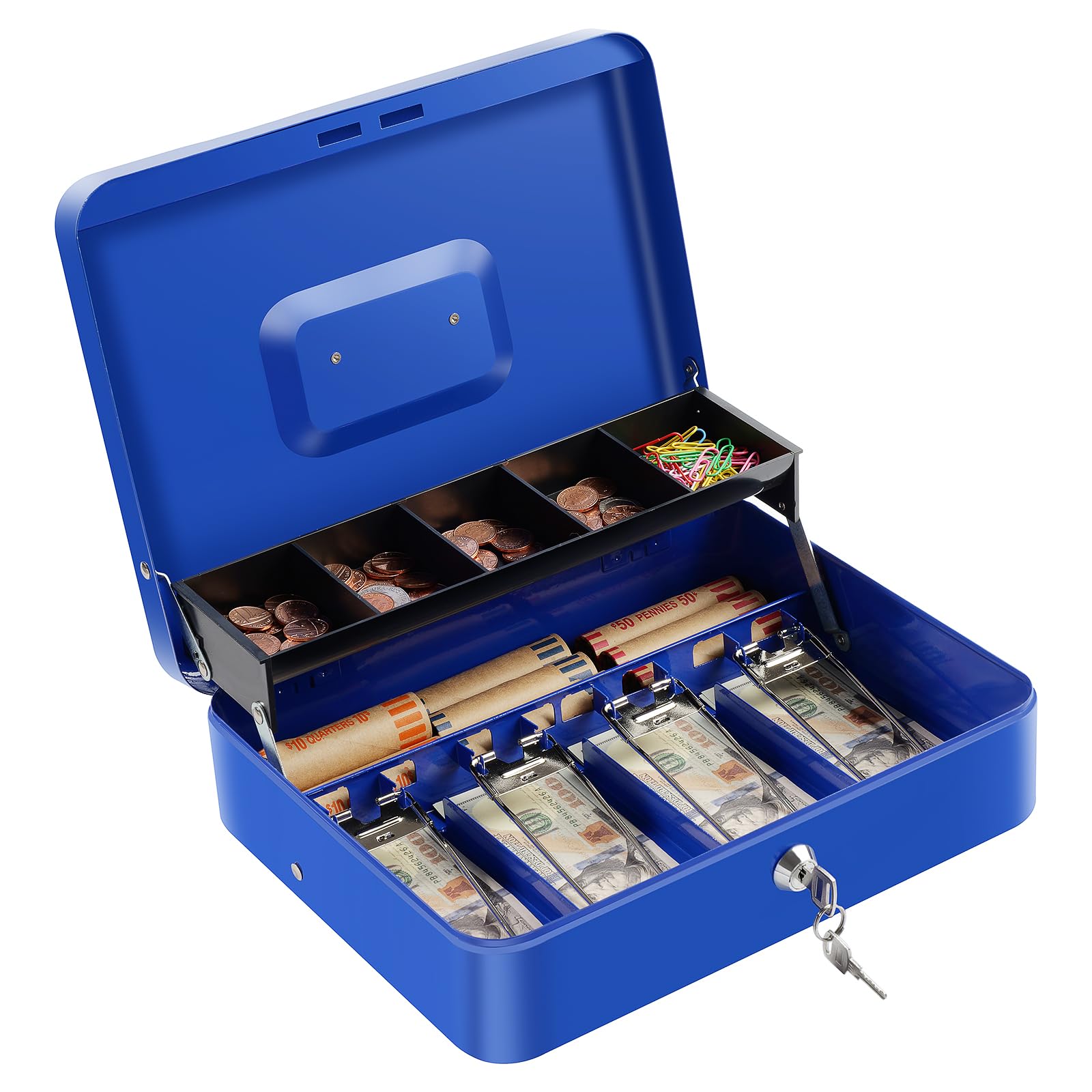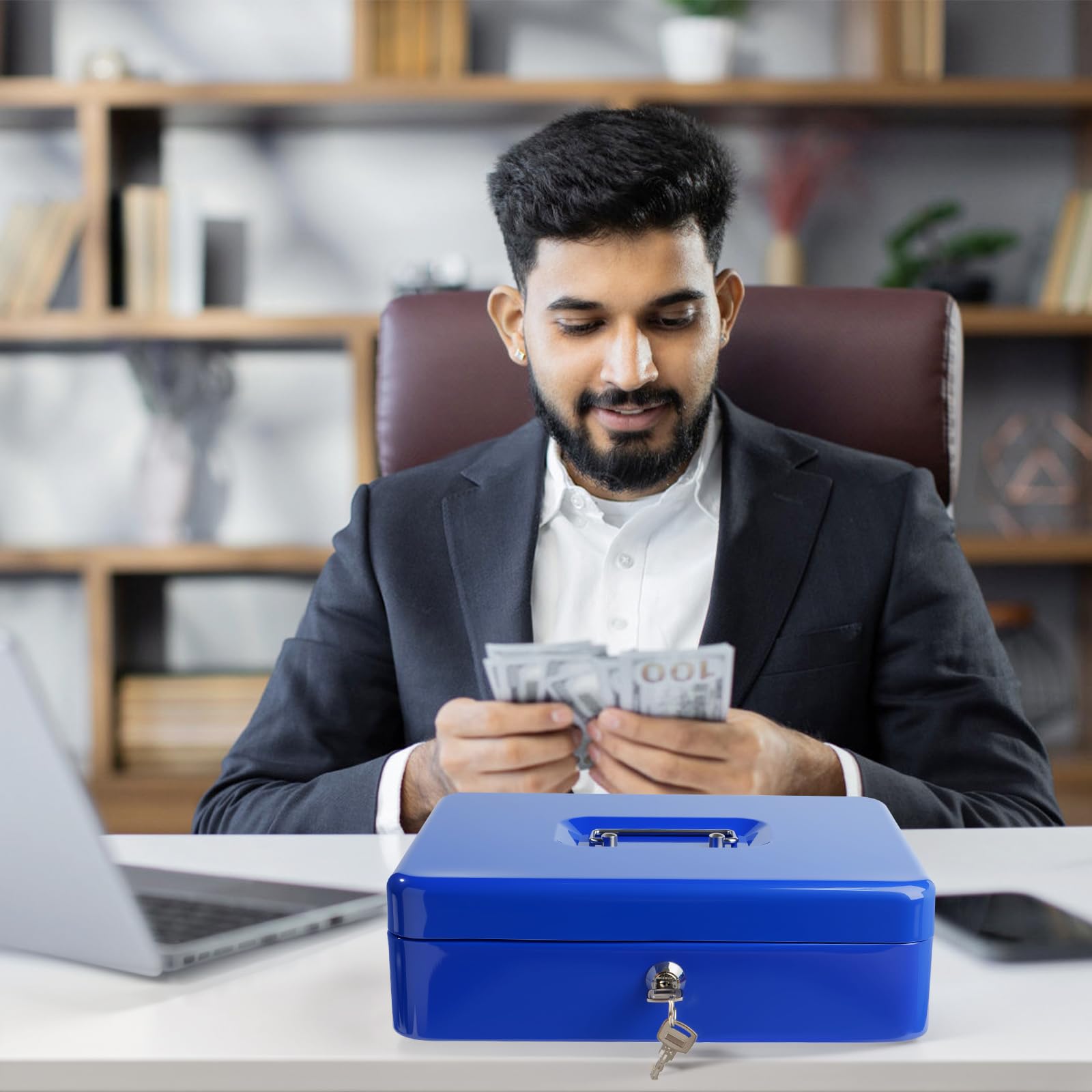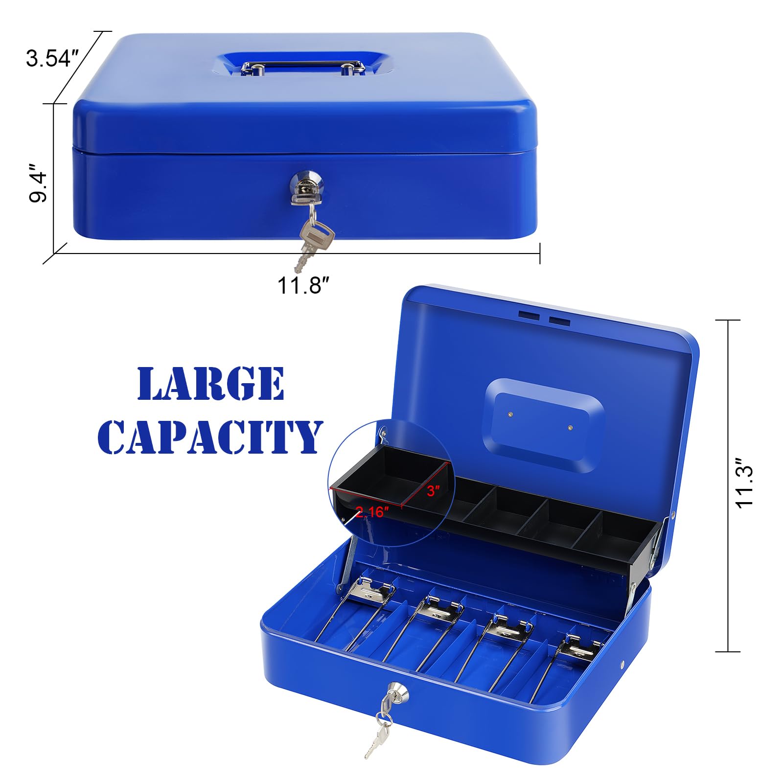 VERSATILE CASH LOCK BOX: Measuring 11.8" x 9.4" x 3.54", our metal cash box with key is ideal for daily cash organization, yard sales, garage sales, craft shows, or use as a money saving box, change box, cash drawer, cash register for small businesses