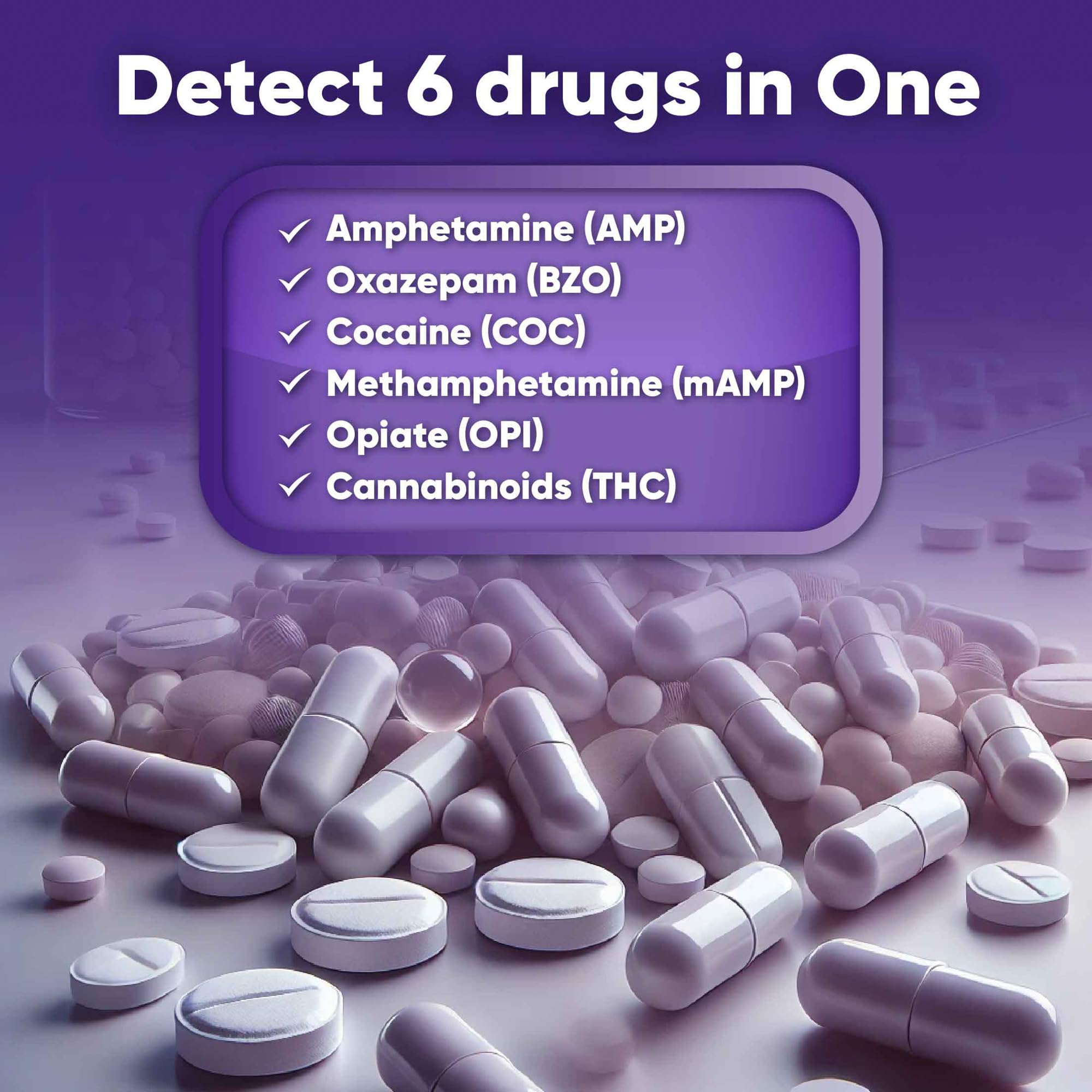 Accurate and Reliable - 510(k) Cleared for Home Use (OTC Use) and professional use. Over 99% accurate in detecting 6 drugs according to the recommended cut-off level: THC-50ng/mL; OPI-2000ng/mL; AMP-1000ng/mL; COC-300ng/mL; BZO-300ng/mL; MET-1000ng/mL.