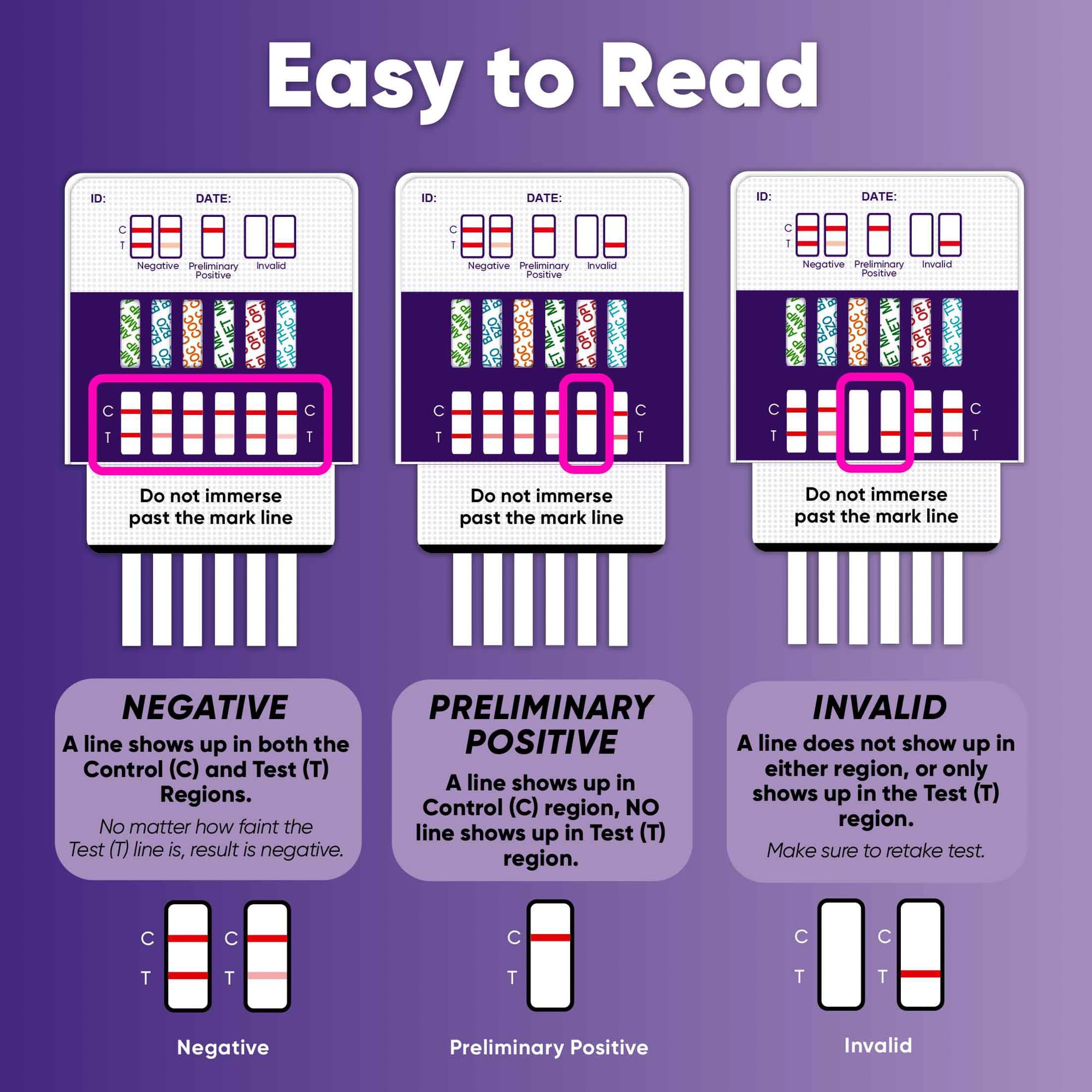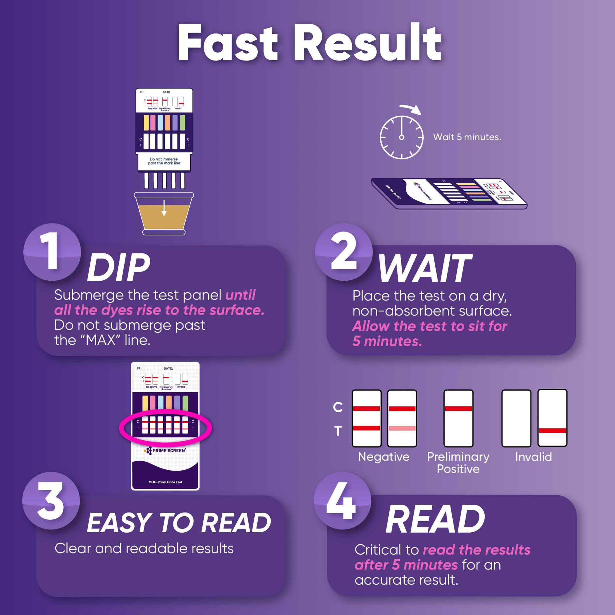 Easy and Fast - Dip the test in urine for 10 seconds and read the result in 5 minutes. 2 lines appears if clean; 1 control line only appears if not clean.