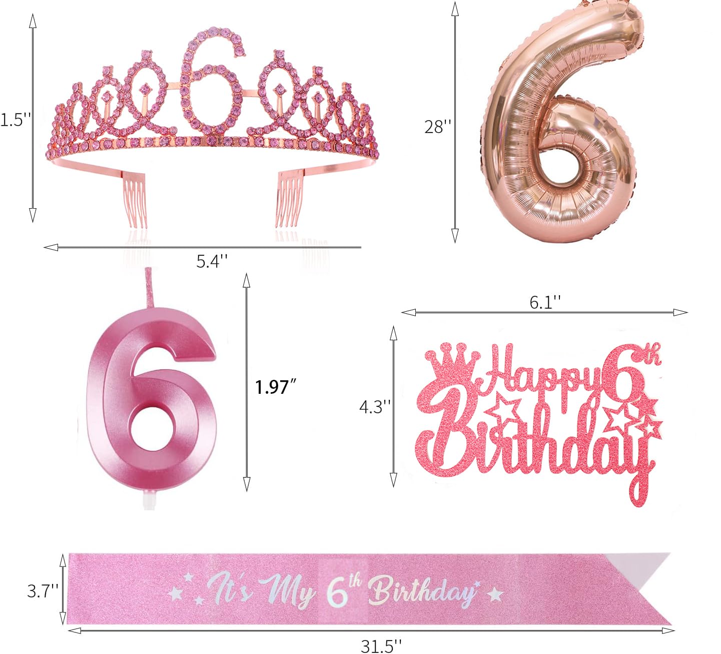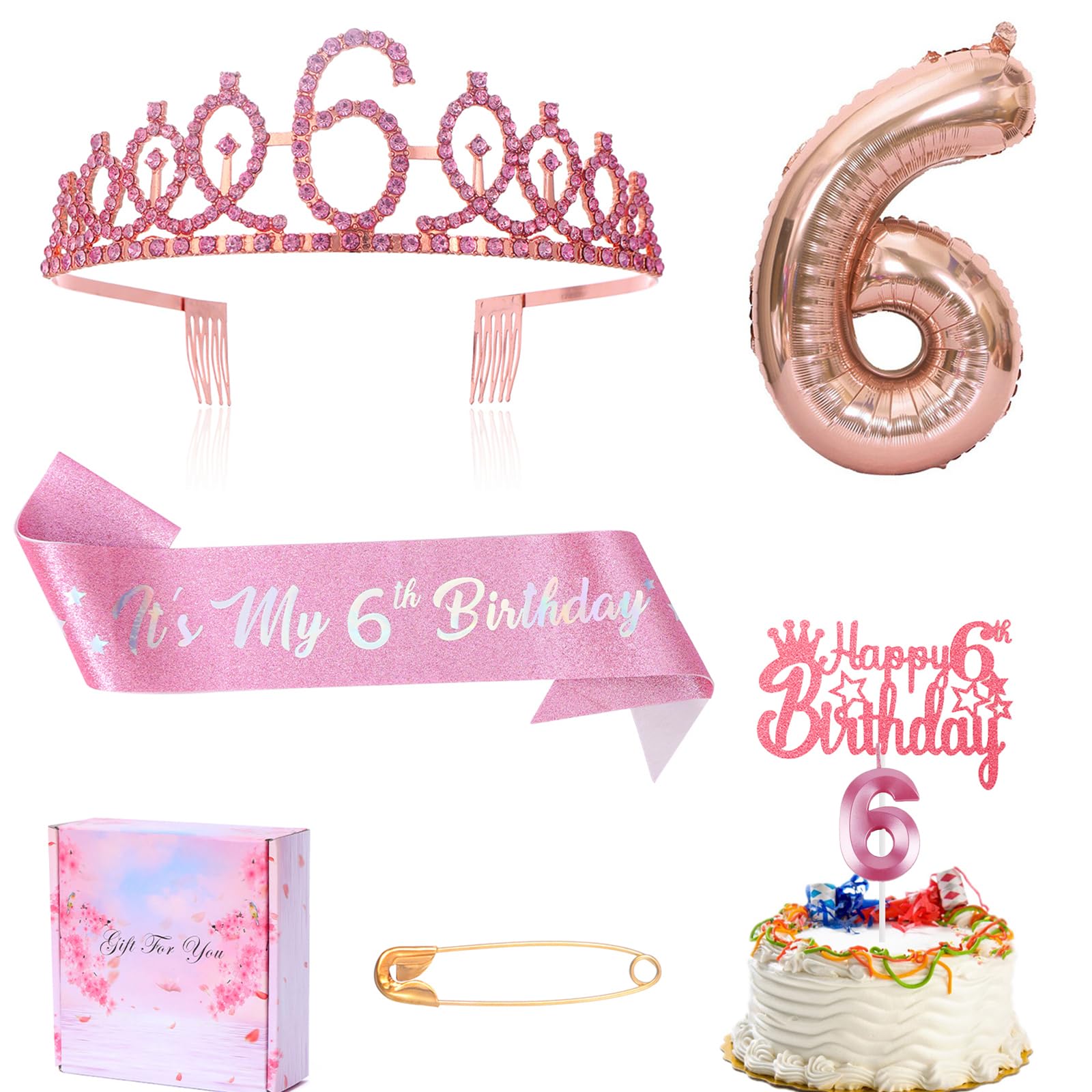【Package Include】Pink 6 Birthday Candle,Rose Gold 6 Birthday Sash, 6 Birthday Crown/Tiara, Happy 6th Birthday Cake Topper, 32inch Number 6 digital come with a pink gift box;All you needs for a girl's 6th birthday party decor are have;
