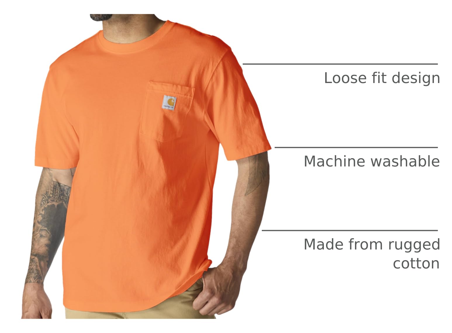Description Elevate your everyday essentials with our K87 Men's Heavyweight Crewneck T-Shirt, the perfect blend of comfort, style, durability and safety. Made from 100% rugged cotton, this tee offers a soft, breathable feel that keeps you comfy all day long, whether you're at work or enjoying casual downtime. Designed with a loose fit it provides a boxy silhouette that ensures both style and freedom of movement. This plain, basic t-shirt features a front pocket, adorned with our iconic patch, for added convenience and practicality. Its heavyweight construction delivers a thick, quality fabric that was built to handle tough conditions, making it ideal for work or outdoor activities. The soft cotton keeps you cool and comfortable, while the loose fit makes it a versatile choice for any occasion. Available in sizes XLT and XL, and a variety of colors including neon high vis, this shirt is perfect for big and tall men who need a more spacious fit. Whether youβre looking for an essential piece for your work wardrobe or a stylish, comfy tee for everyday wear, this t-shirt delivers in both fashion and function. Comfortable, durable, and timelessβthe Carhartt K87 is a must-have for every manβs wardrobe.