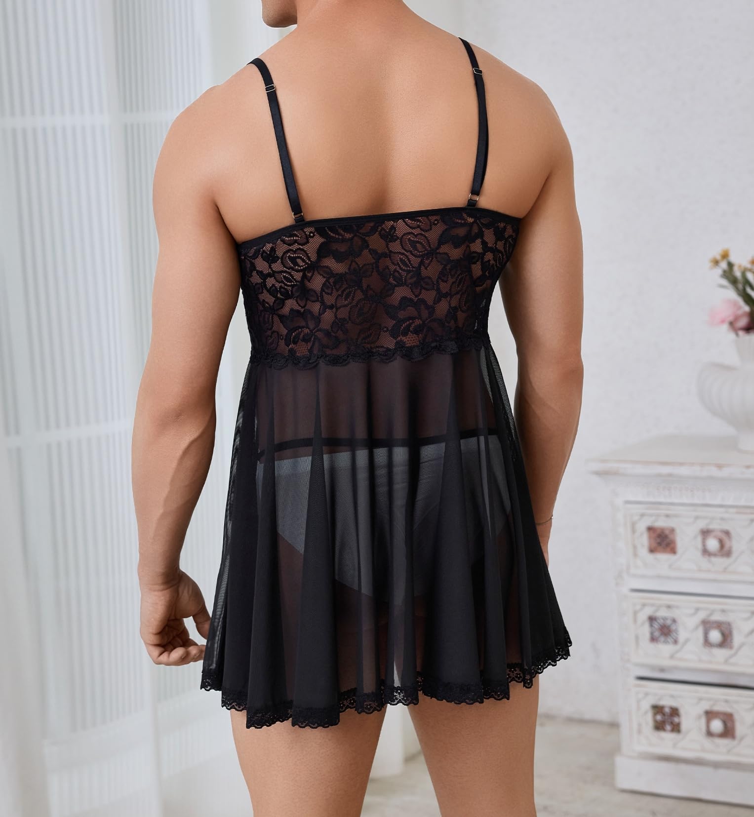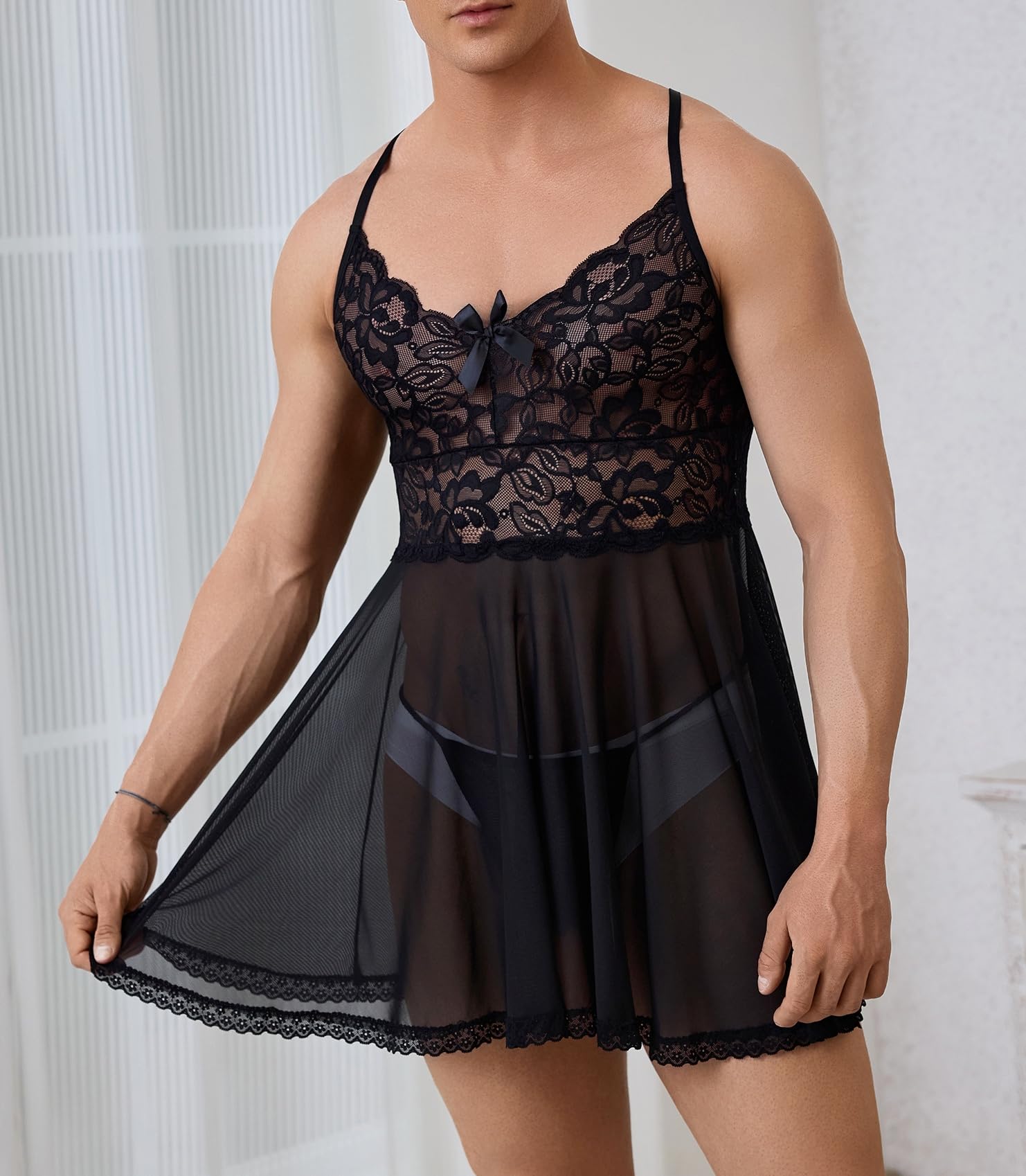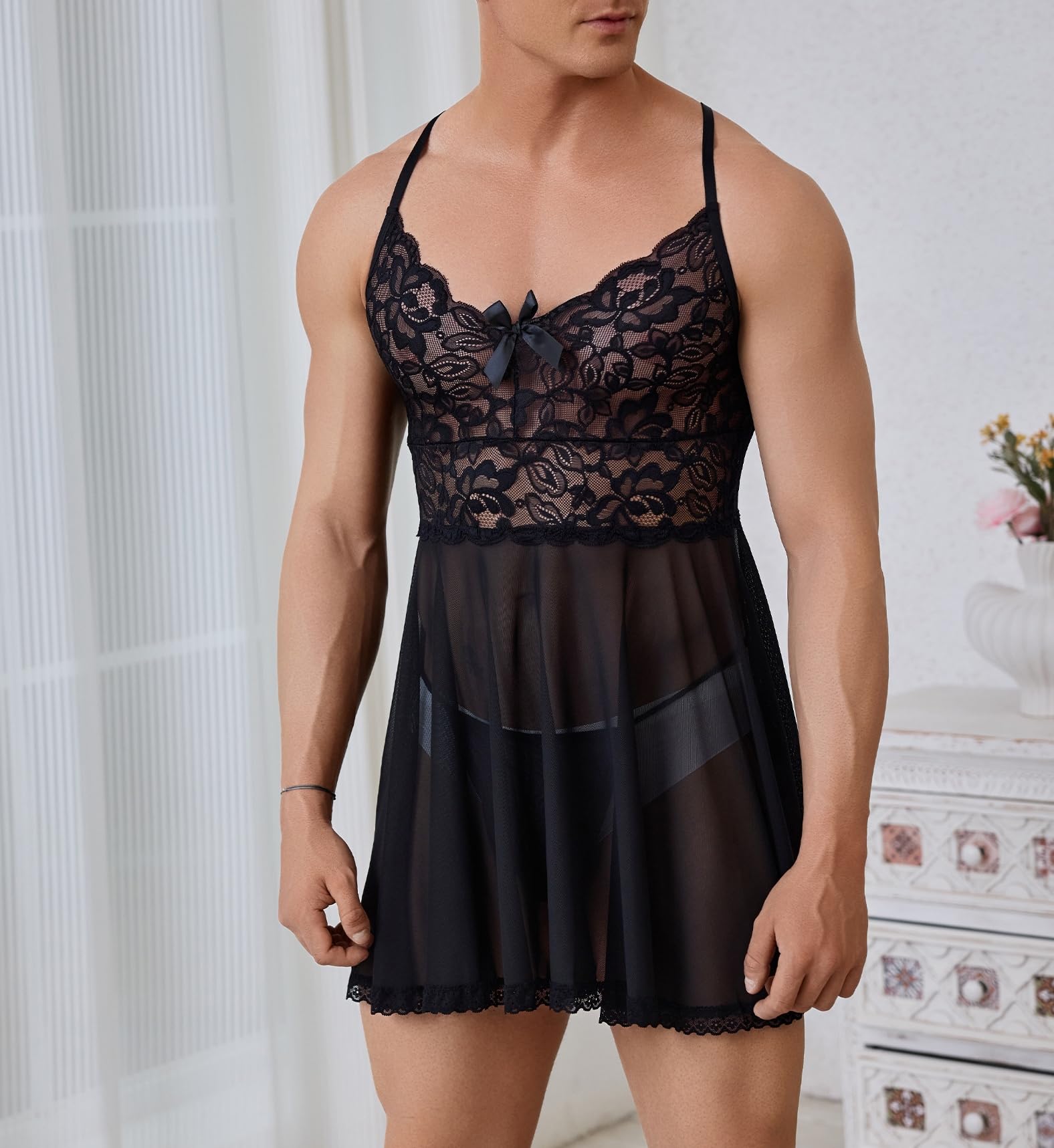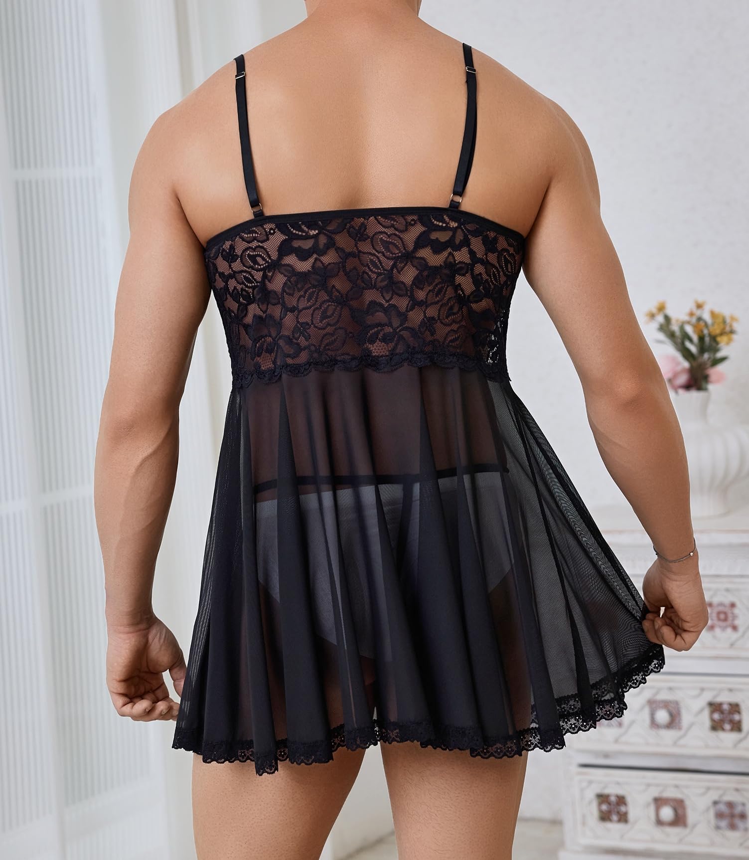 Design: Mens sissy lingerie outfits, sissy underwear for men sheer lace nightdress mesh nightgowns, sissy crossdress lingerie nightwear for men, spaghetti strap sissy lace mesh lingerie dress for men, floral lace and mesh spliced design, sheer see through, sissy night dress for men. With adjustable straps for a better comfortable fit. Sheer mesh nightdress robe for men, with matching g-string panties,as nightwear or sleepwear.