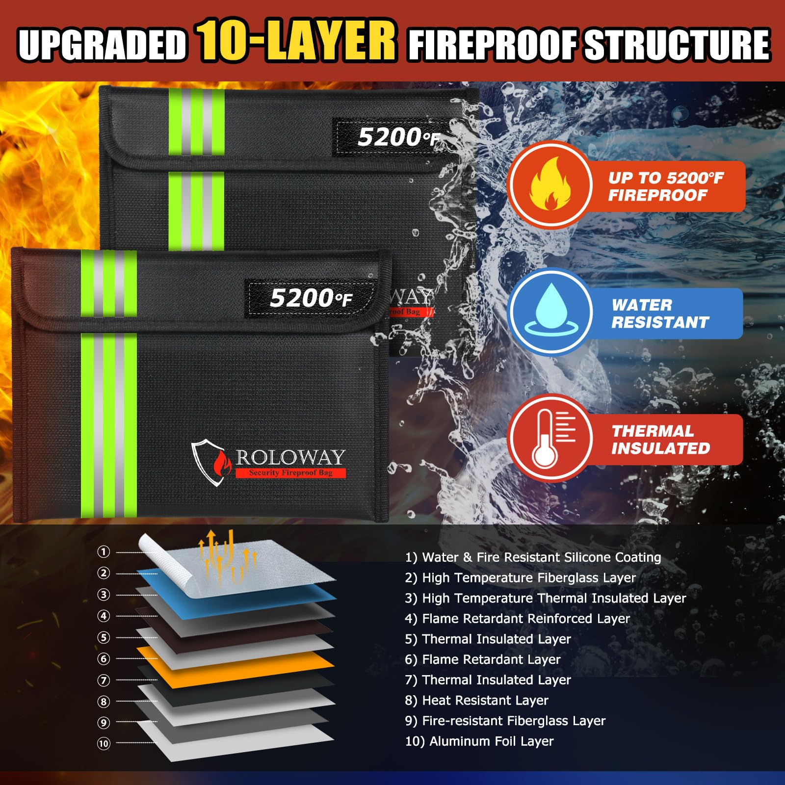 [ADVANCED 10-LAYER FIRE PROTECTION UP TO 5200°F]: Our fire proof bag for documents feature an enhanced structure, comprising a Silicone Coating Layer, Fireproof Fiberglass (x3), Flame Retardant Layers (x2), Thermal Insulation Layers (x3), and a reflective ALUMINUM FOIL LAYER. This design effectively minimizes heat transfer. Designed to endure temperatures up to 5200°F for a defined period, our fireproof cash bag provides you with vital time to retrieve your valuables in case of a fire.