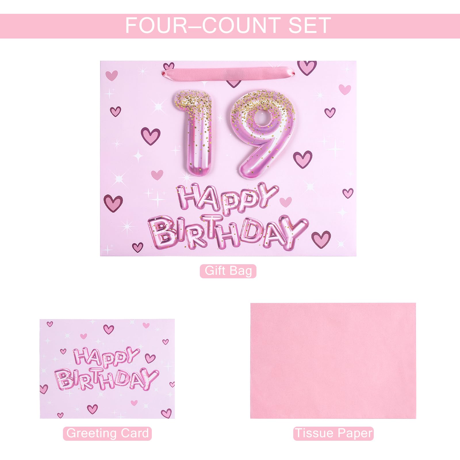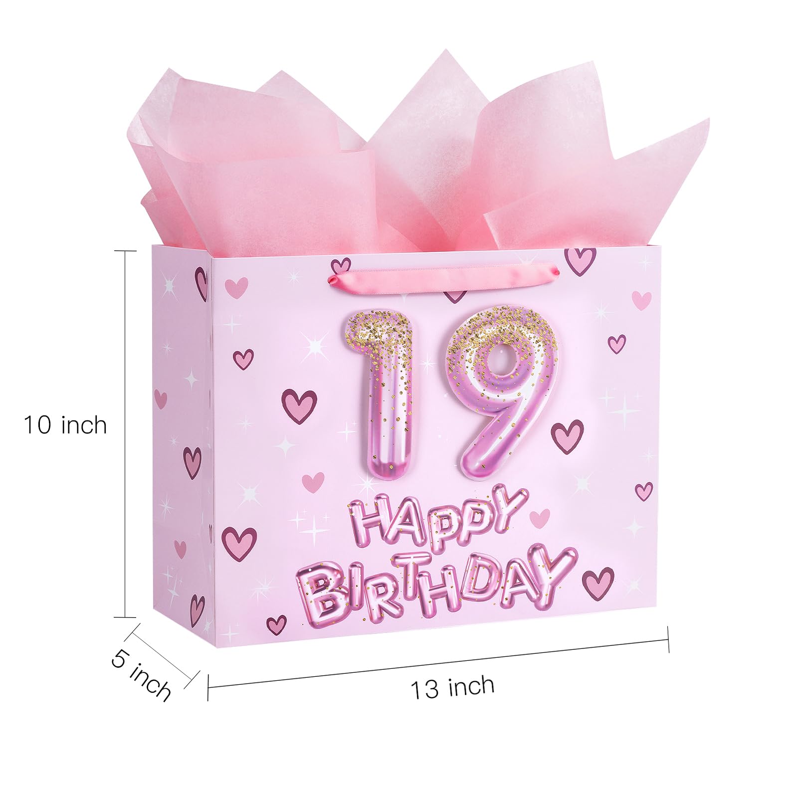 BIRTHDAY DESIGN: Gift bag printed 3D pink number 19 balloons, hearts and "HAPPY BIRTHDAY" text on pink background comes with nice ribbon handles and supportive reinforced bottom, making it perfect for girls' celebrations