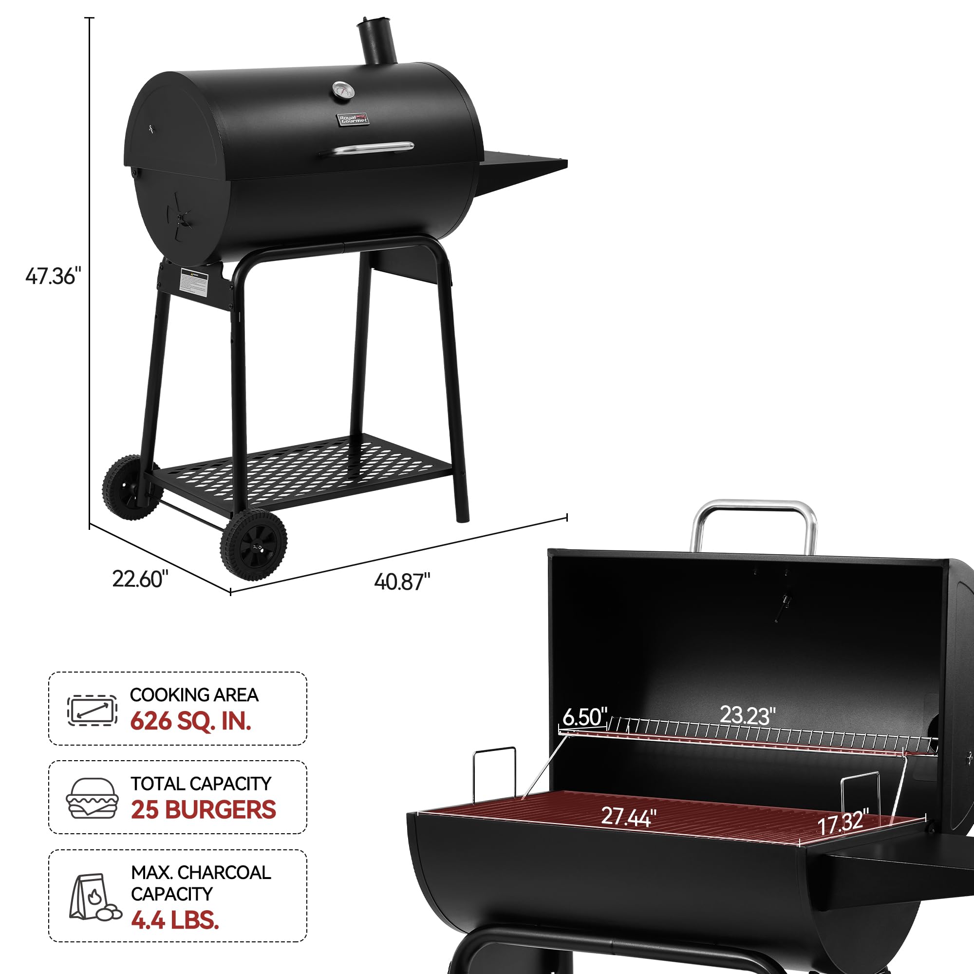 Generous Cooking Area: This charcoal grill offers a roomy 626 sq. in. cooking zone. It has 475 sq. in. porcelain-enameled steel wire cooking grates and an 151 sq. in. chrome-plated steel wire warming rack. You can easily cook large pieces of meat all at once, perfect for big family BBQs or gatherings