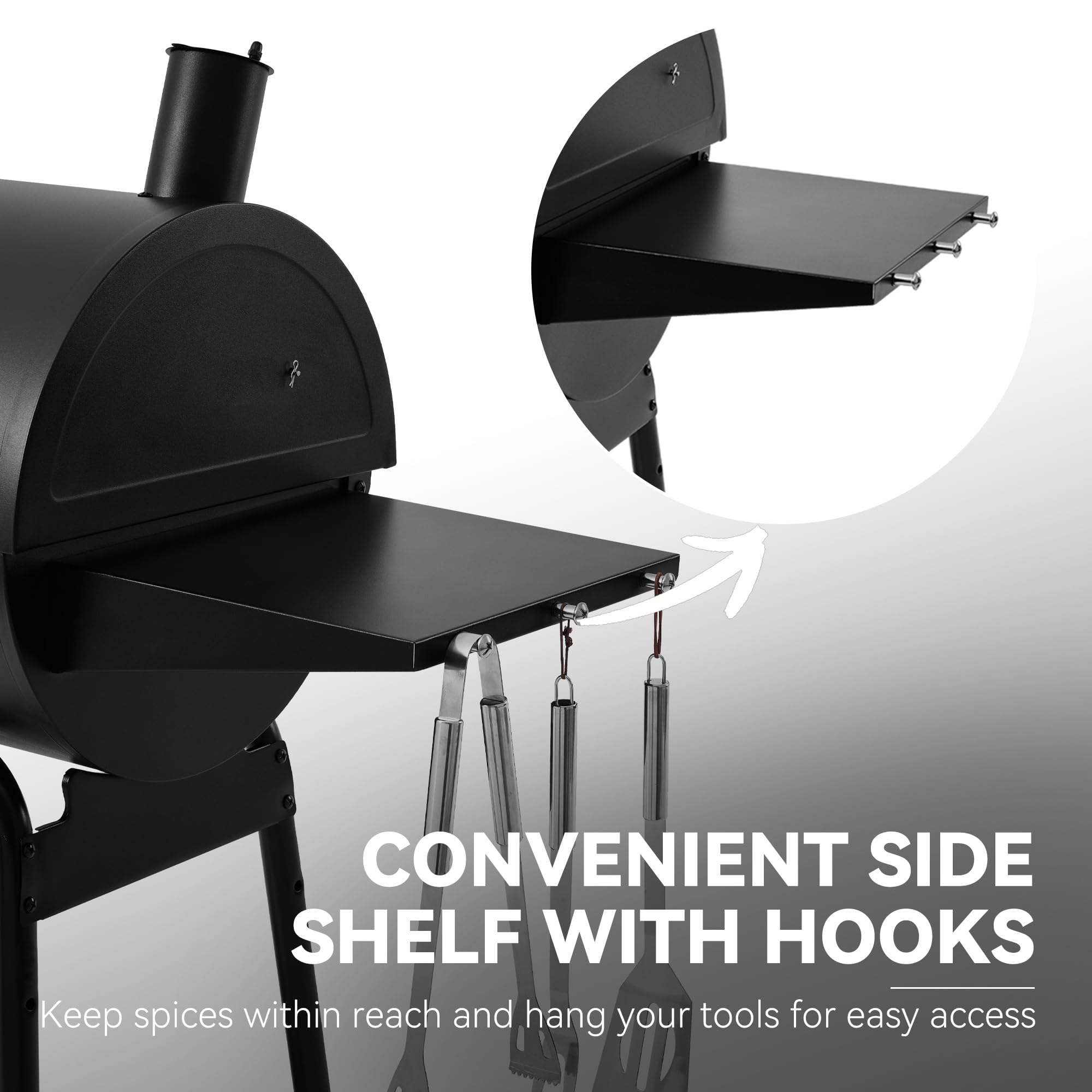 Side Shelf with Hooks: The grill side shelf provides ample space for storing spices, tools, and other essentials, giving you room to organize everything you need for a smooth grilling experience. Integrated hooks allow you to easily hang your grilling utensils